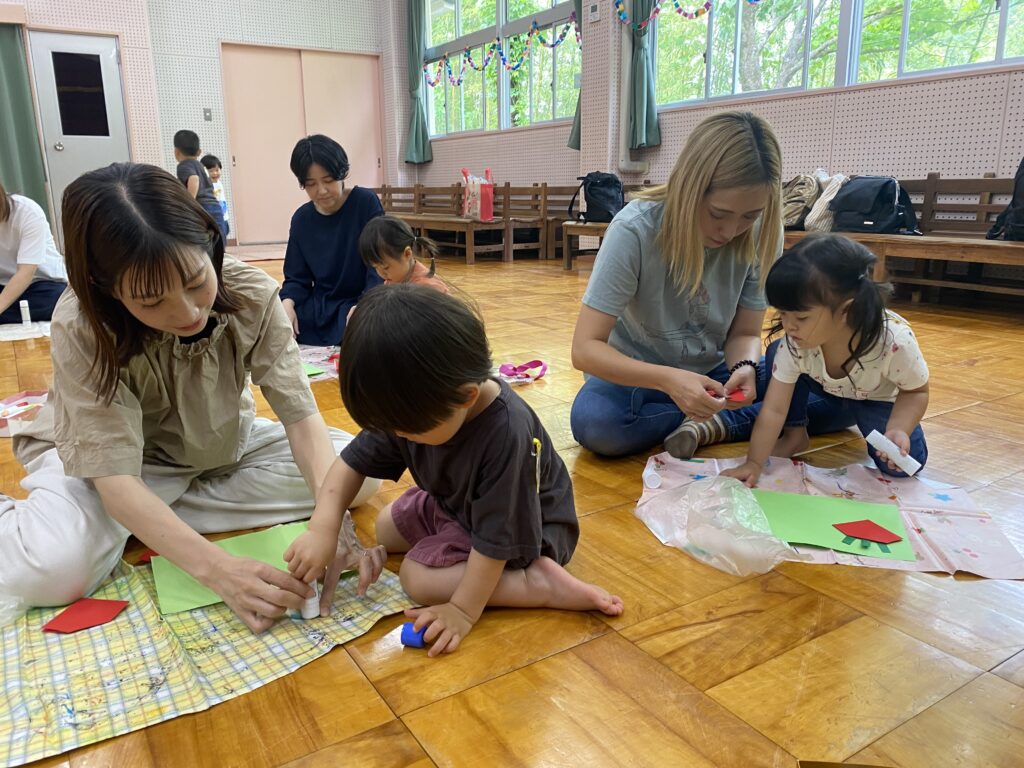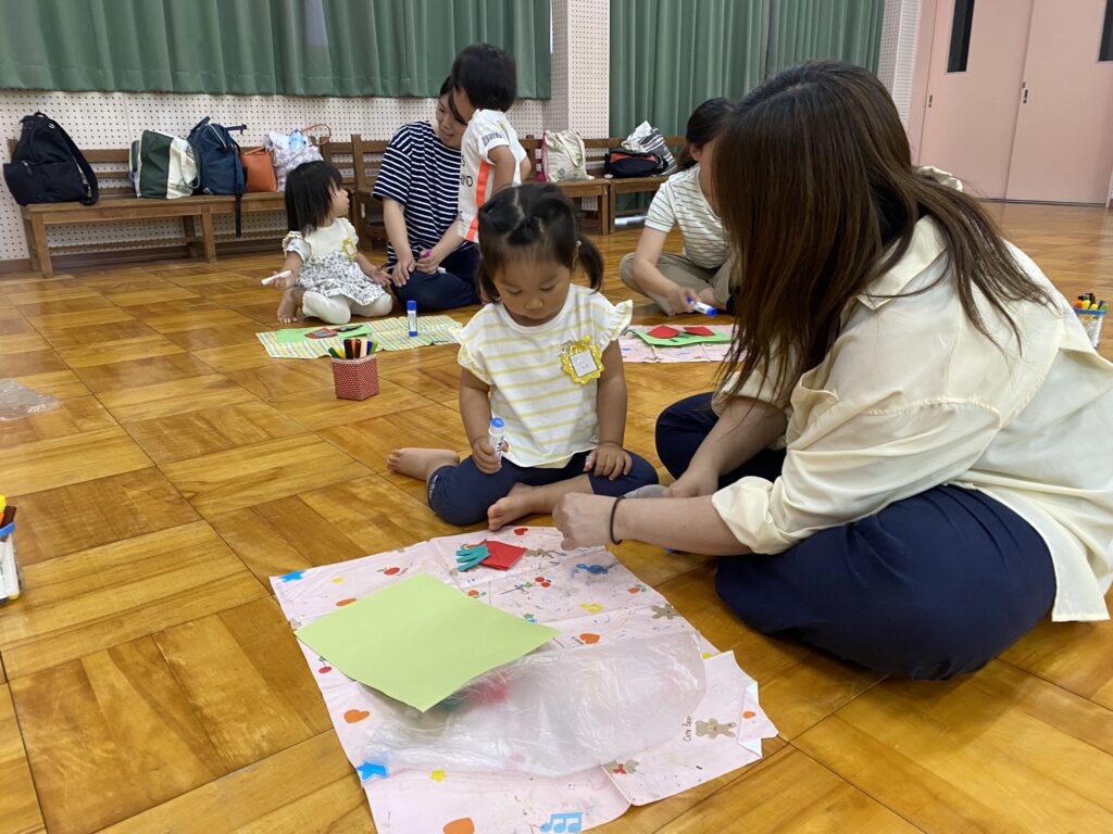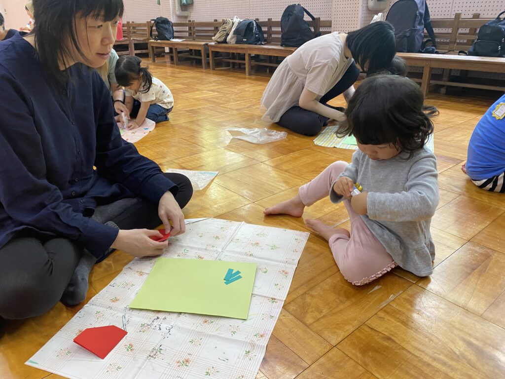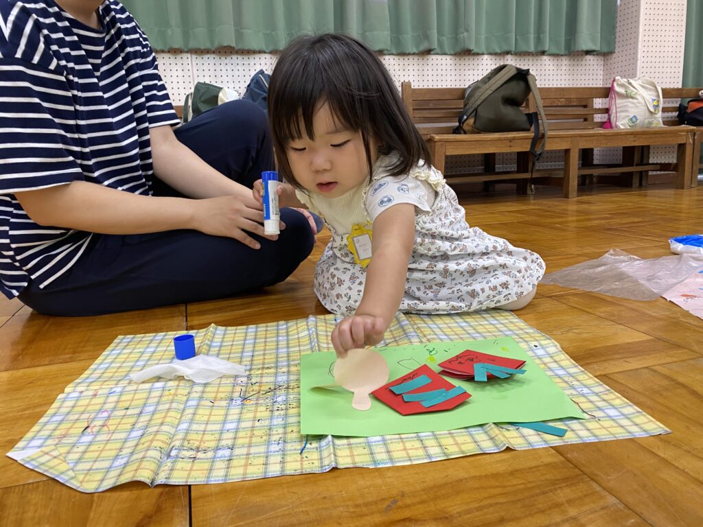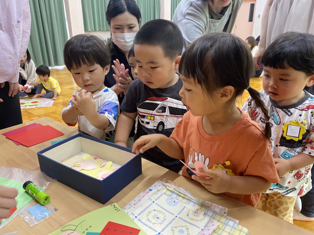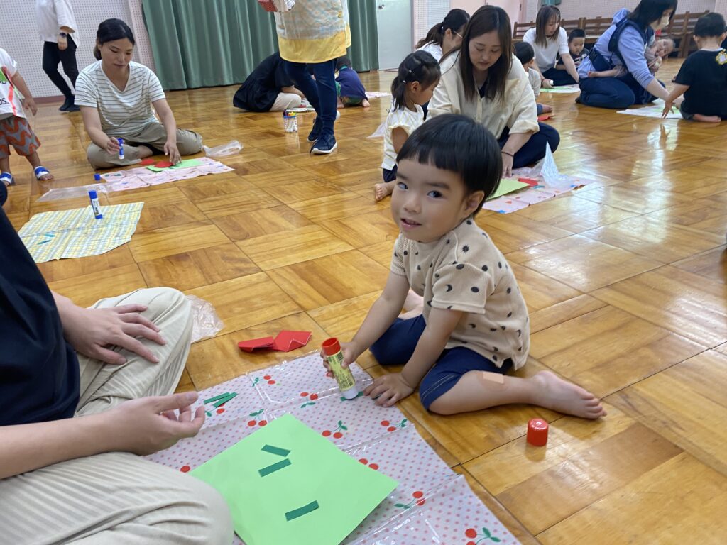 制作を始めると、折り紙を頑張ってきれいに折ったり、シートの上で自分でのりを持って各パーツに上手に塗って貼ったりすることができました!お母さんに見守ってもらい、【できた!】の気持ちを大切に製作を楽しみました♪いちごをもう一つつけたり、動物をつけたり、いちごのタネや周りに絵を描いたりして完成すると、「できたよー!」と先生に見せに来てくれる子がたくさんいました(^^)/お家でお父さんたちにも見せてあげてくださいね。