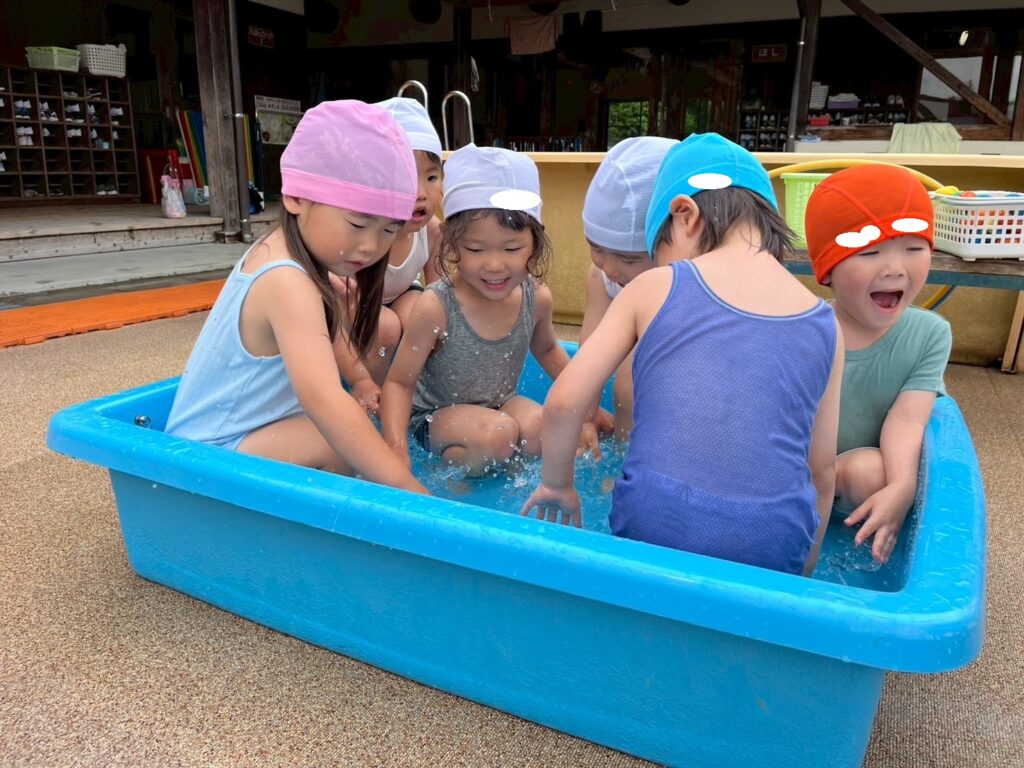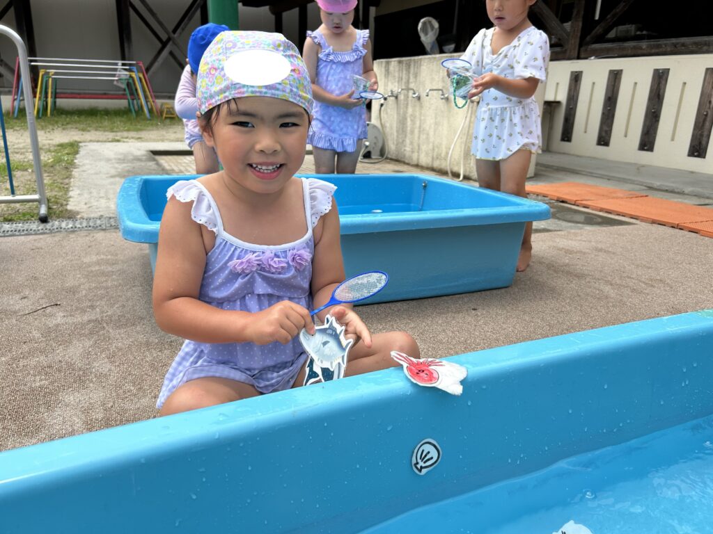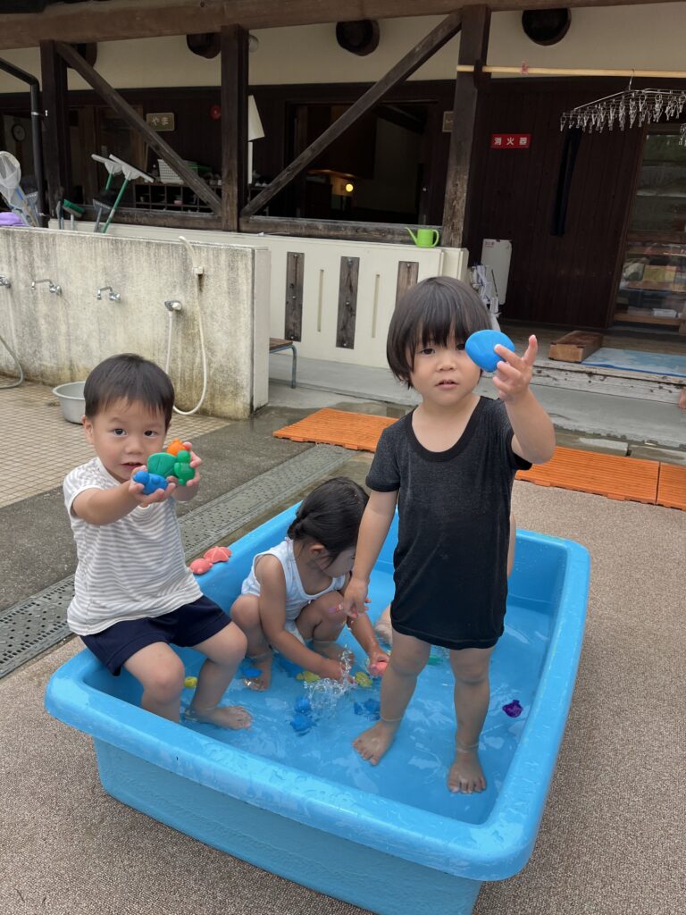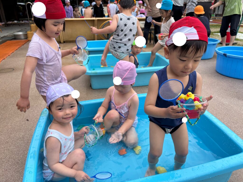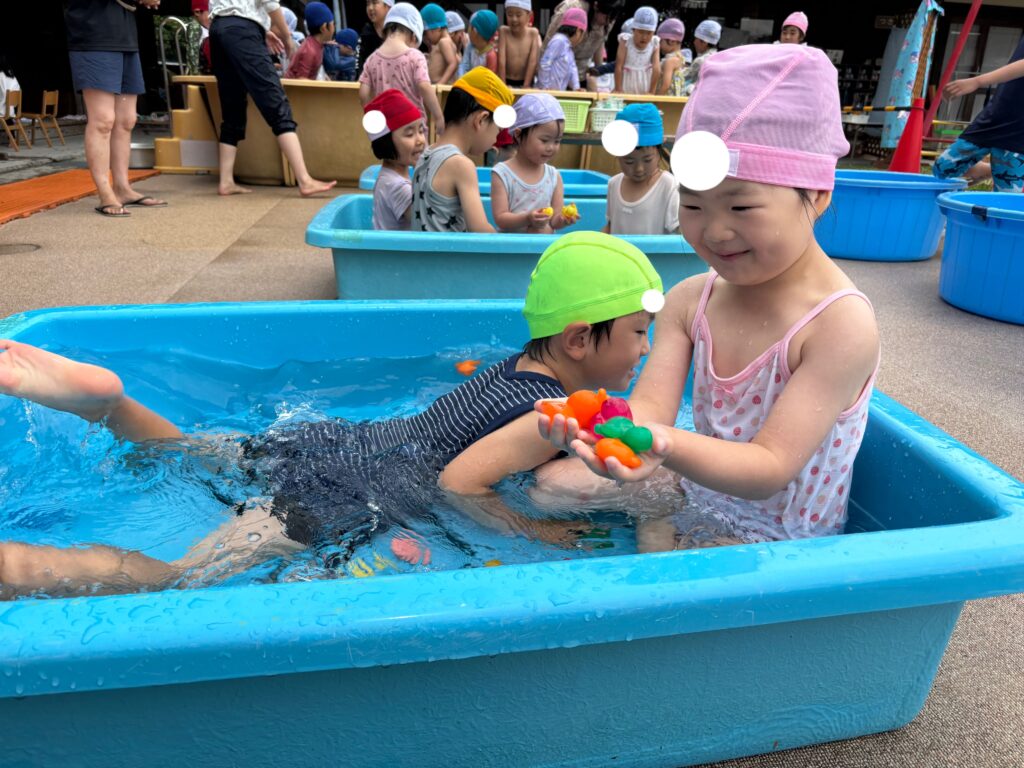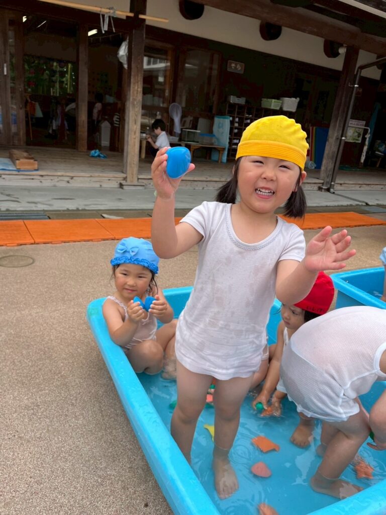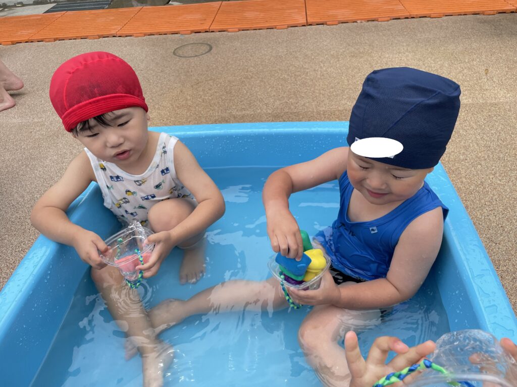 友達とくるくるプールの中を歩いてみたり、キラキラの宝石やお魚すくいなど好きなおもちゃで遊んでみたり、水の心地よさを感じて、楽しんでいる子どもたちでした♪