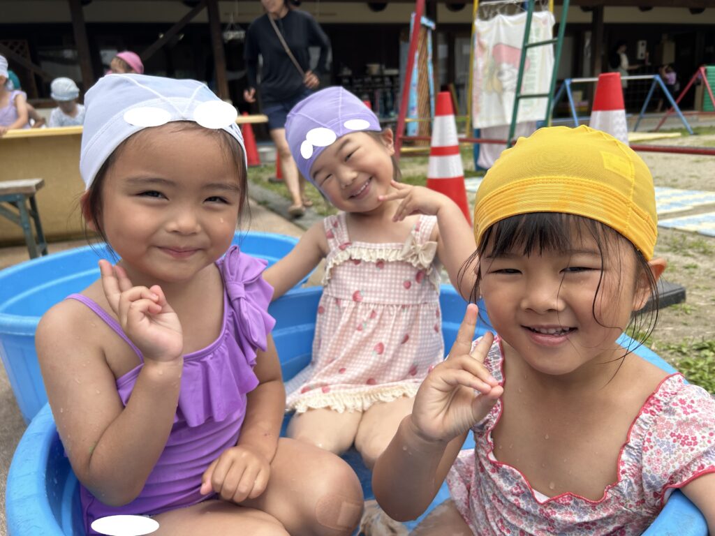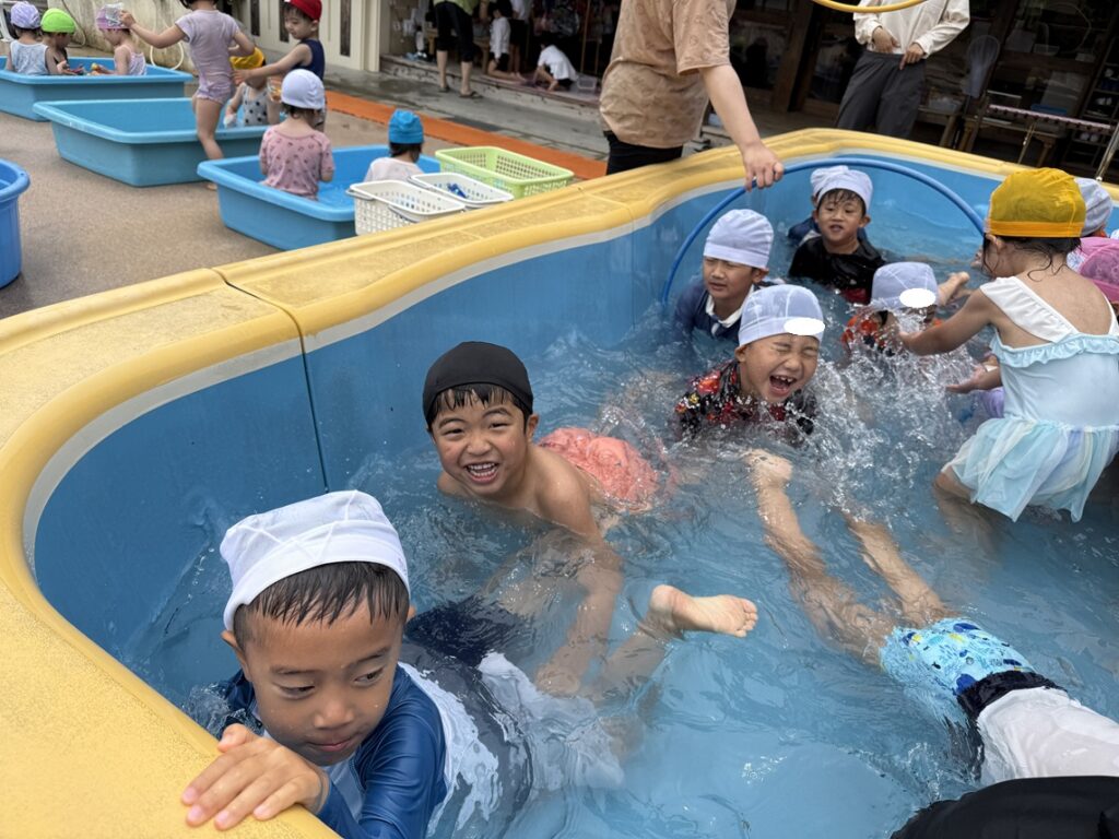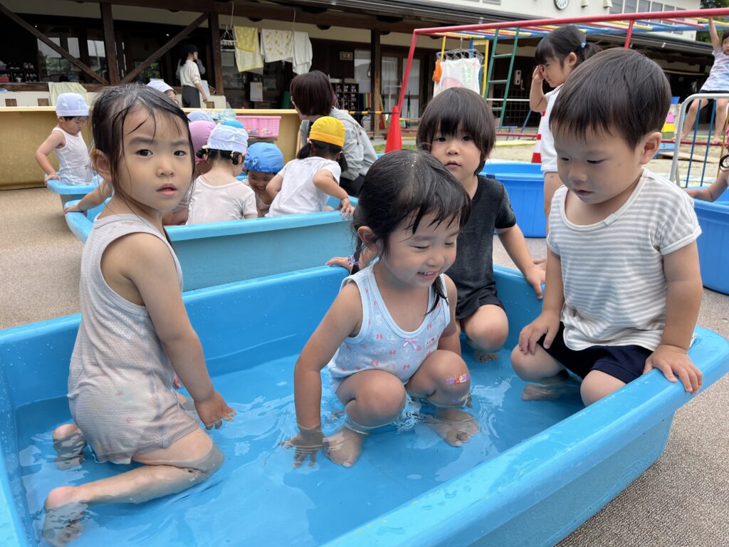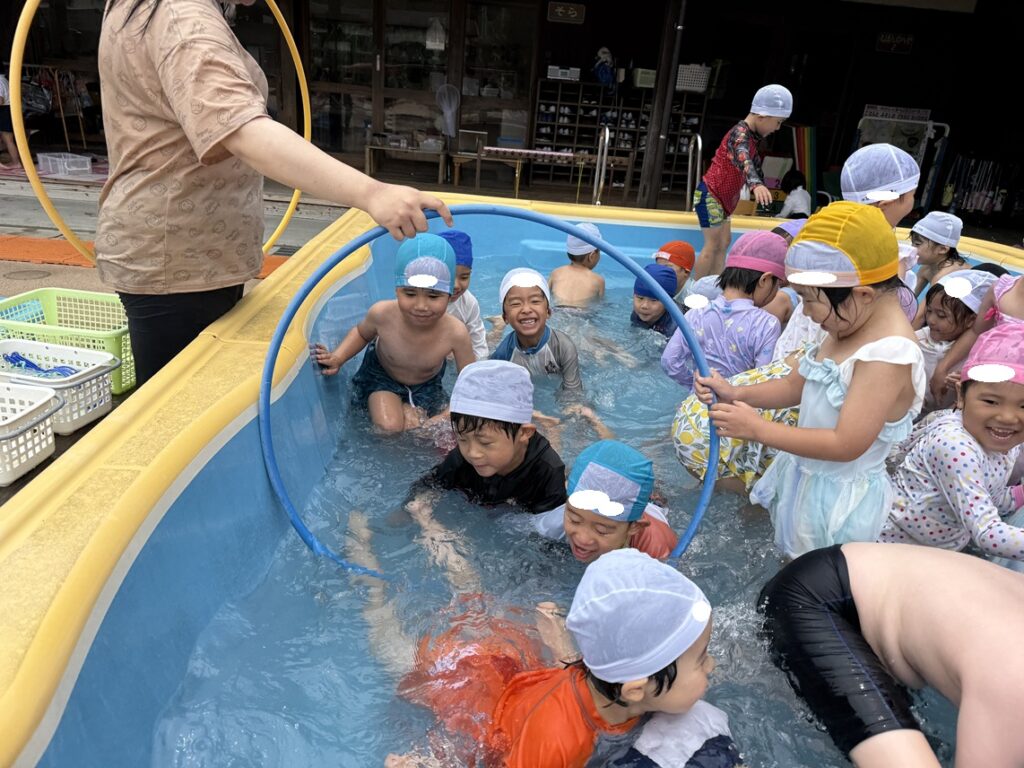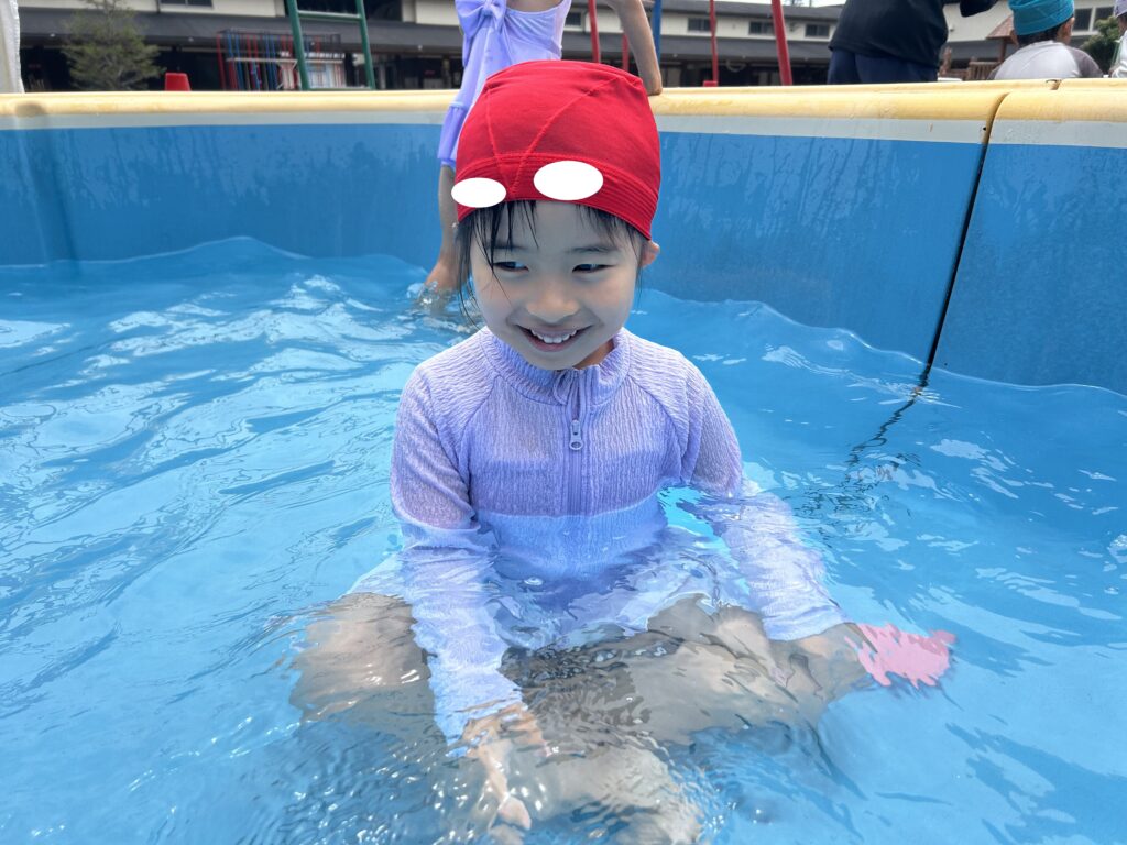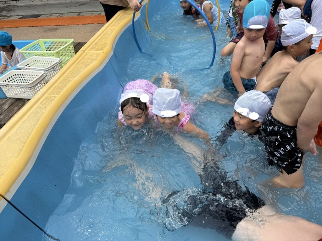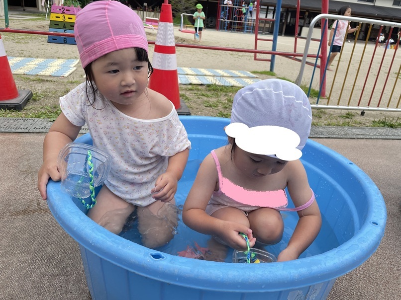 友達とくるくるプールの中を歩いてみたり、キラキラの宝石やお魚すくいなど好きなおもちゃで遊んでみたり、水の心地よさを感じて、楽しんでいる子どもたちでした♪
