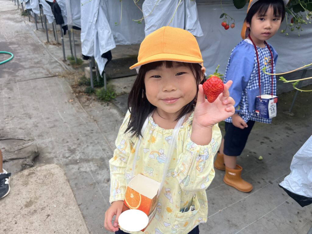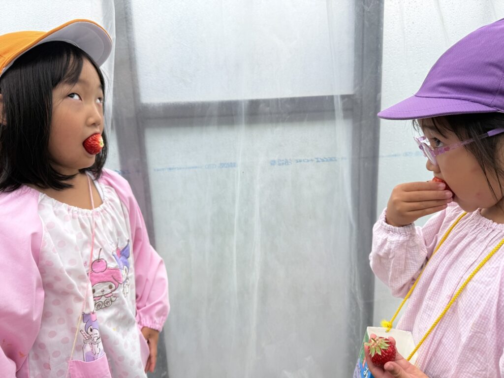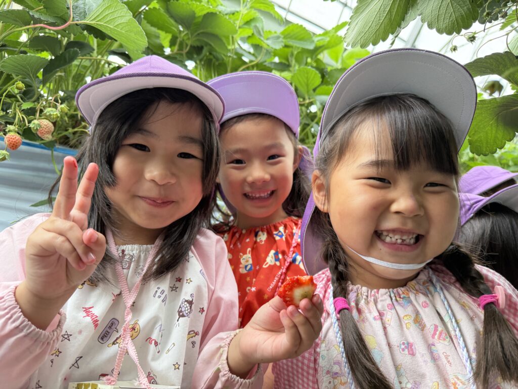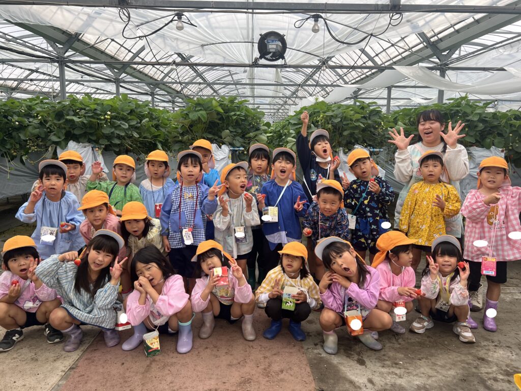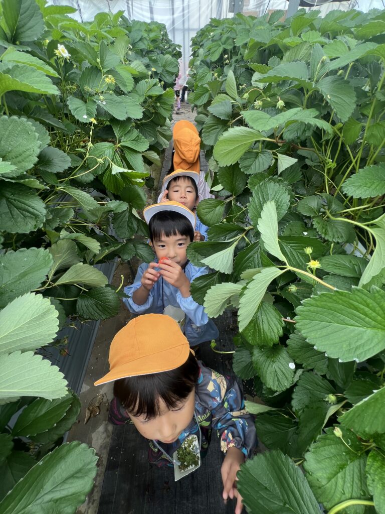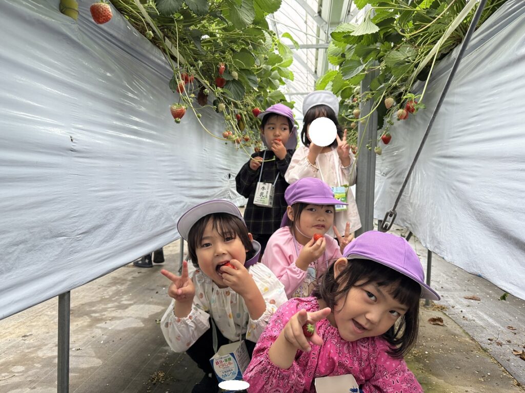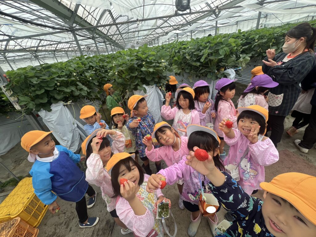 今年度も浅井農園さんにご協力いただきました!いちごクイズを楽しみながら、バスに乗って出発!!ビニールハウスの中に入ると、あまーい匂いが広がる中、まっかないちごがいっぱい!「どのいちごがいいかな?」と、よーく探しながら、お気に入りのいちごを食べました!甘くて大きないちごがいっぱいあったね!