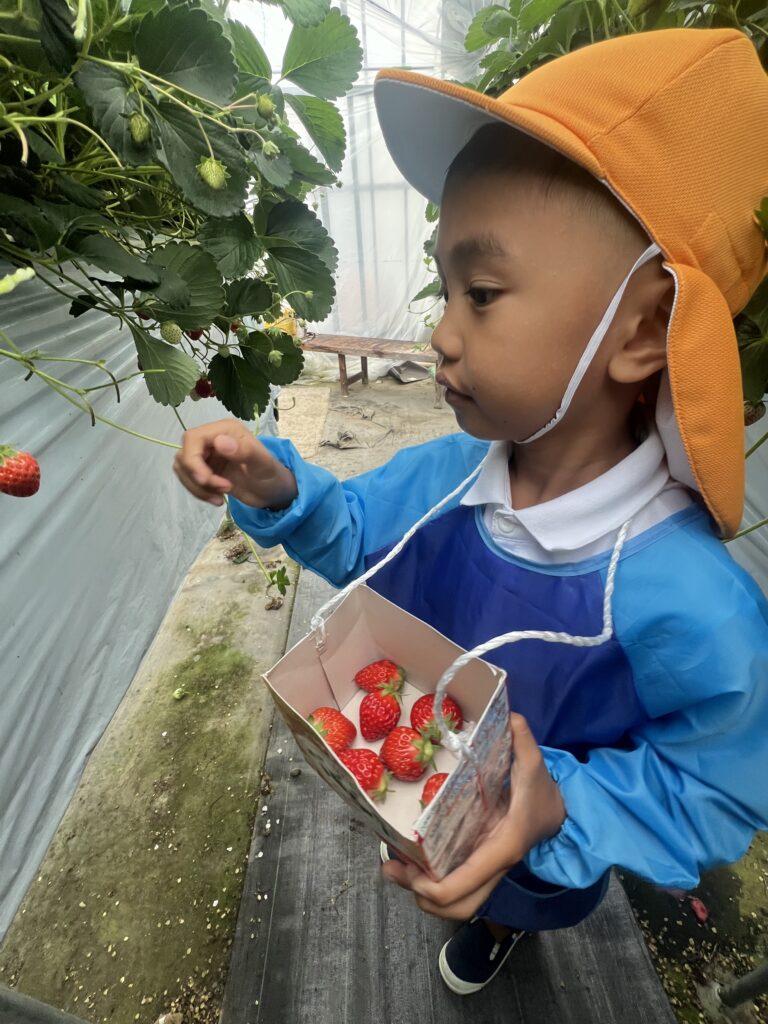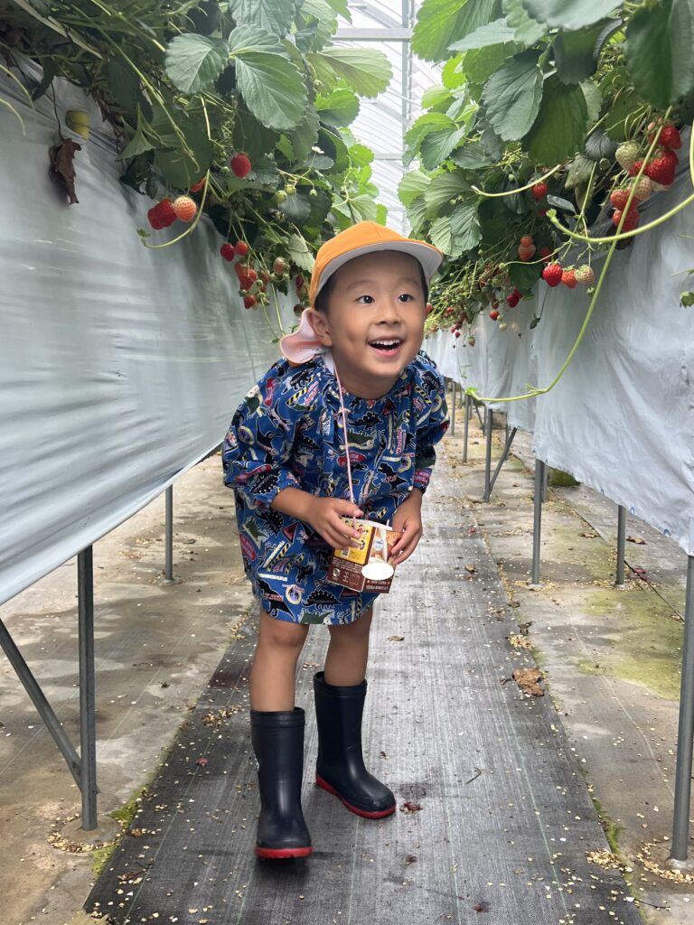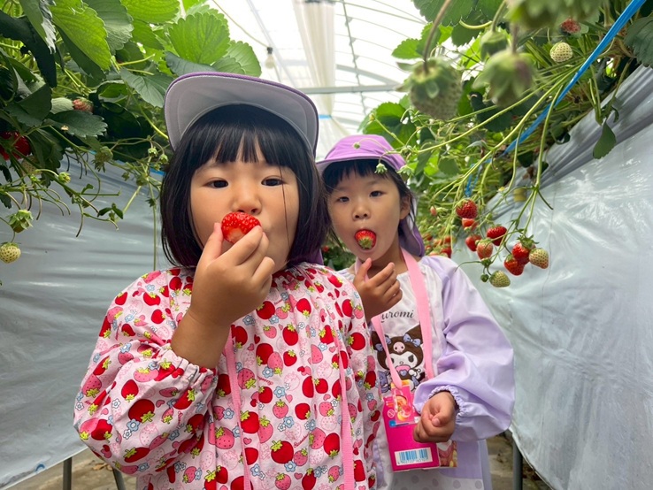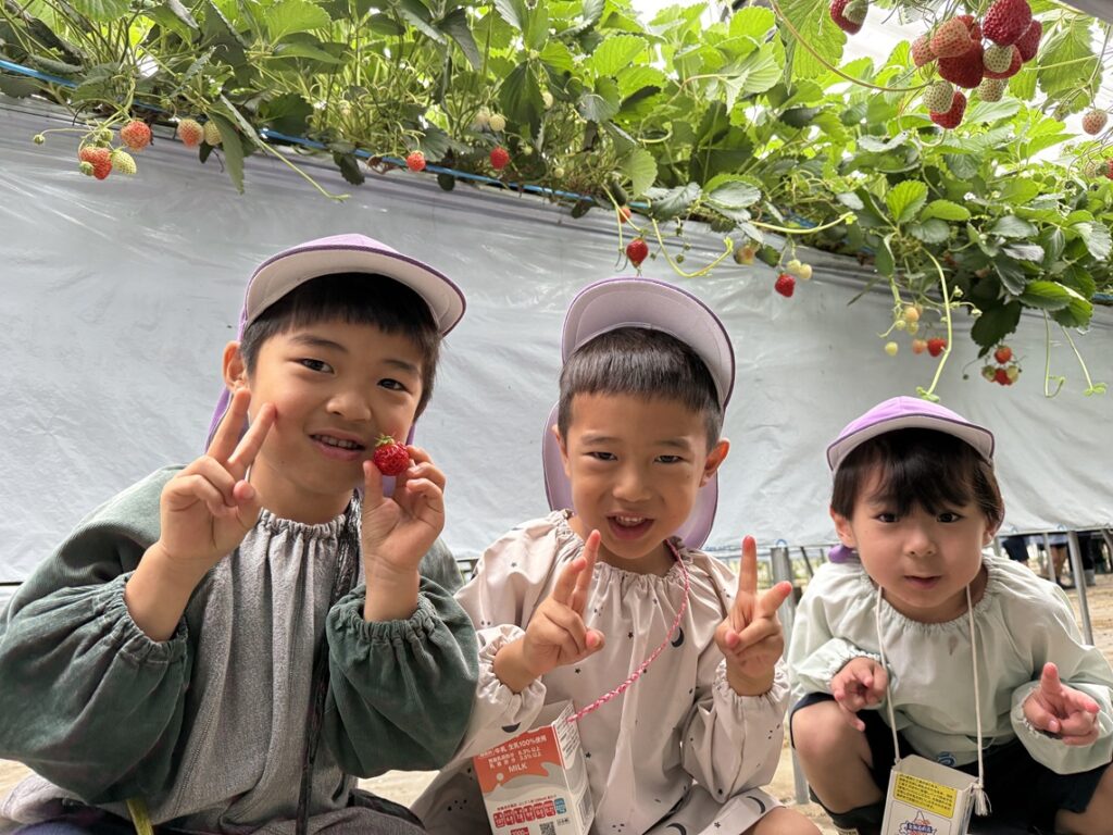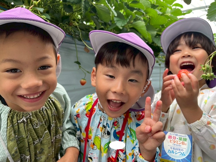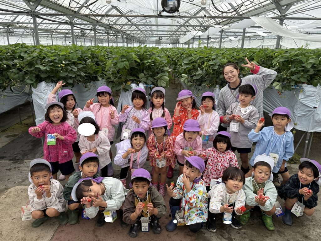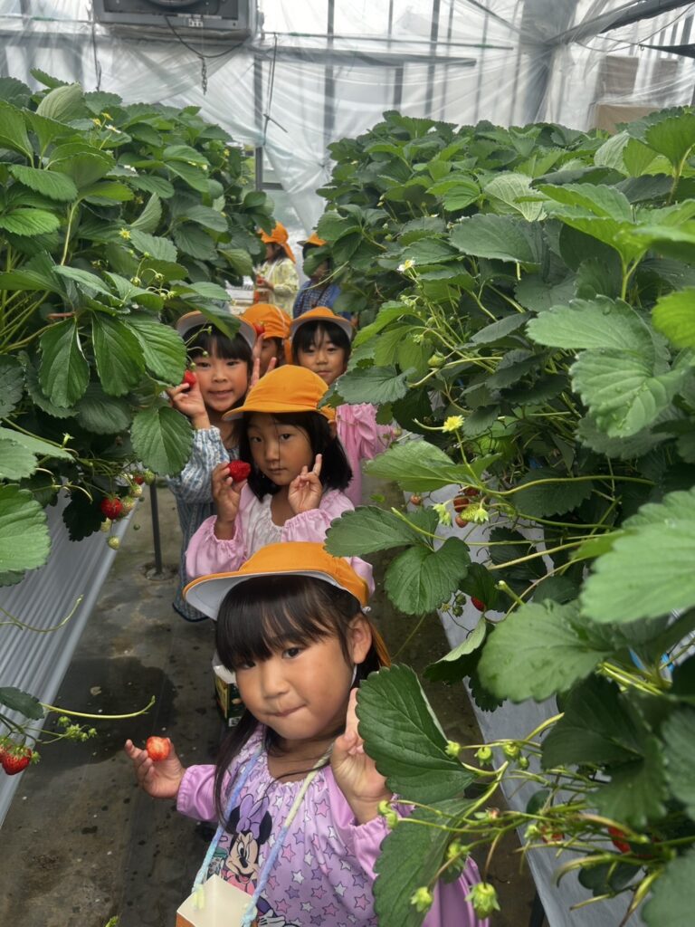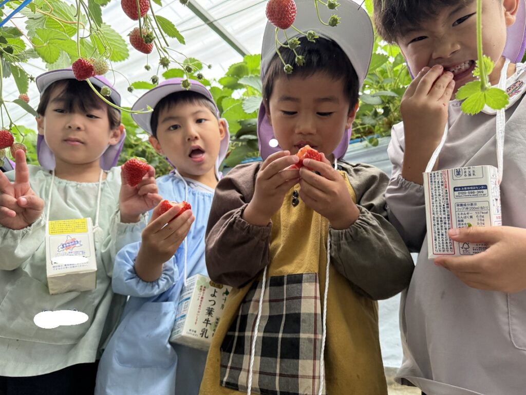 今年度も浅井農園さんにご協力いただきました!いちごクイズを楽しみながら、バスに乗って出発!!ビニールハウスの中に入ると、あまーい匂いが広がる中、まっかないちごがいっぱい!「どのいちごがいいかな?」と、よーく探しながら、お気に入りのいちごを食べました!甘くて大きないちごがいっぱいあったね!