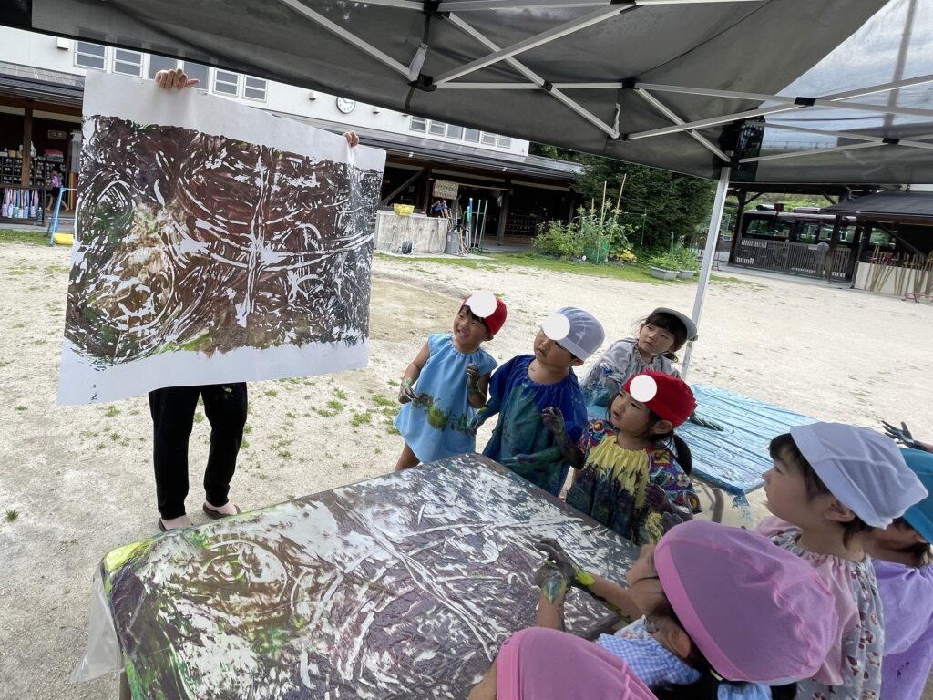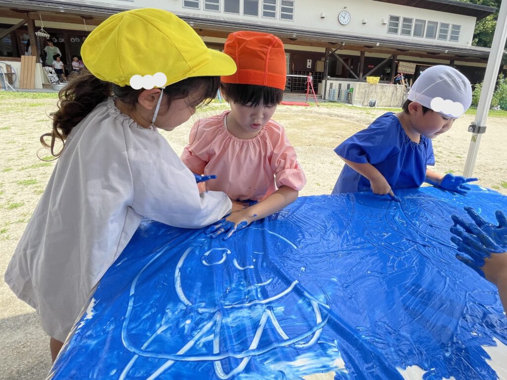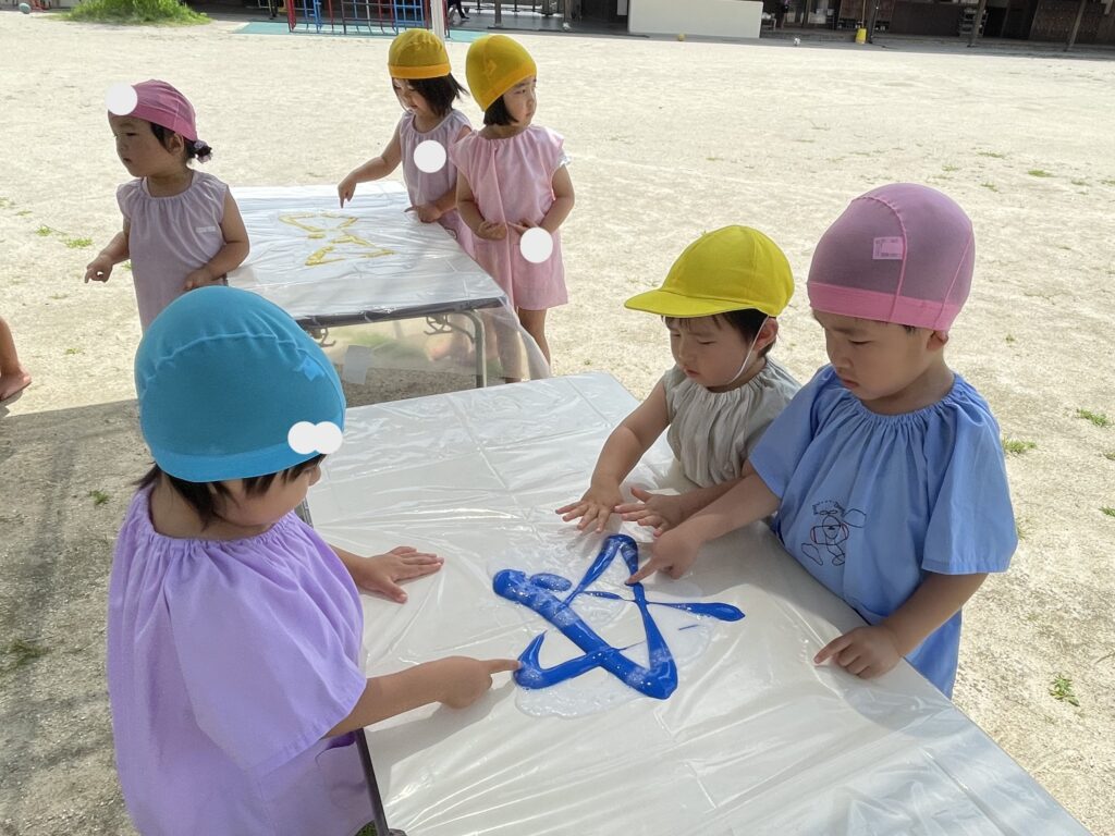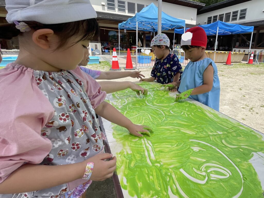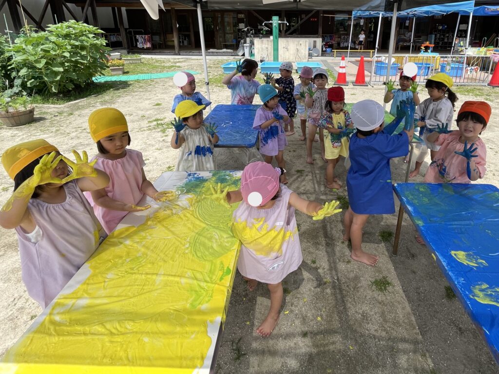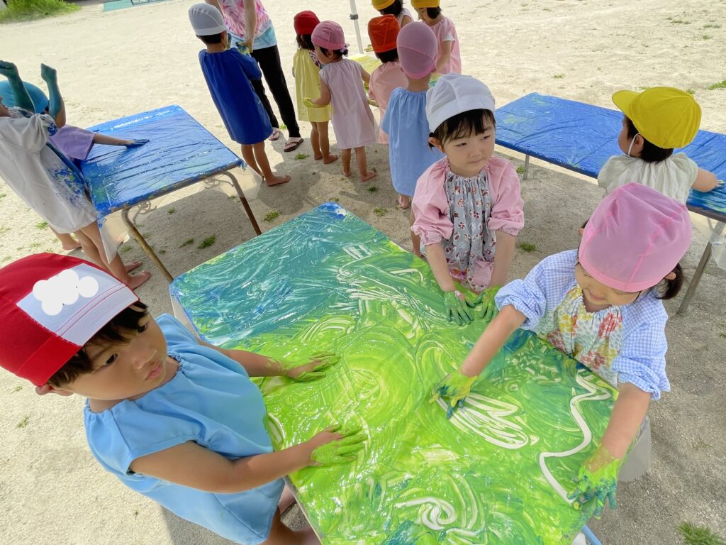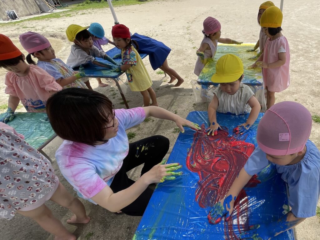 絵の具を前にした子どもたちは、はじめは、本当に手で触って良いのか、半信半疑な表情をしている子もいましたが、保育者や友達が指で絵の具を混ぜる様子を見て、真似するように、楽しむことができました。