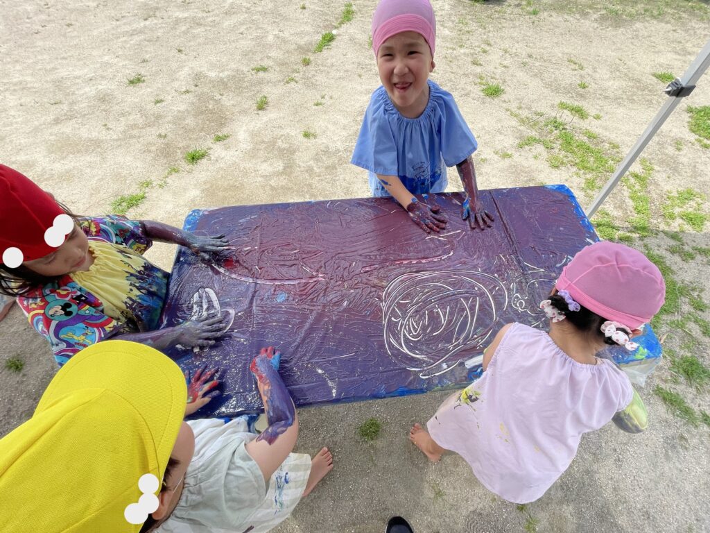 「ぶ~ん!」と言いながら線を描き、指を車に見立てて遊んだり、指で描いた絵を、手のひらを使って消して、また描く。このくり返しを、楽しんだりしました。また、絵の具でベタベタになった手で友達と握手をしながら、笑い合う姿などなど・・・絵の具の感触を味わいながら、イメージを膨らませて遊びました。