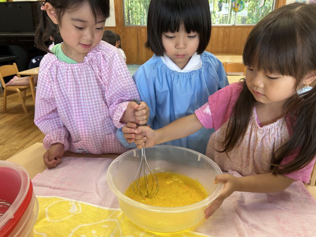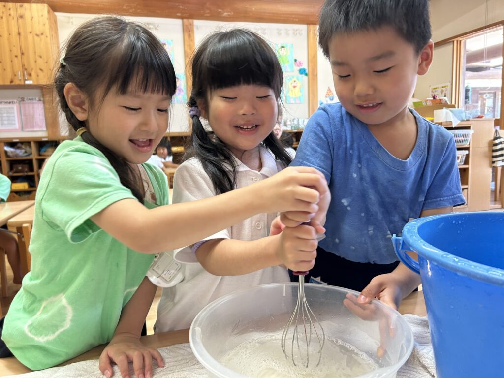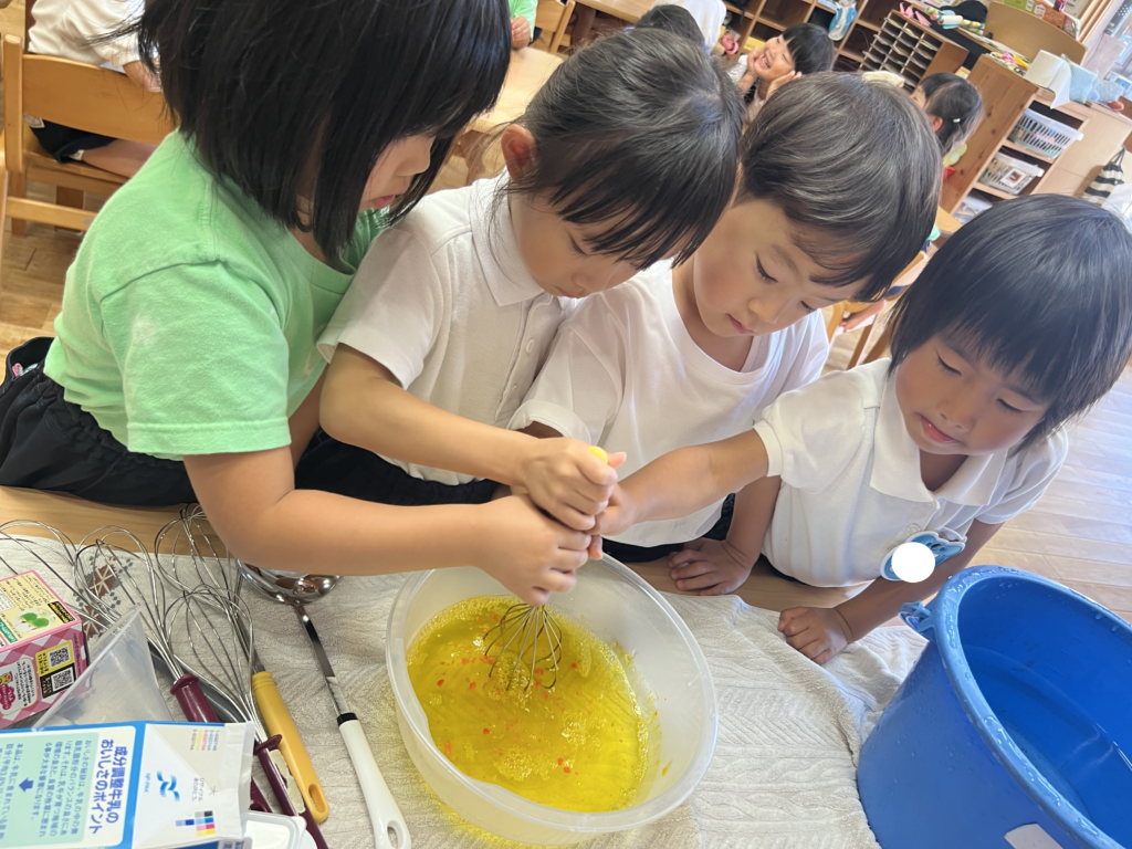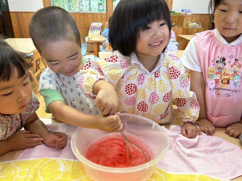 前日に、寒天の素と食紅とお湯を混ぜて寒天を作りました!食紅は、赤・黄・緑の3色を用意し、子どもたちが色を混ぜたり、色の濃さを決めたりして、鮮やかなオリジナルの寒天ができました♪