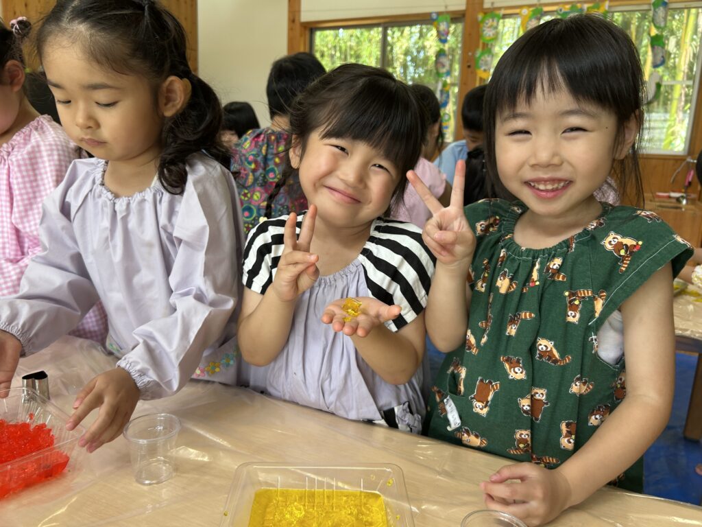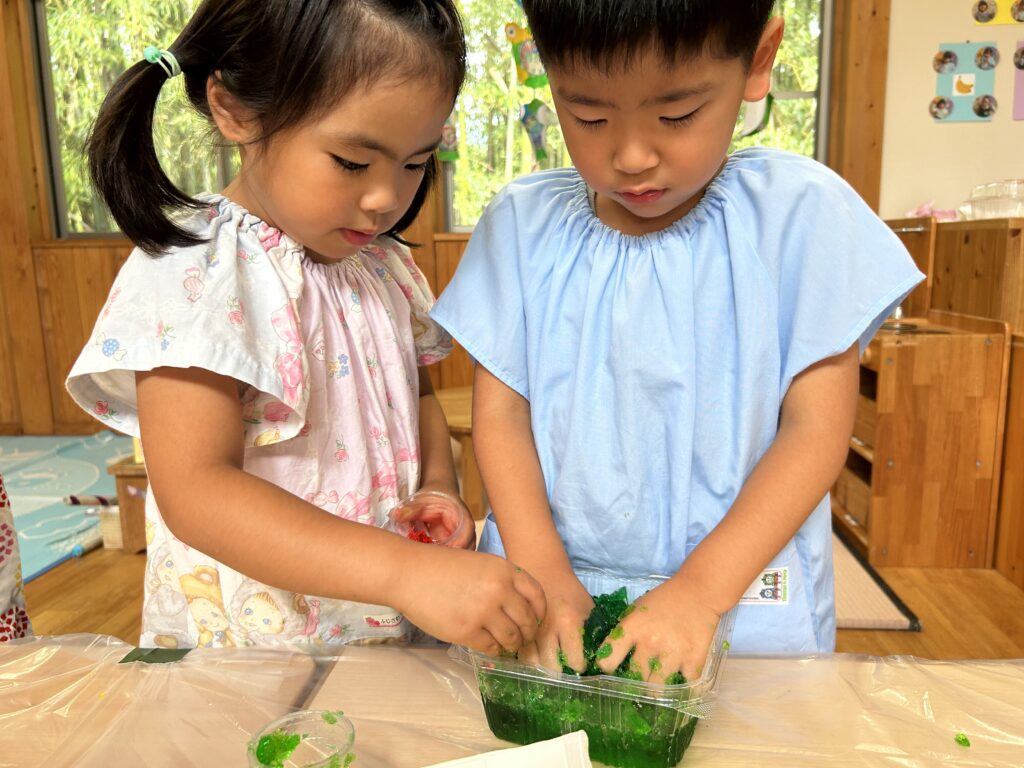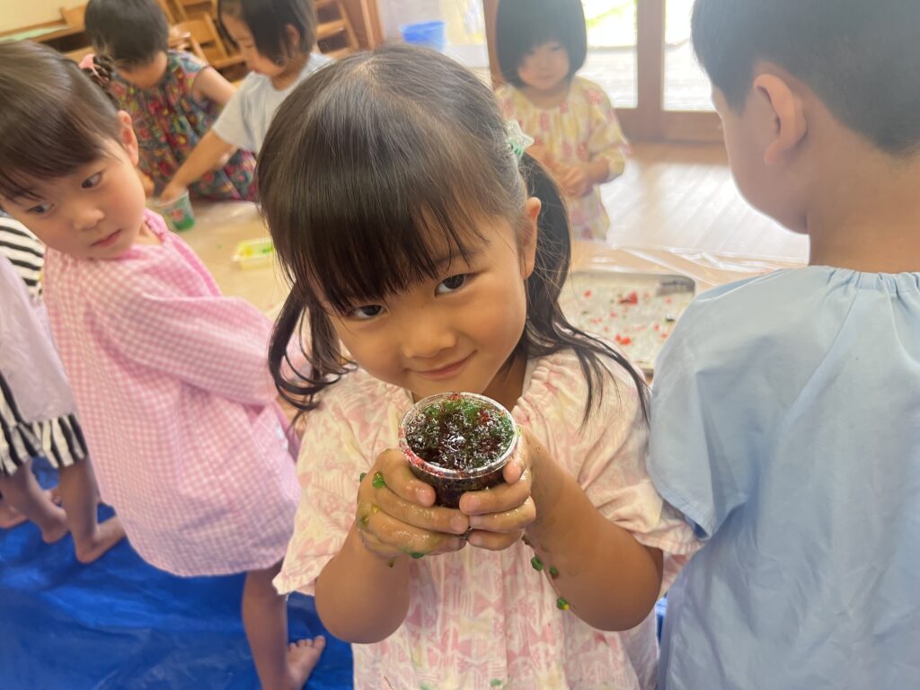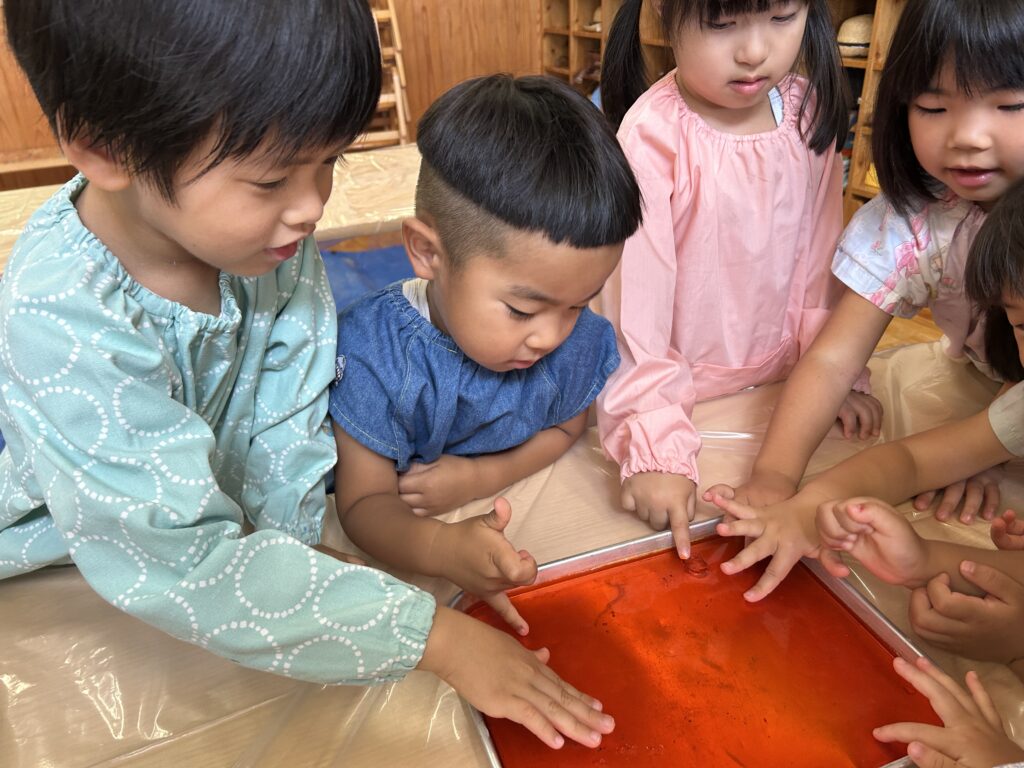 色とりどり寒天に興味津々の子どもたちは、指で触ってみると「ぷるぷるだ~!」「ゼリーみたいだね!」と寒天の感触を味わい楽しみました(o^―^o)
