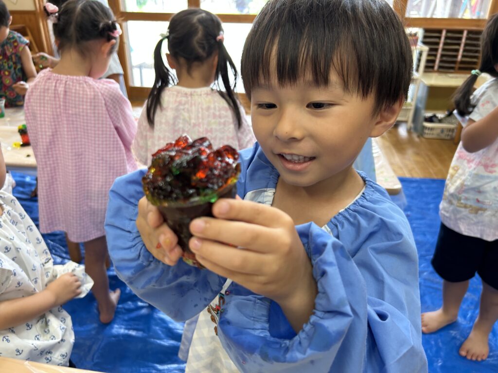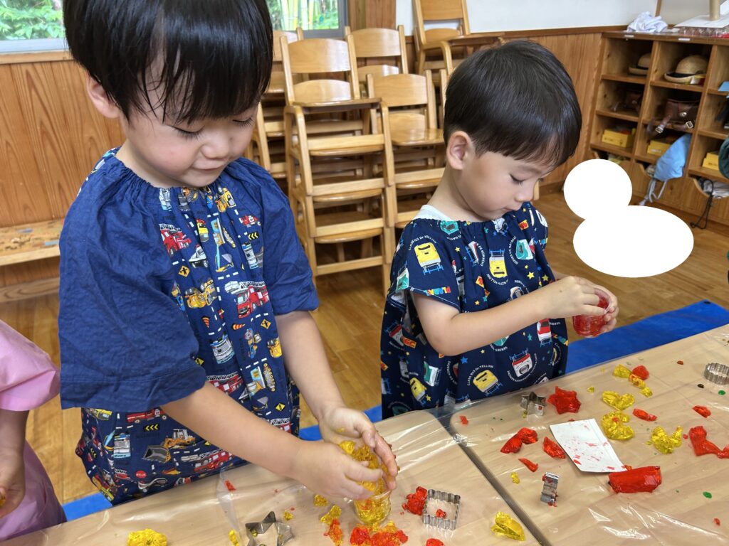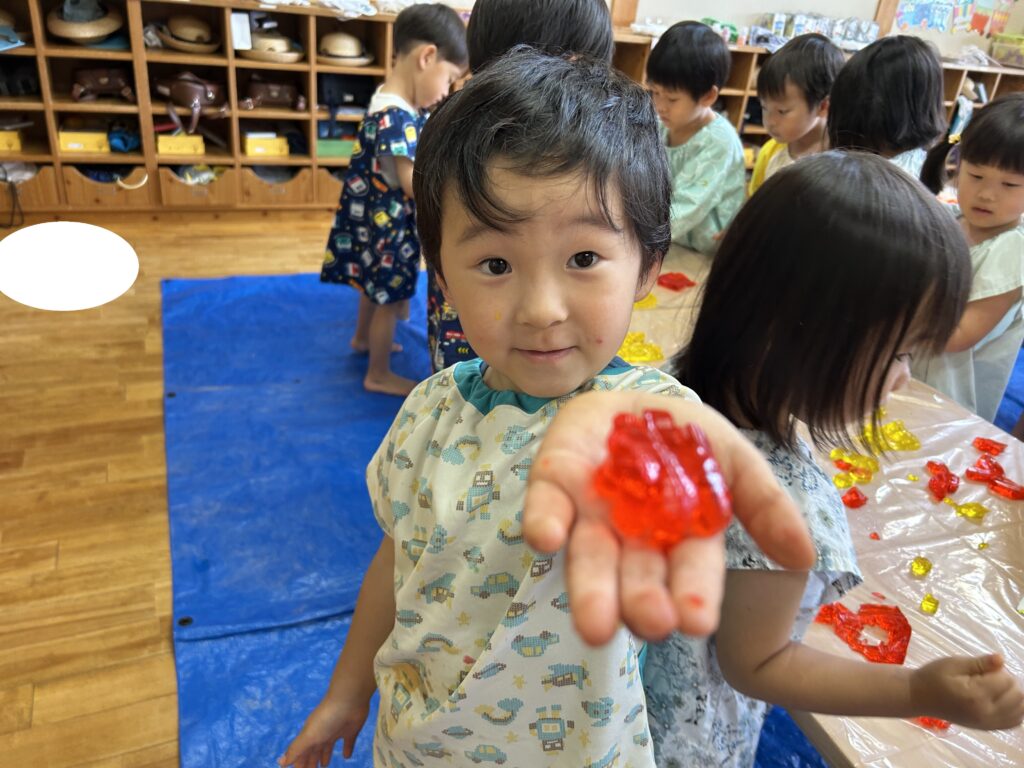 型抜きを使ってハートや星形などを型をとって宝石にしたり、カップに寒天を入れてパフェに見立てたりと色々なアイデアがあり、思い思いに楽しく遊ぶことができました!