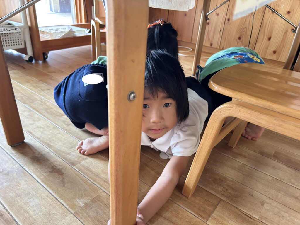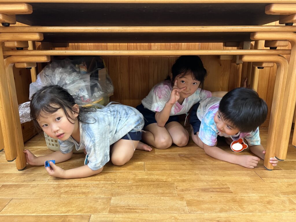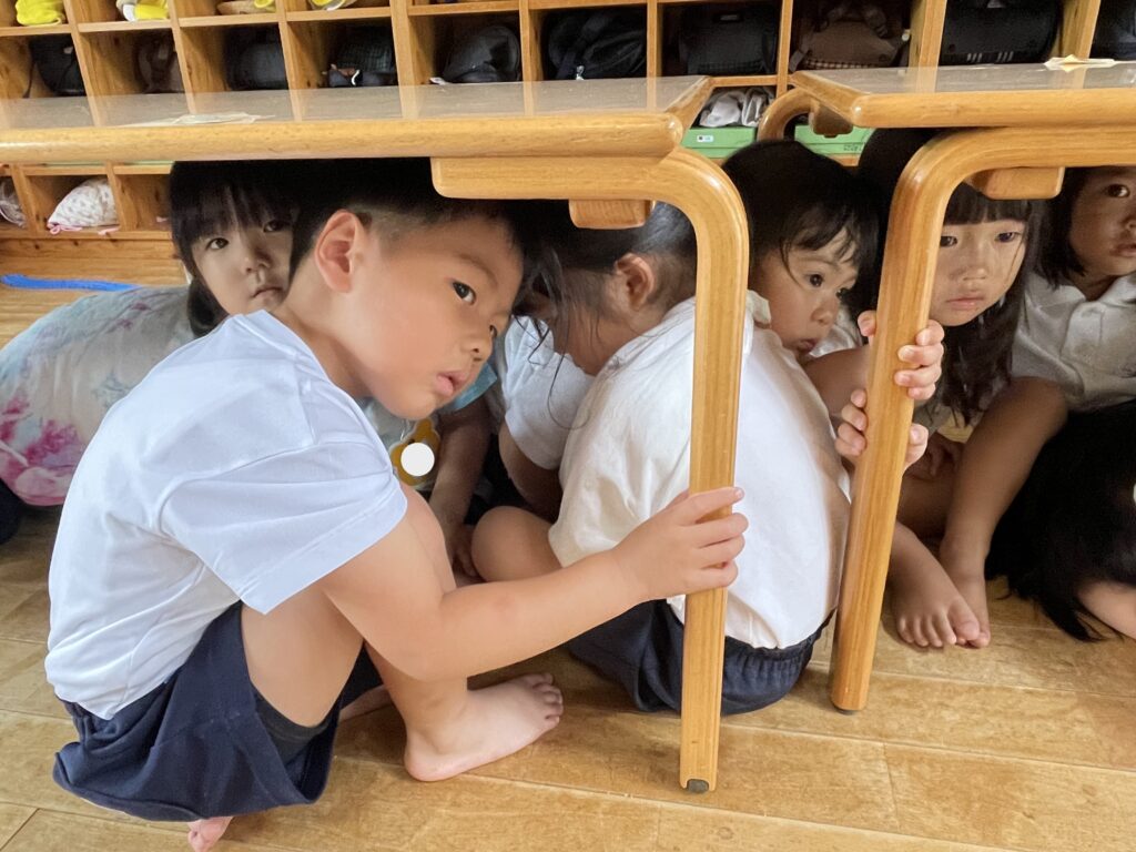 今年度3回目の避難訓練を行いました(2回目は予告なく行いました)。今日は雨だったため、室内で机の下に潜る練習のみしましたが、放送をよく聞いて真剣な表情で取り組むことができました。
