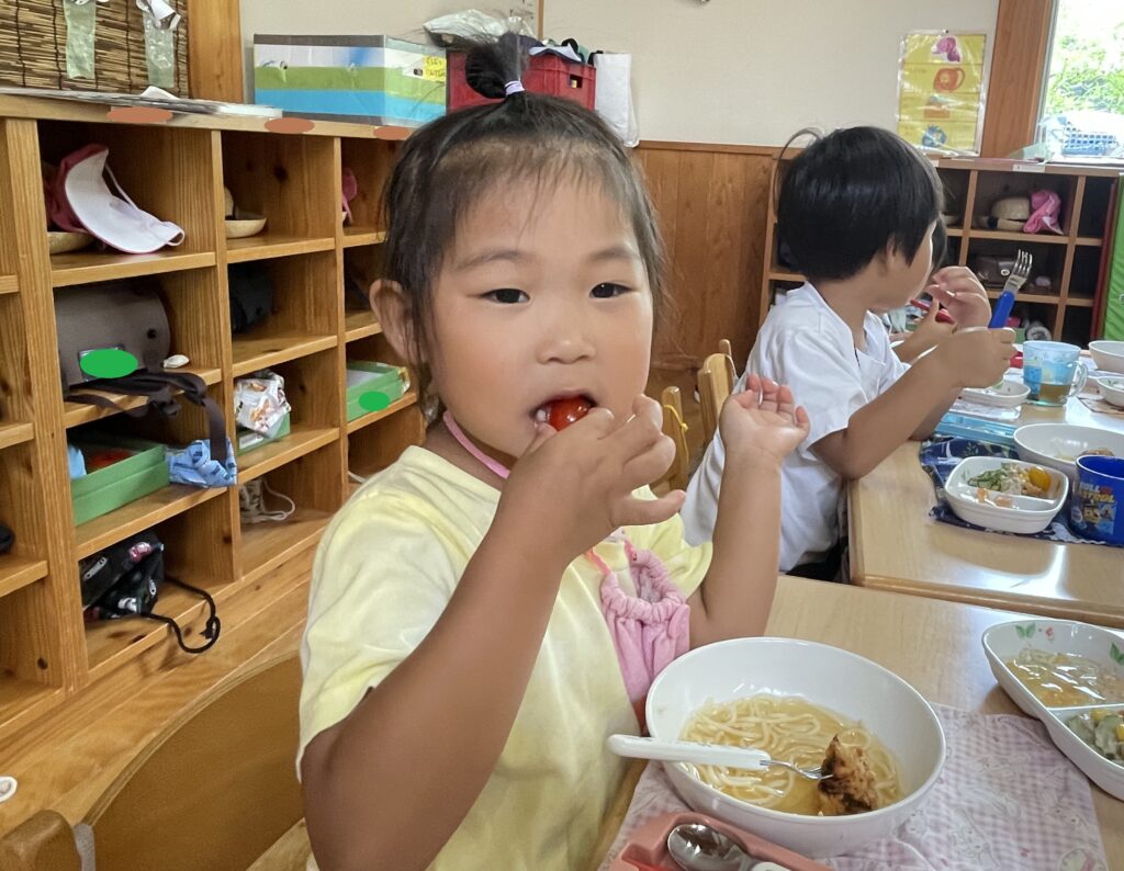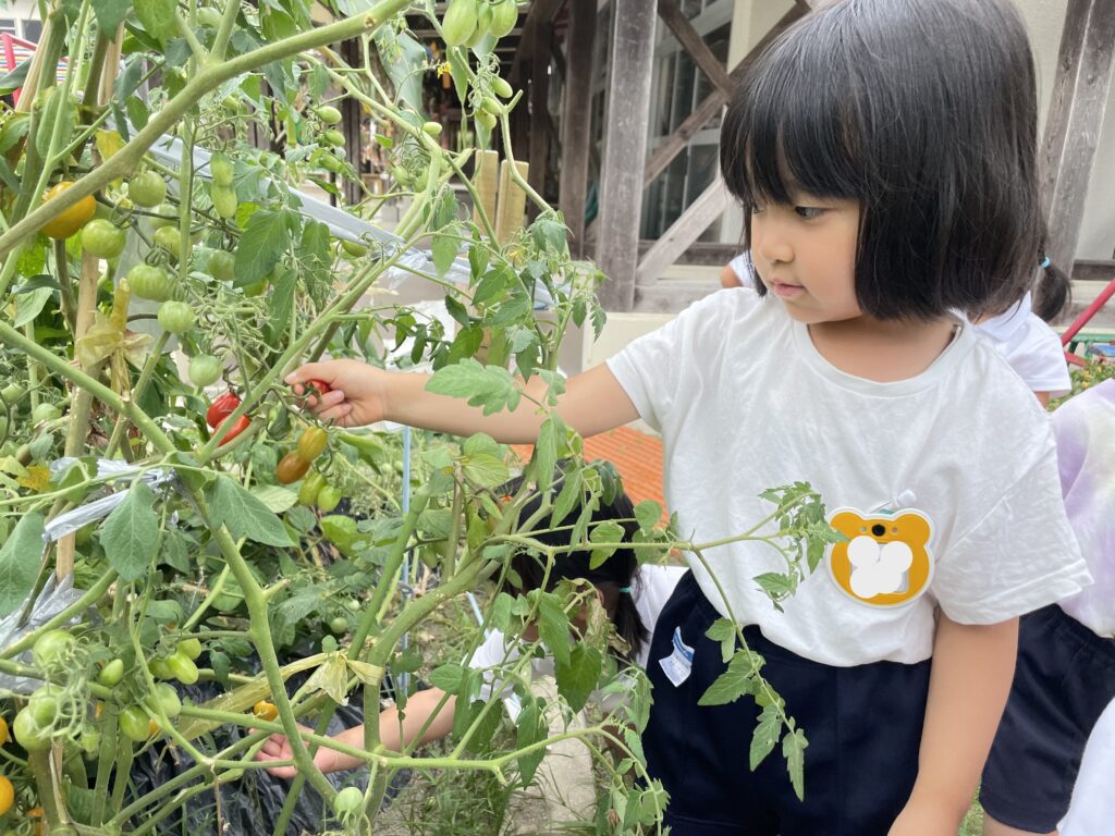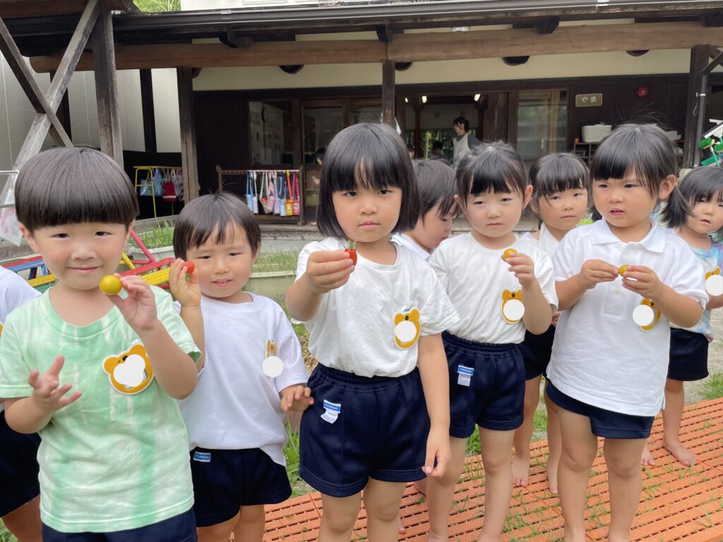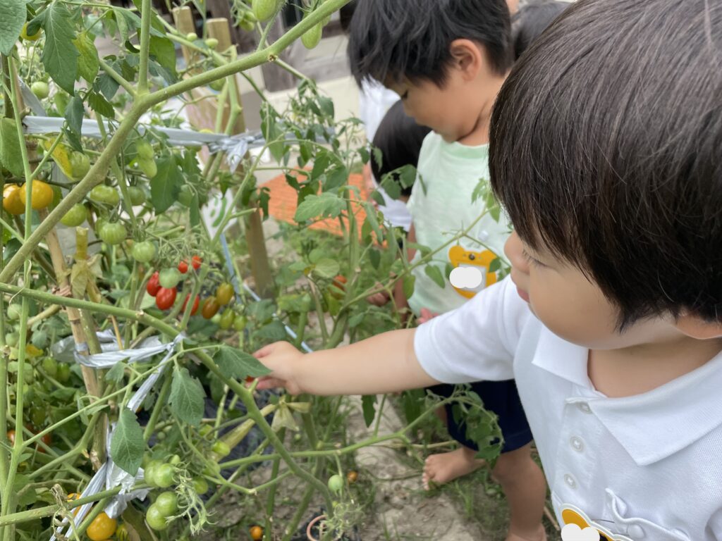 年中さんが大切に育てたミニトマトを子どもたちと収穫して食べました。トマトが苦手な子もいましたが、舐めてみたり、匂いを嗅いでみたりしました。
