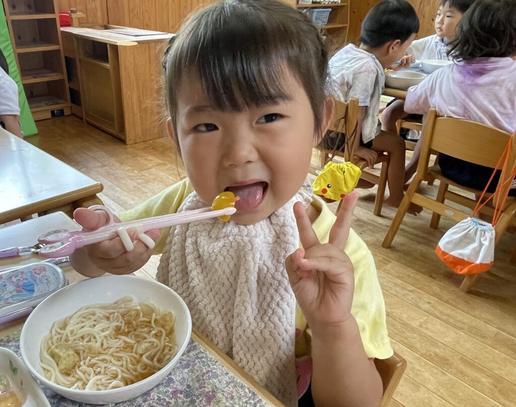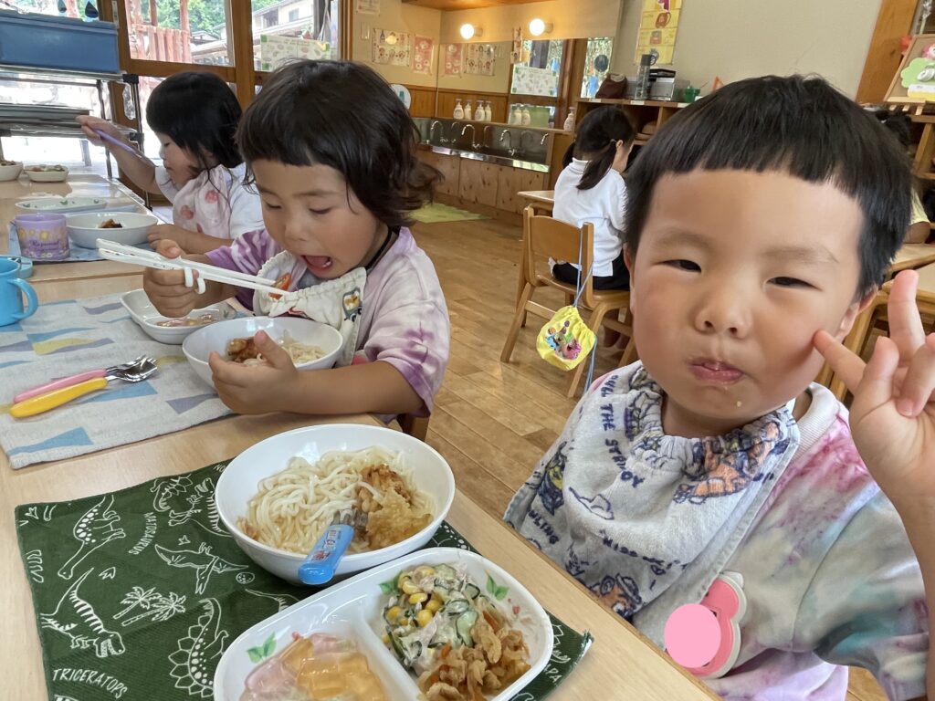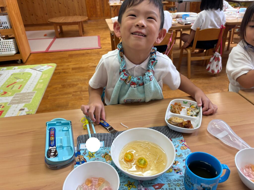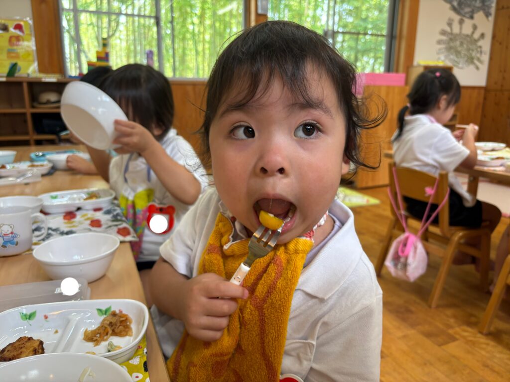 年中さんが大切に育てたミニトマトを子どもたちと収穫して食べました。トマトが苦手な子もいましたが、舐めてみたり、匂いを嗅いでみたりしました。