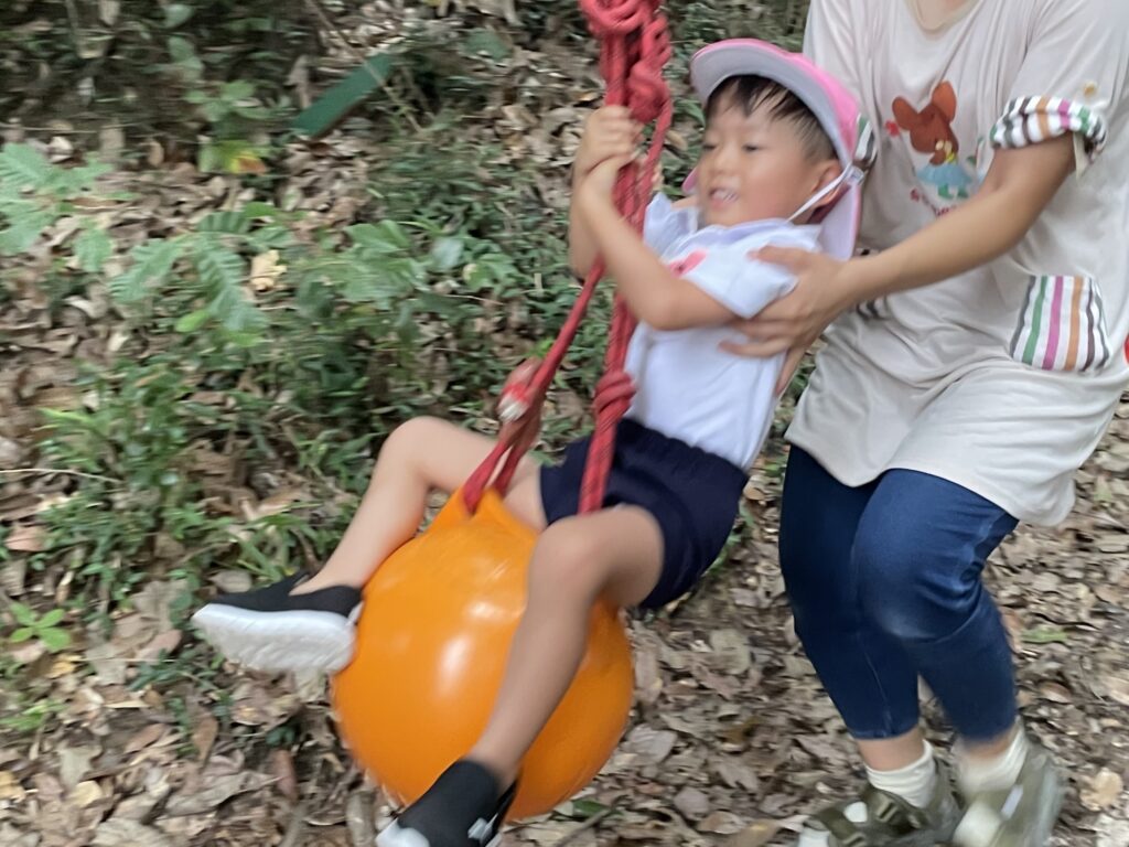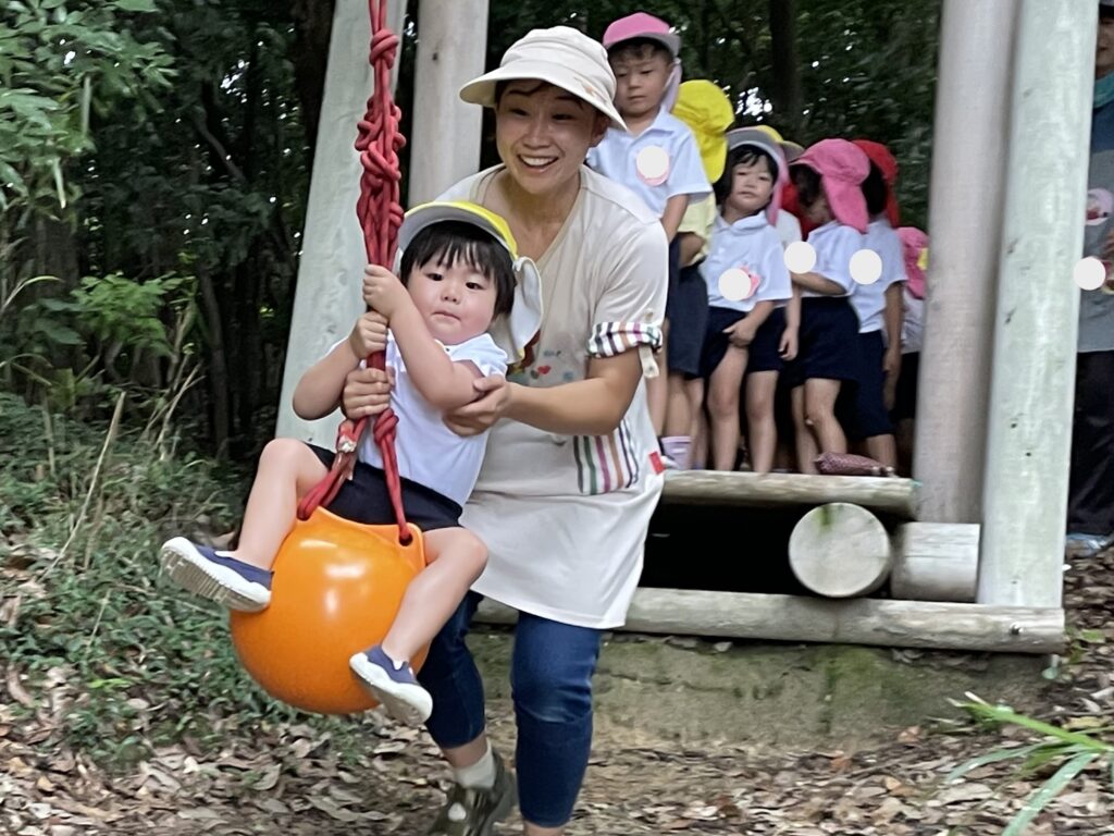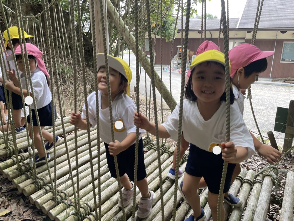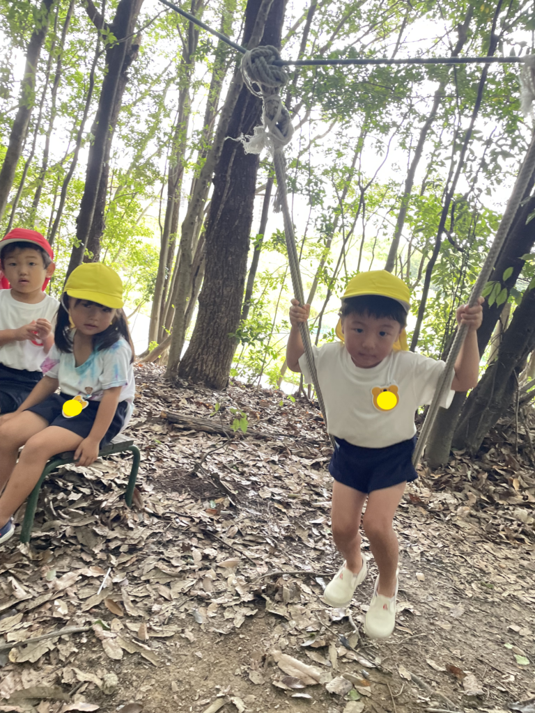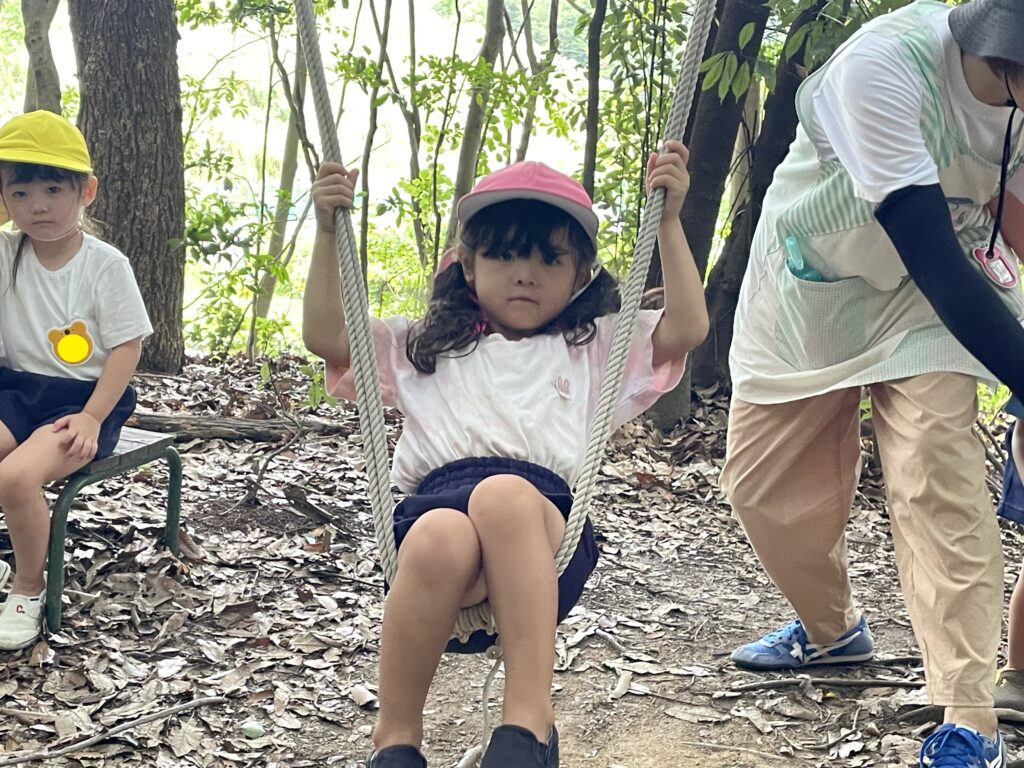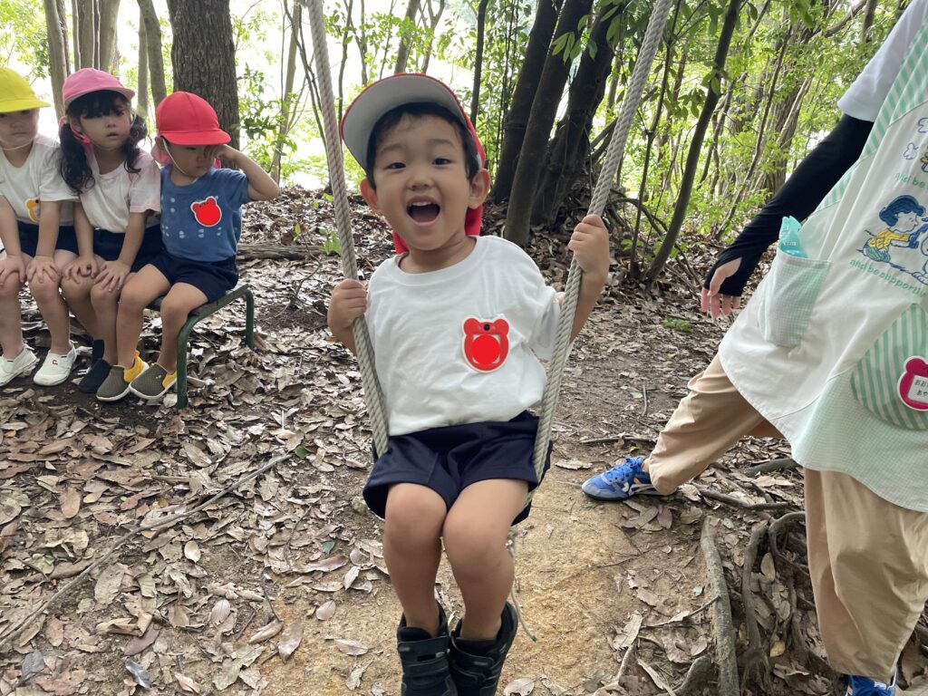 アスレチックの森に行き、ブランコやゆらゆら橋、ターザンロープなどをして遊びました。子どもたちに人気があったのはターザンロープでした!スピードがでるので、ロープをしっかり握りながら遊ぶことを楽しみました。