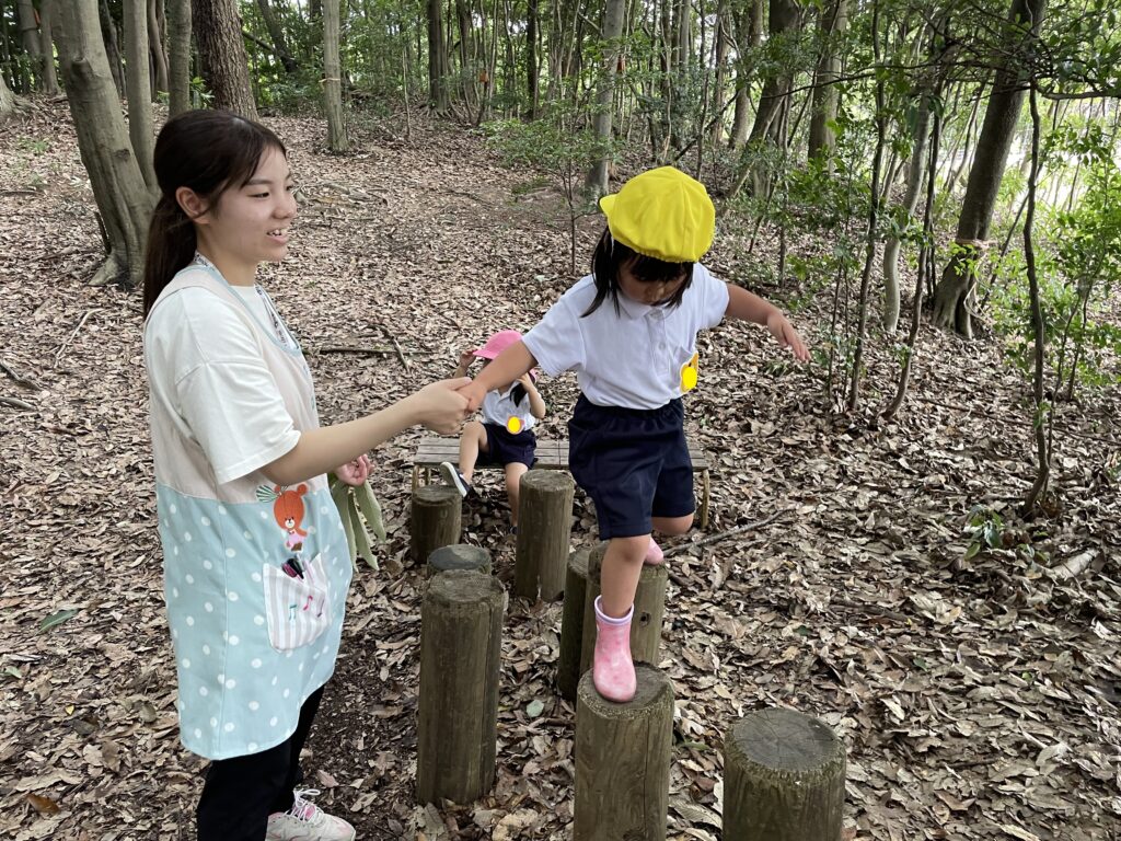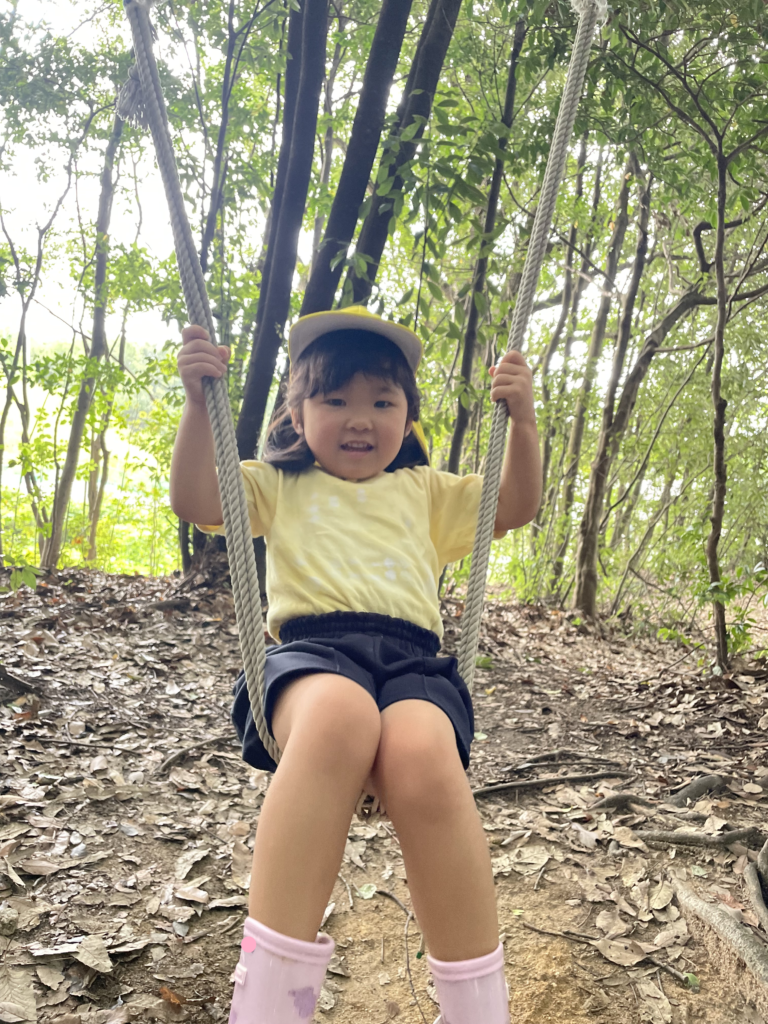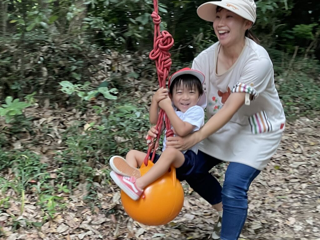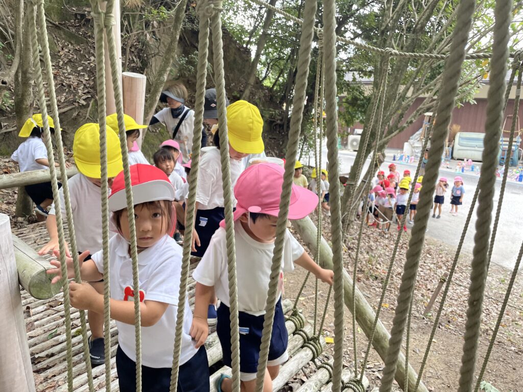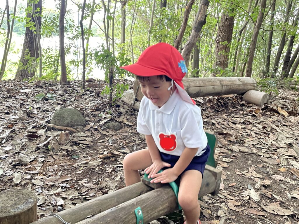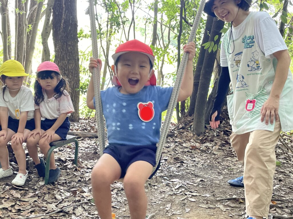 アスレチックの森に行き、ブランコやゆらゆら橋、ターザンロープなどをして遊びました。子どもたちに人気があったのはターザンロープでした!スピードがでるので、ロープをしっかり握りながら遊ぶことを楽しみました。