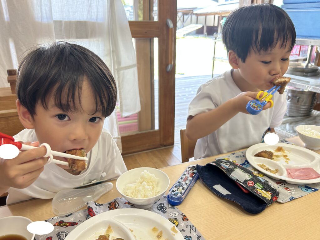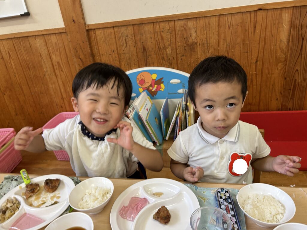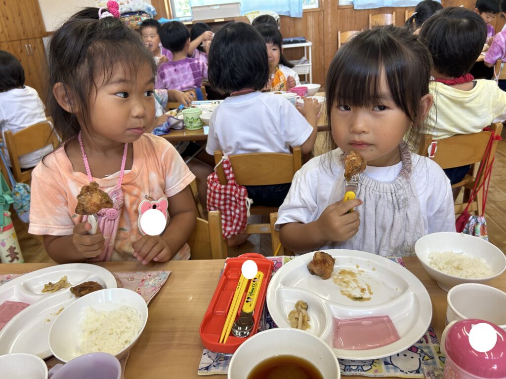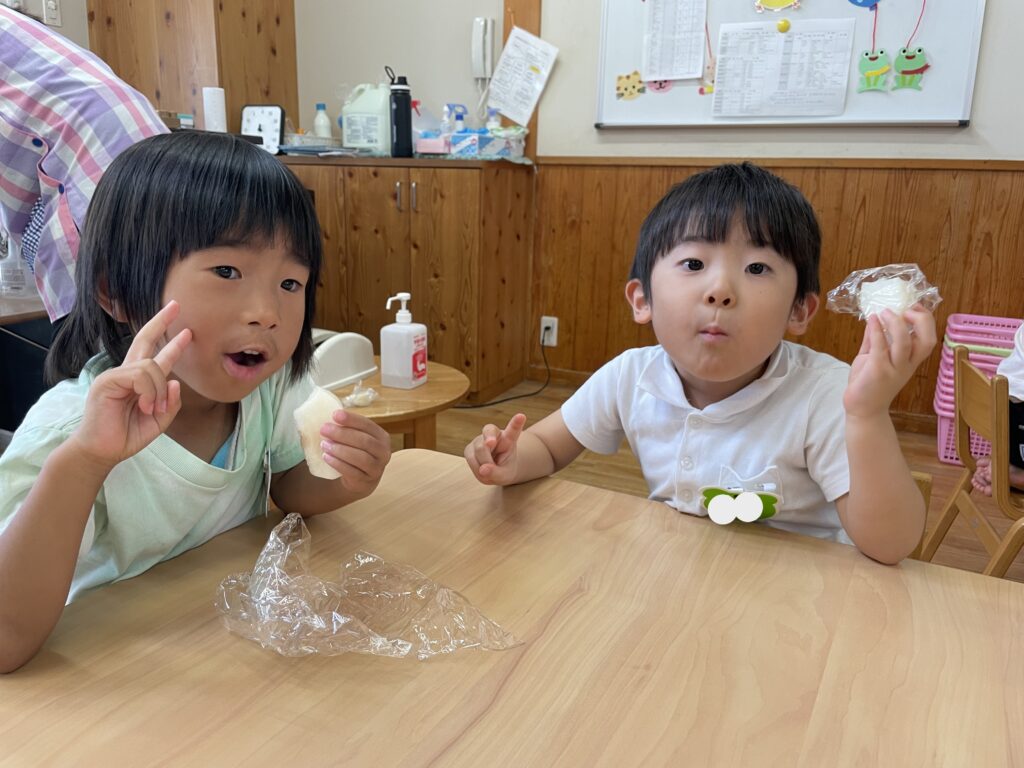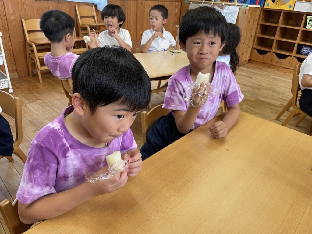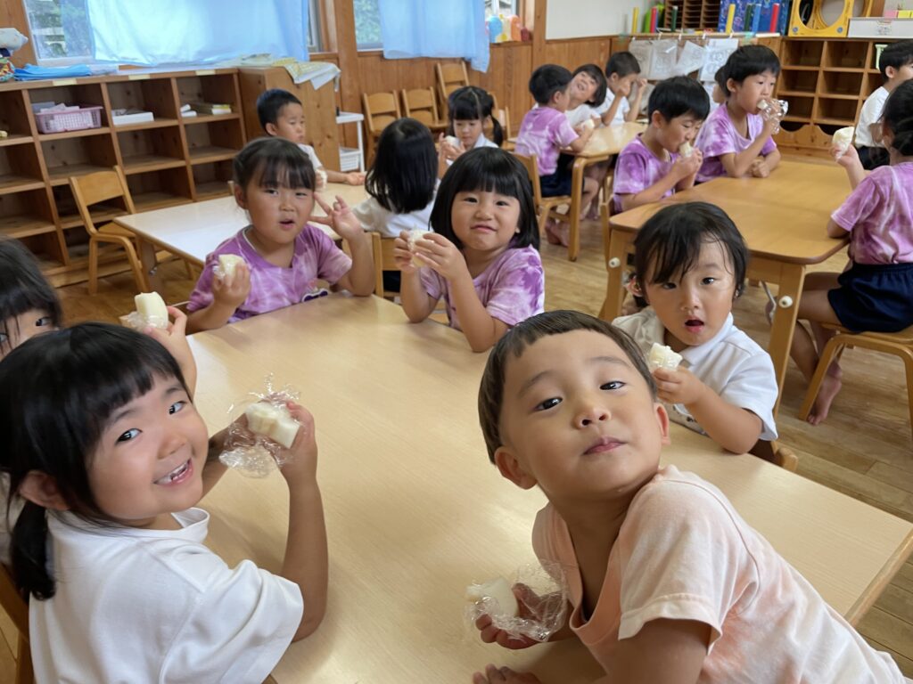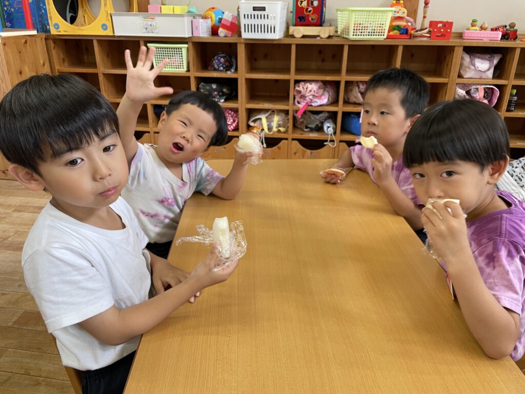 今日のおやつは、「梨」旬の果物を美味しく食べました!お代わりをした子もいました!果汁があふれるみずみずしい梨を、笑顔で食べていました!