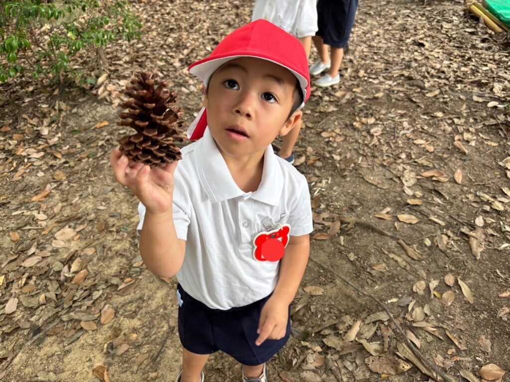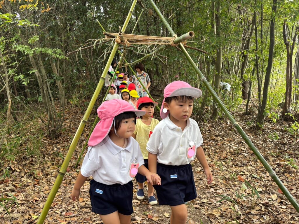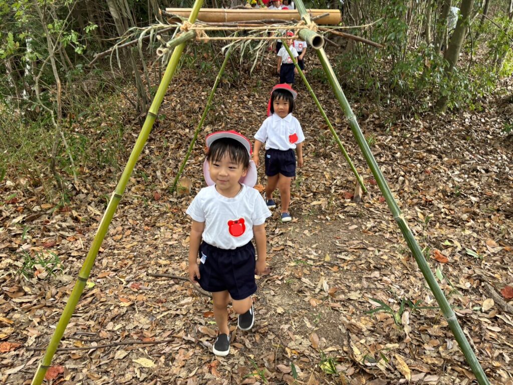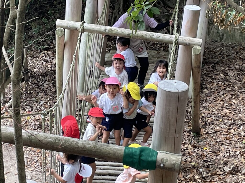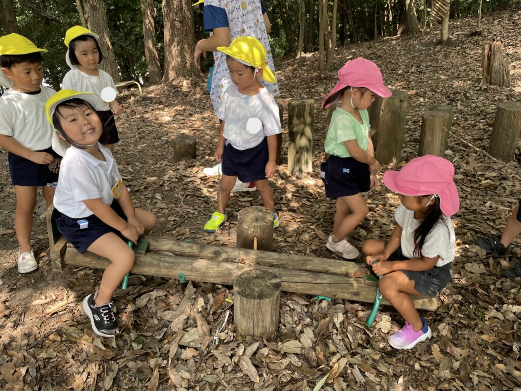 アスレチックの森では、大きな松ぼっくりを見つけたり、ゆらゆら橋を激しく揺らし、体を動かしたりしました。森の中は、少し気温が下がり過ごしやすかったです。