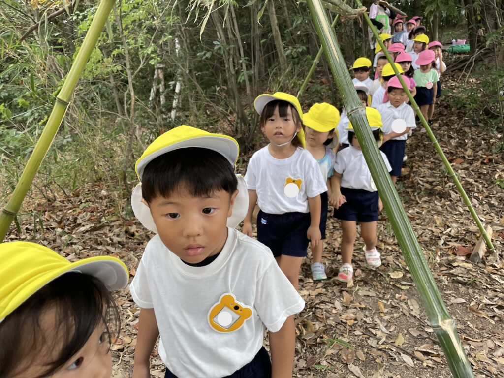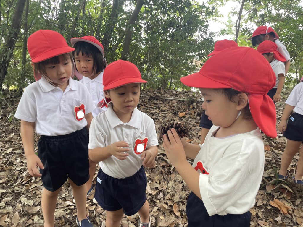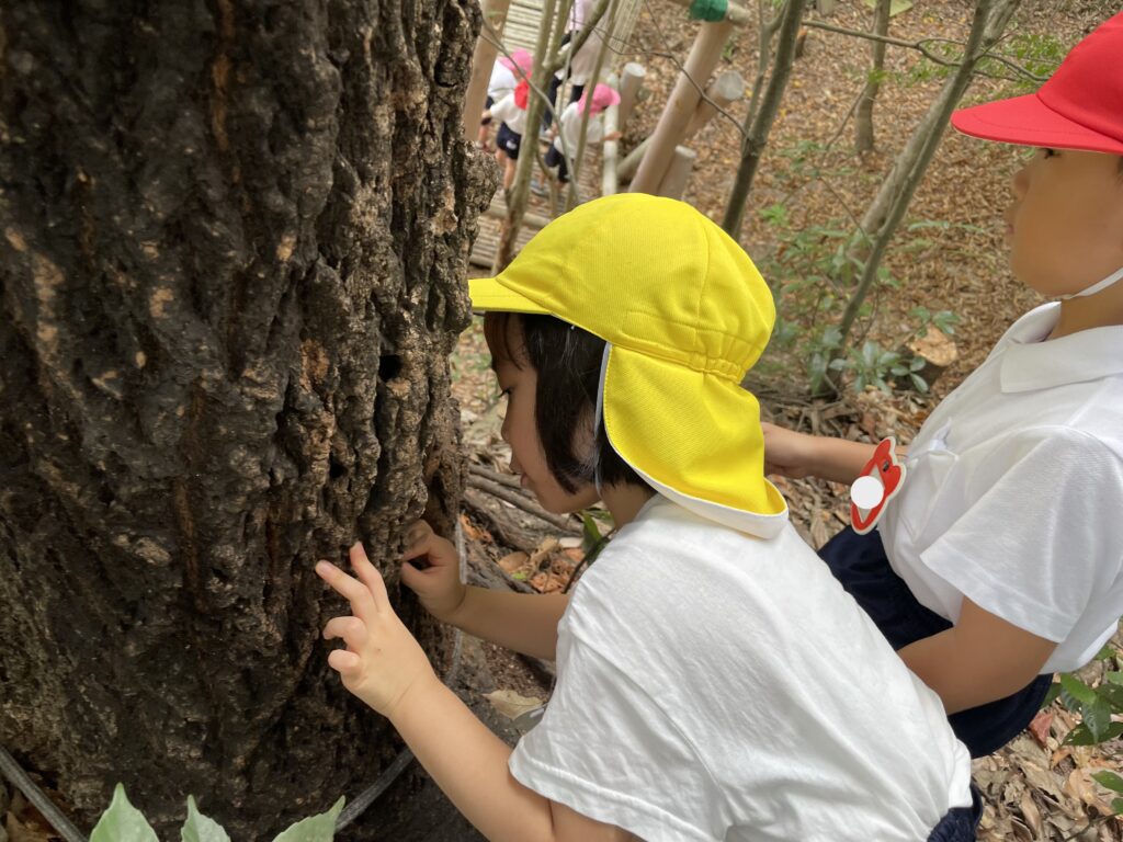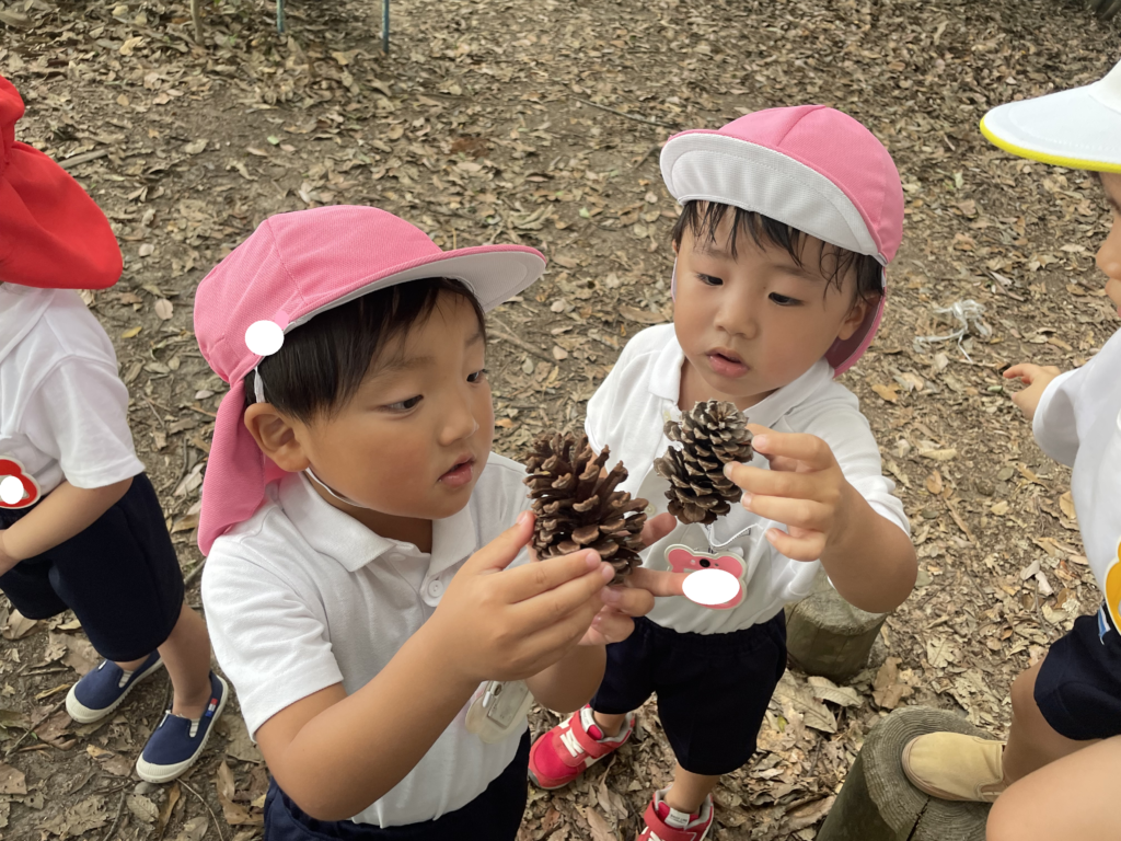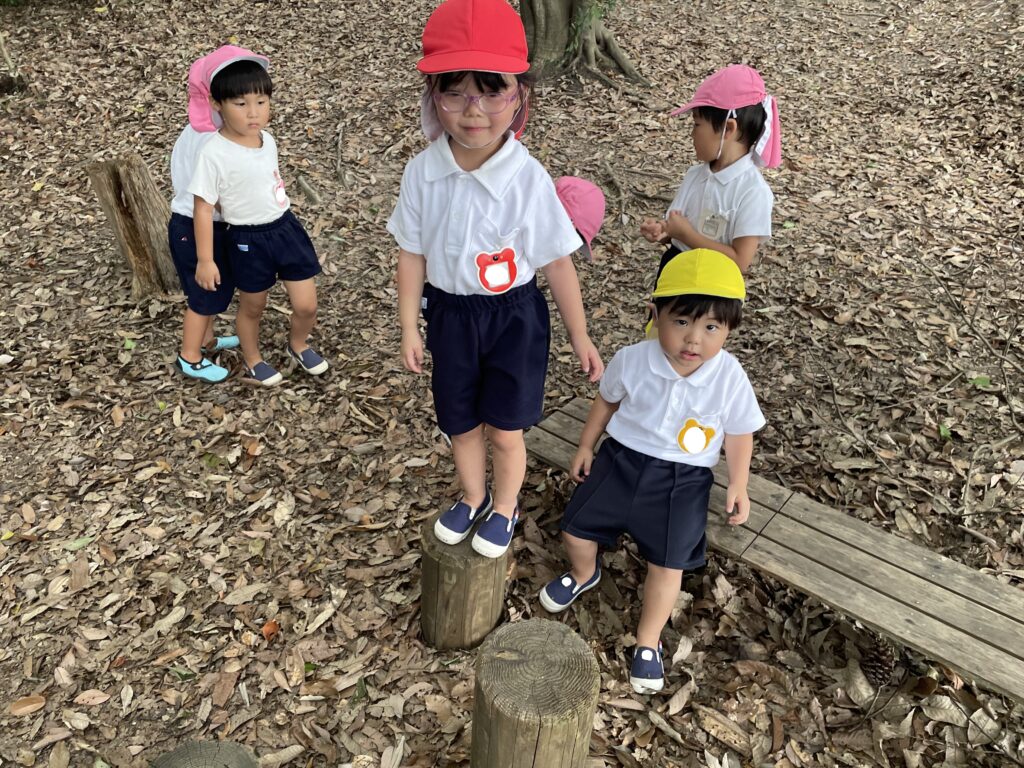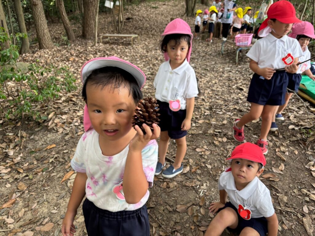 アスレチックの森では、大きな松ぼっくりを見つけたり、ゆらゆら橋を激しく揺らし、体を動かしたりしました。森の中は、少し気温が下がり過ごしやすかったです。