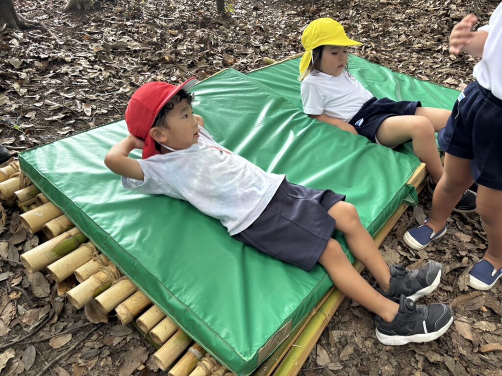 新たに、手作りの竹トンネルと寝転ぶことができるデッキがアスレッチクに設置されました!