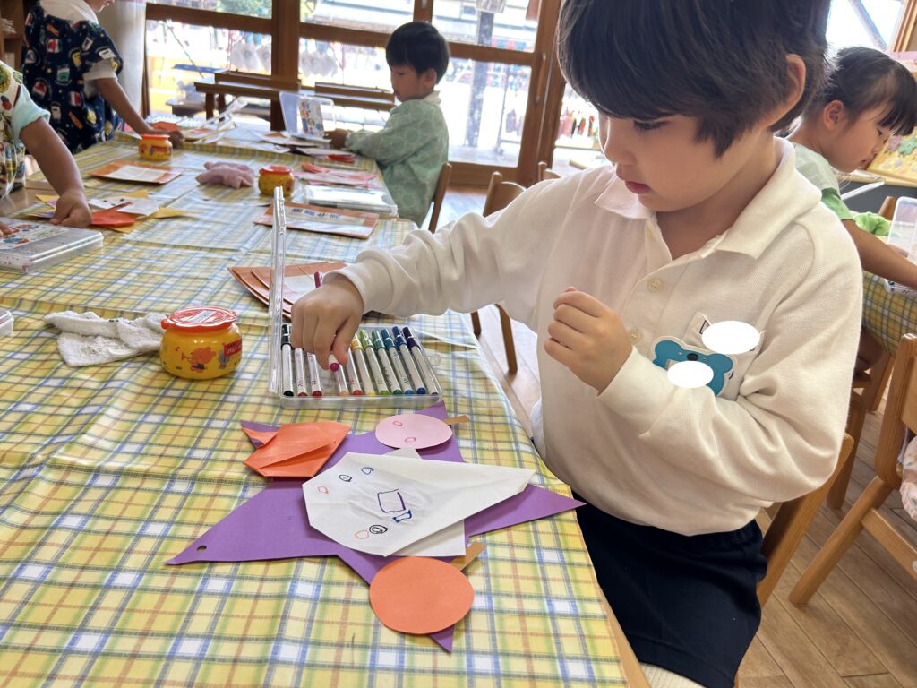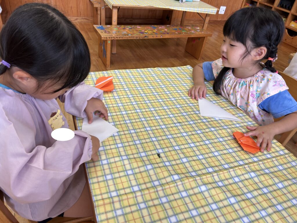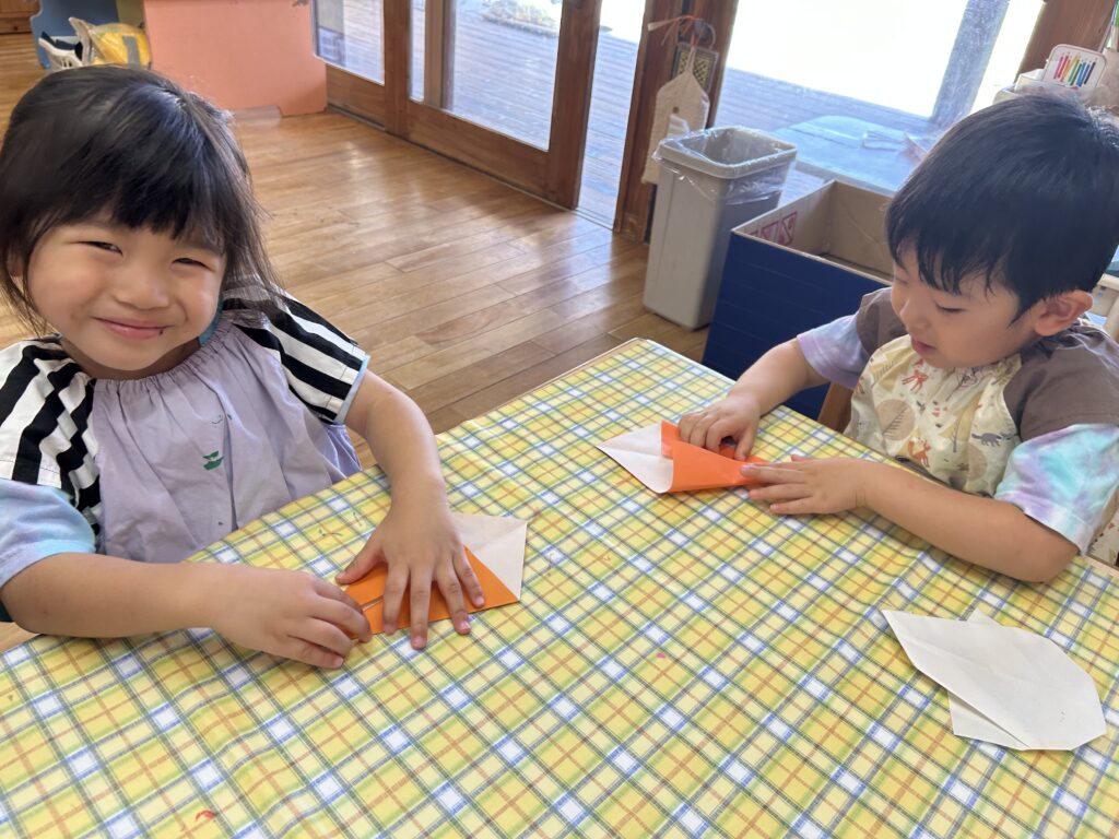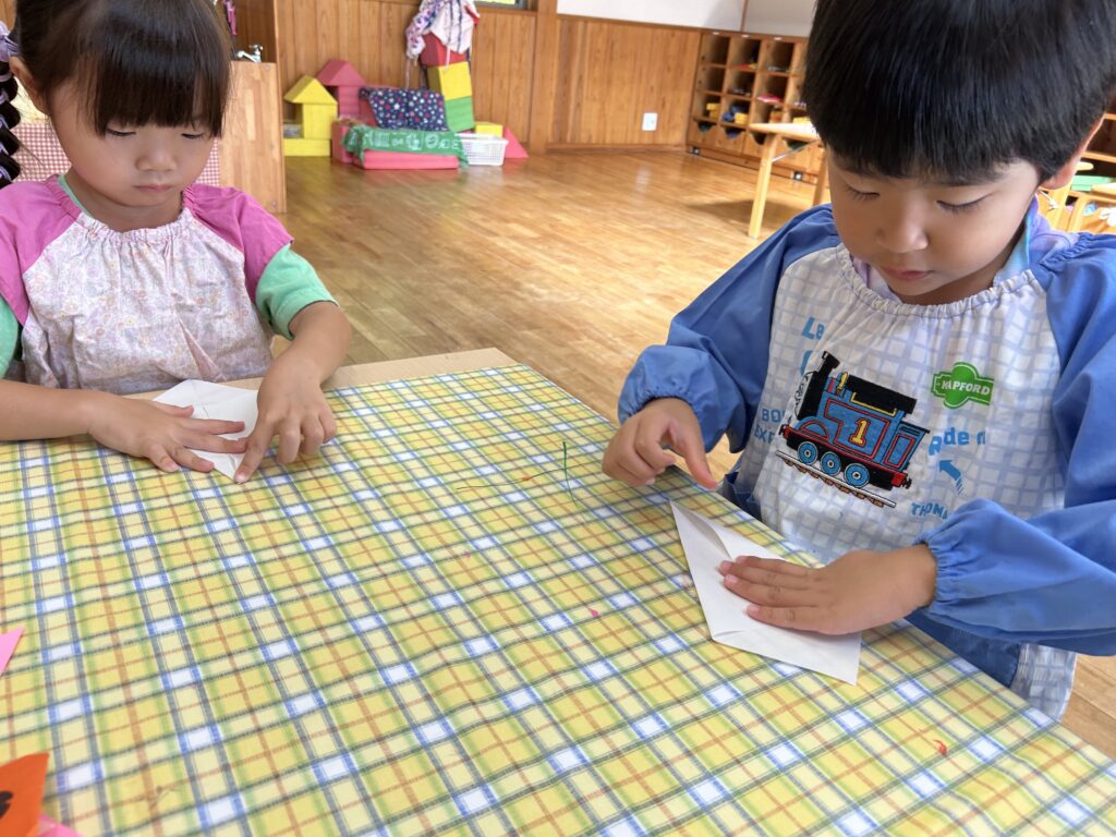 折り紙では、線に沿って慎重に折ったり、角と角を丁寧に合わせて折ったりするなど、一つずつ心を込めて作っている様子が見られました。