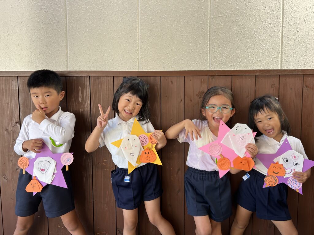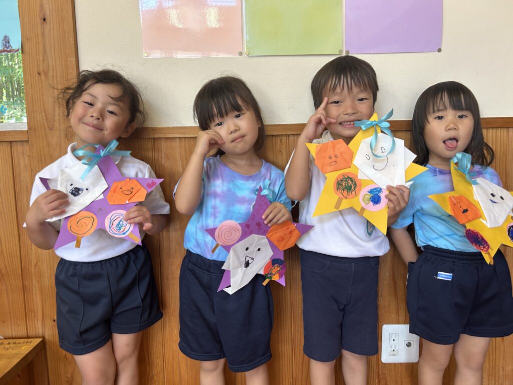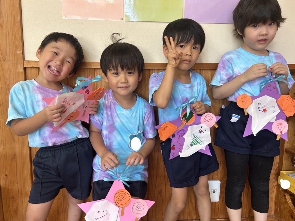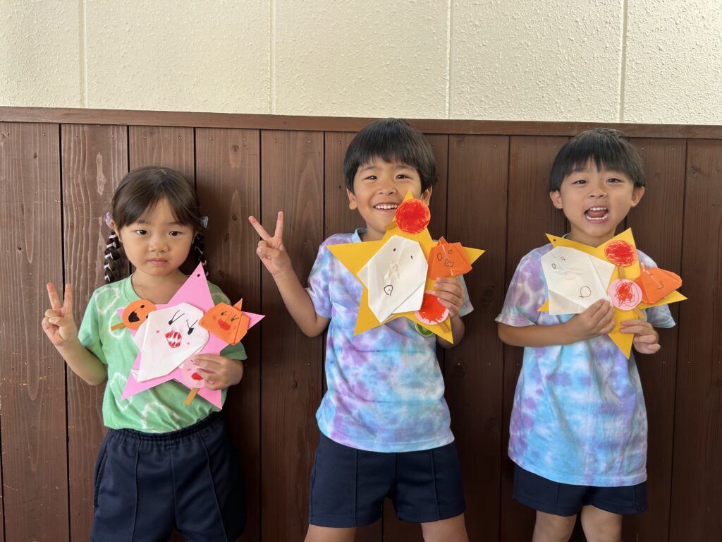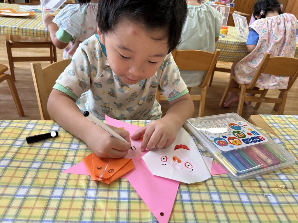 折り紙では、線に沿って慎重に折ったり、角と角を丁寧に合わせて折ったりするなど、一つずつ心を込めて作っている様子が見られました。