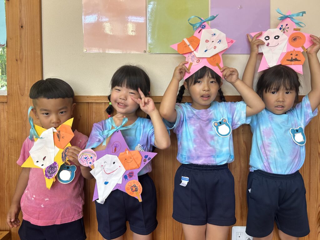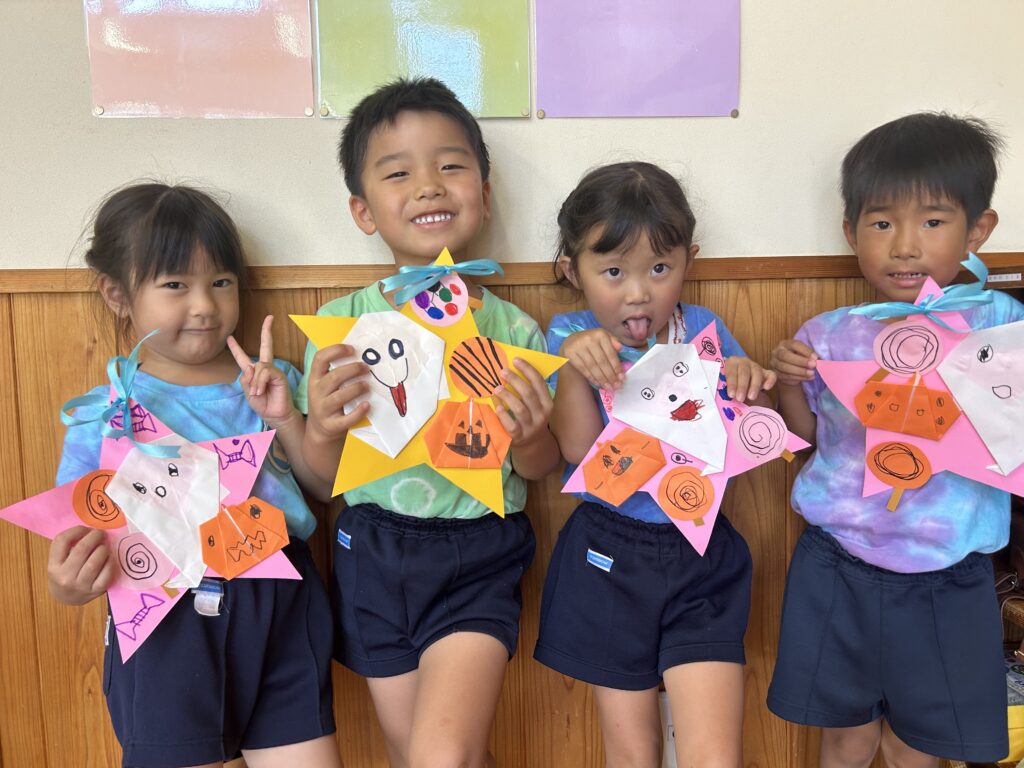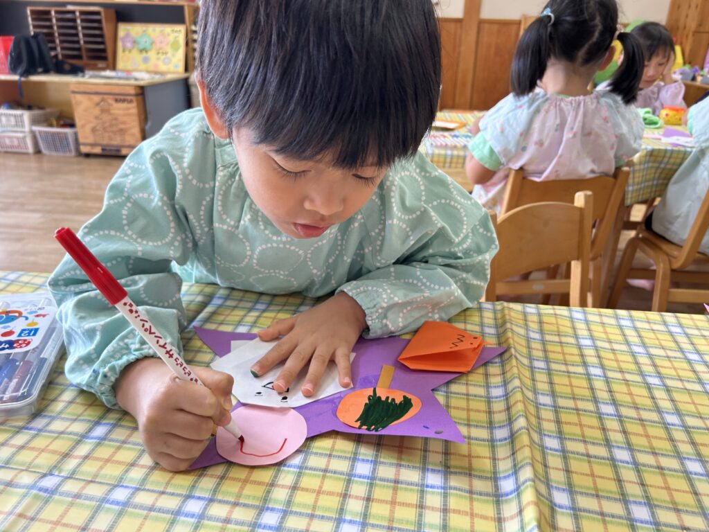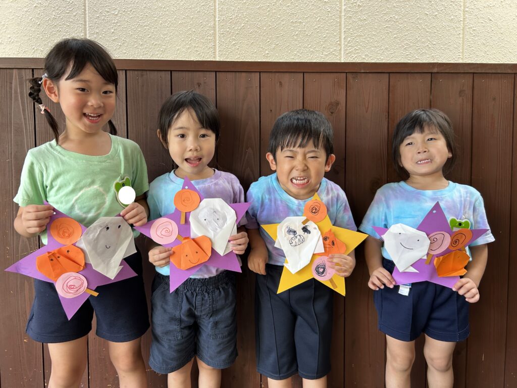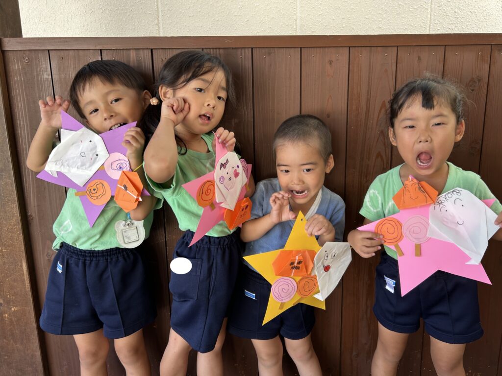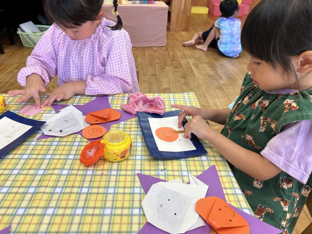その後は、お化けやかぼちゃに顔を描き、「ぼくはこわーいお化けにするんだあ」「かぼちゃの口ってこんな感じかな?」と呟きながら作り、一人ひとり素敵な個性あふれる作品が出来上がりました(^▽^)