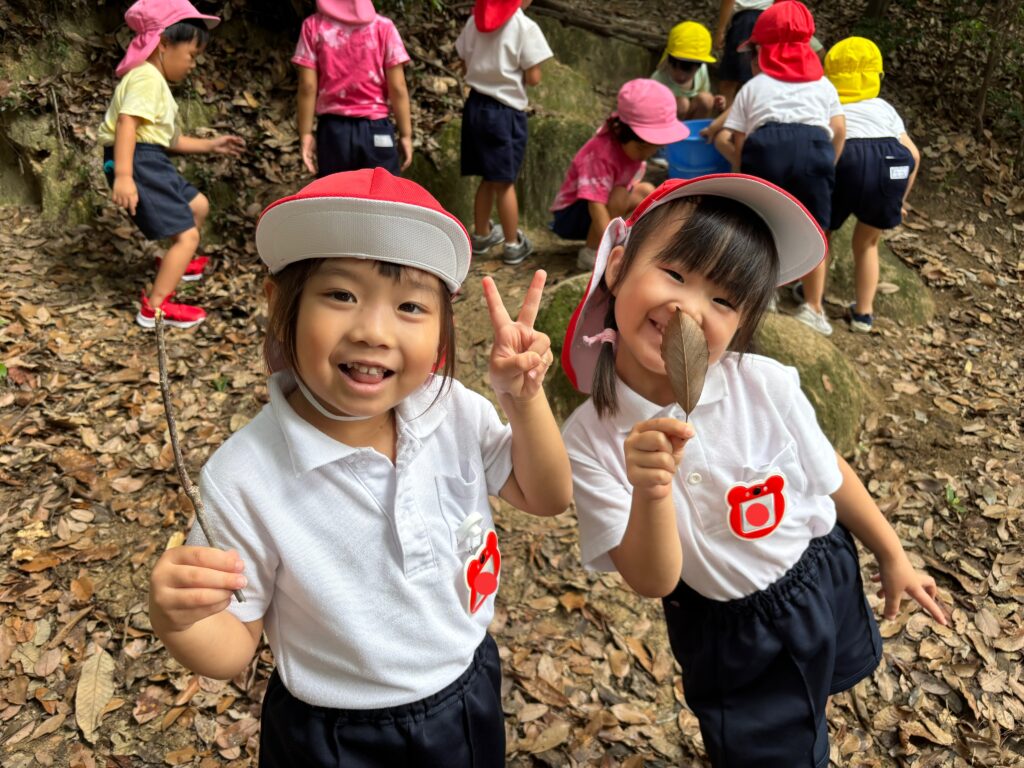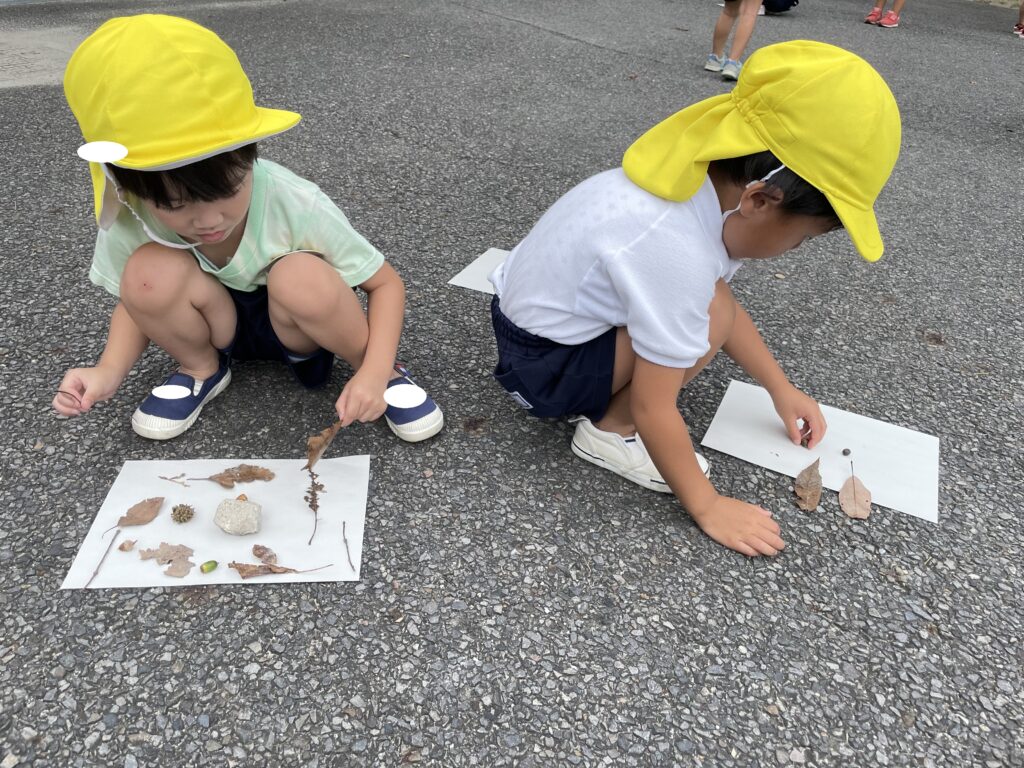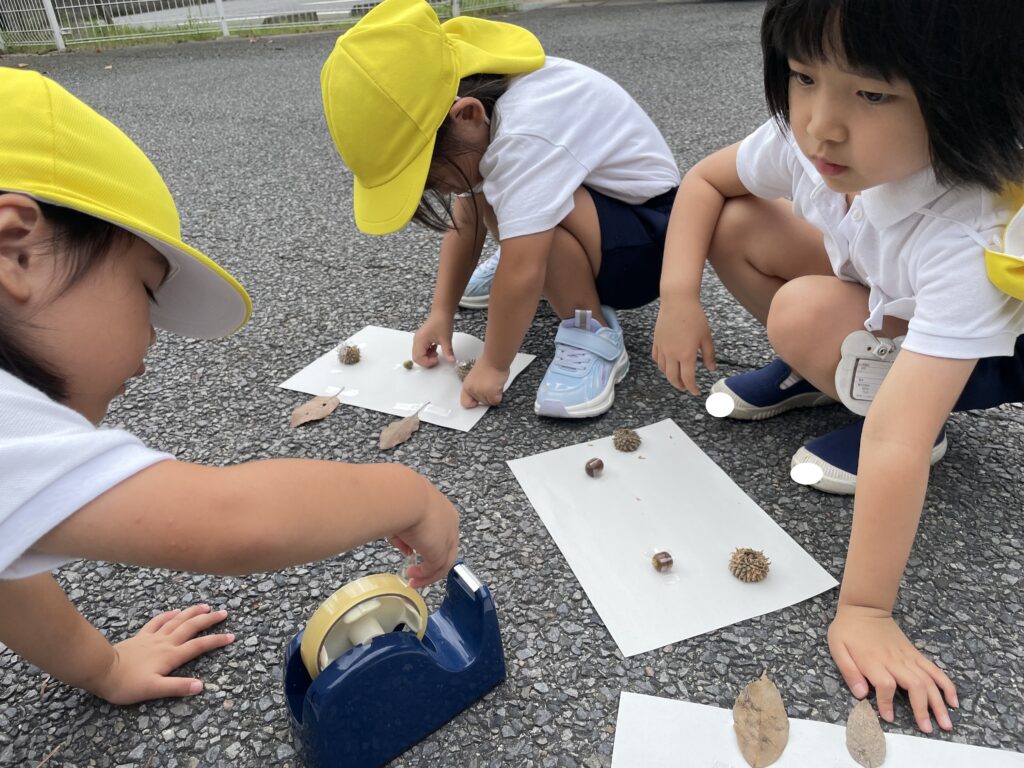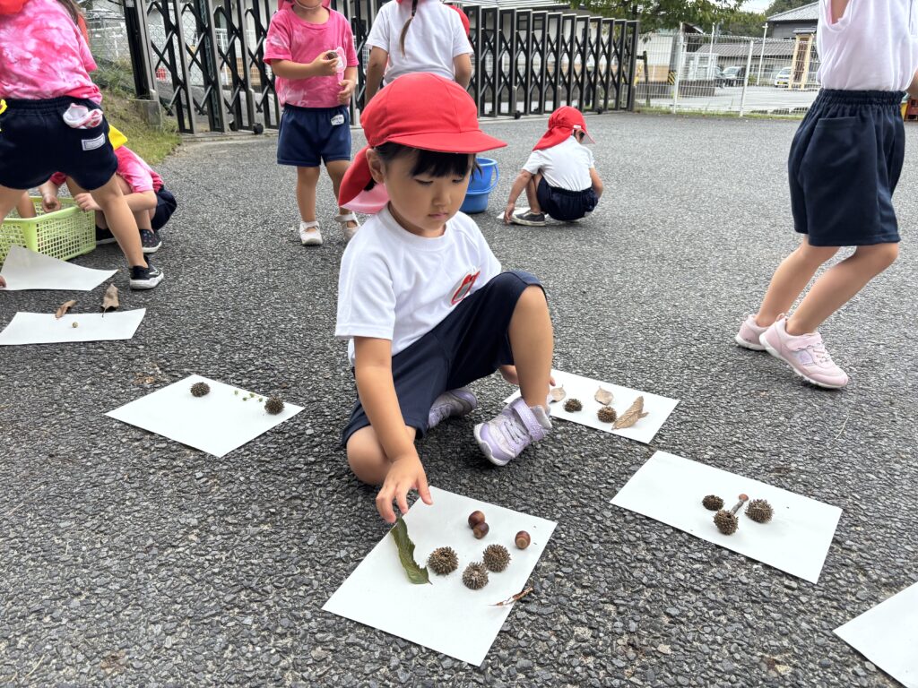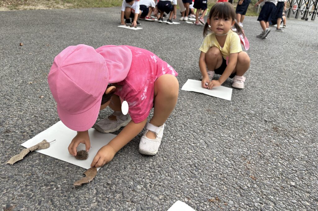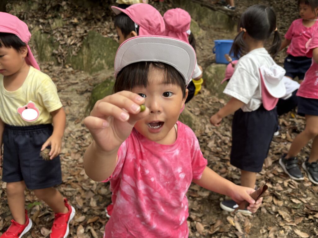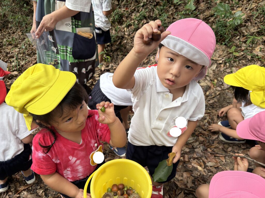 アスレチックの森に、秋の実が増えてきました。園庭にもどんぐりの木があり、子どもたちは、どんぐりを拾ったりコマにして楽しんでいます。