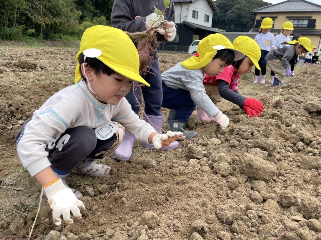 子どもたちは、土をかき分けたり、引っ張ったりしながら収穫を楽しみました。カエルや虫たちも畑に遊びにきていましたよ。