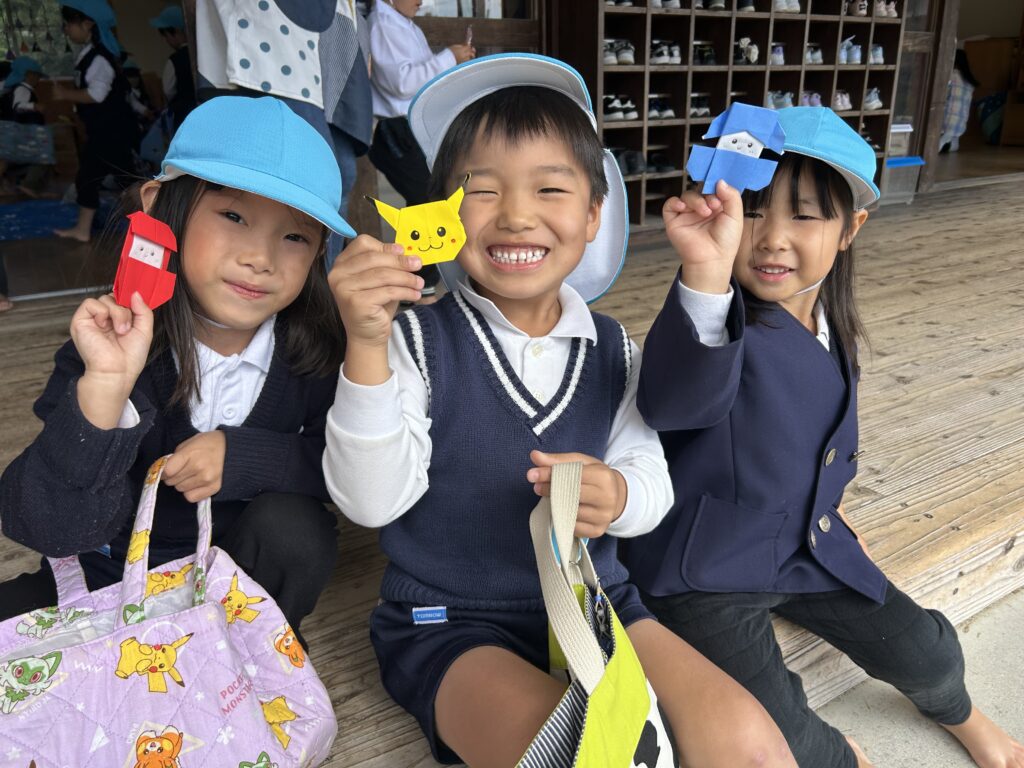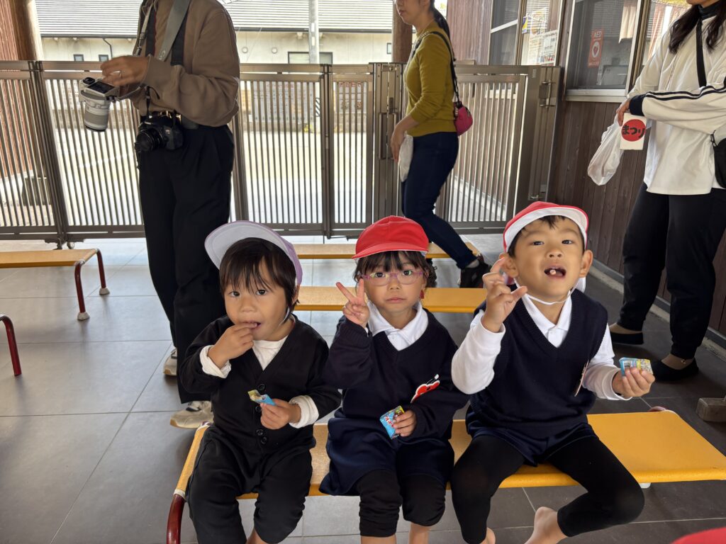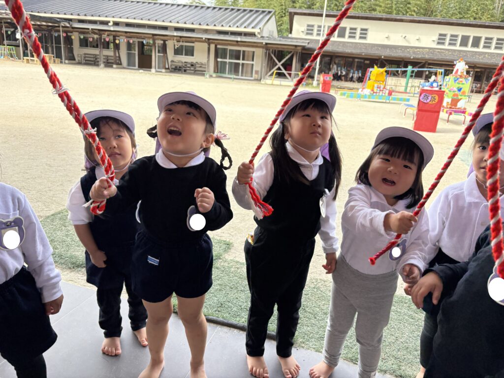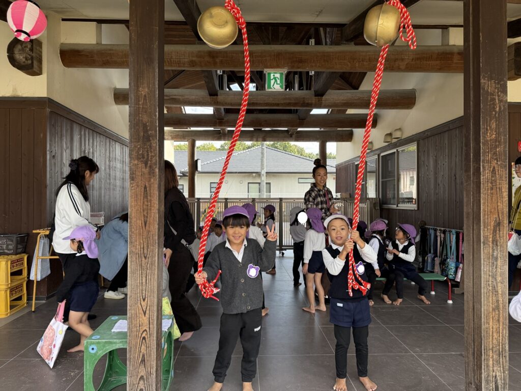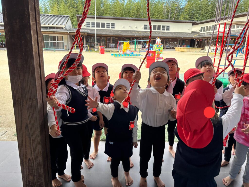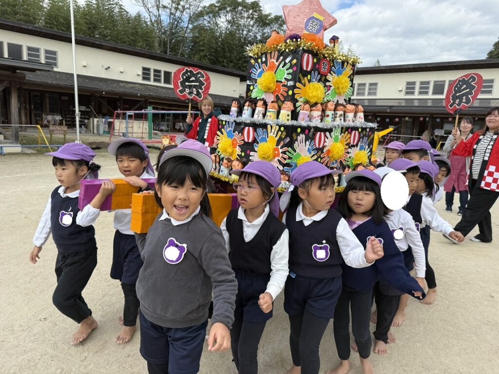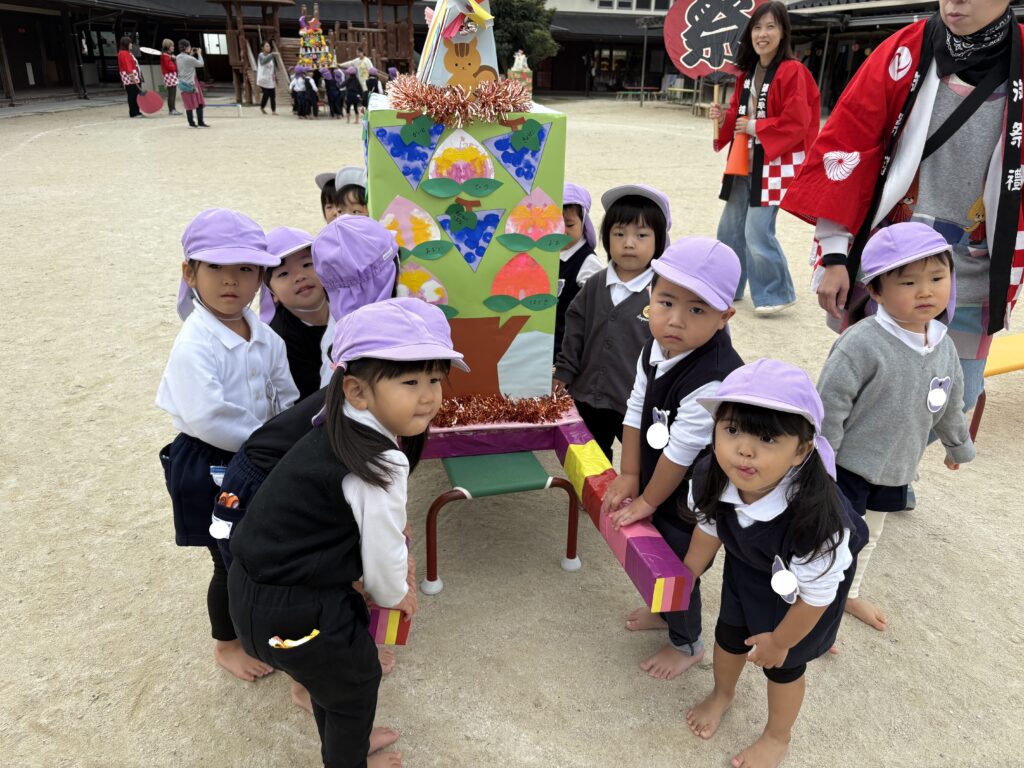 後援会役員さん・幹事さん手作りの御輿をかつぎ園庭を練り歩きました。和太鼓の音と子どもたちの元気な「わっしょい!」の掛け声響く、楽しい一日となりました。