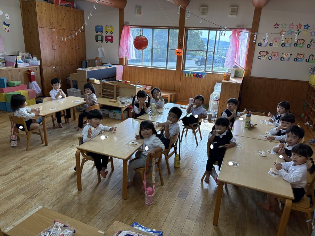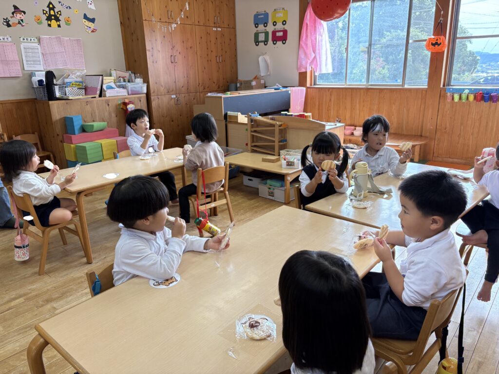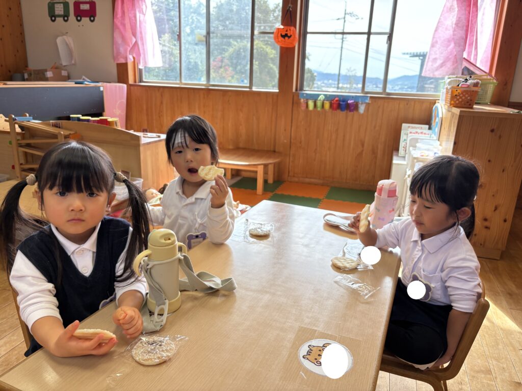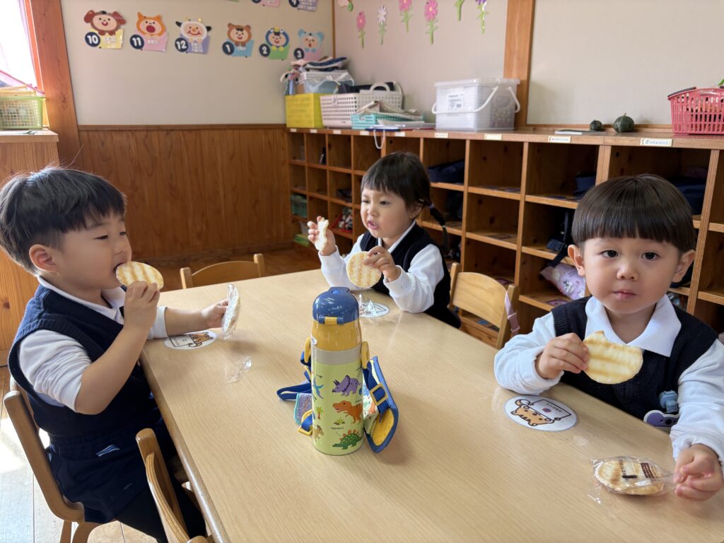 新しい友達は、初めてみんなでおやつを食べて、笑顔で過ごせました。
