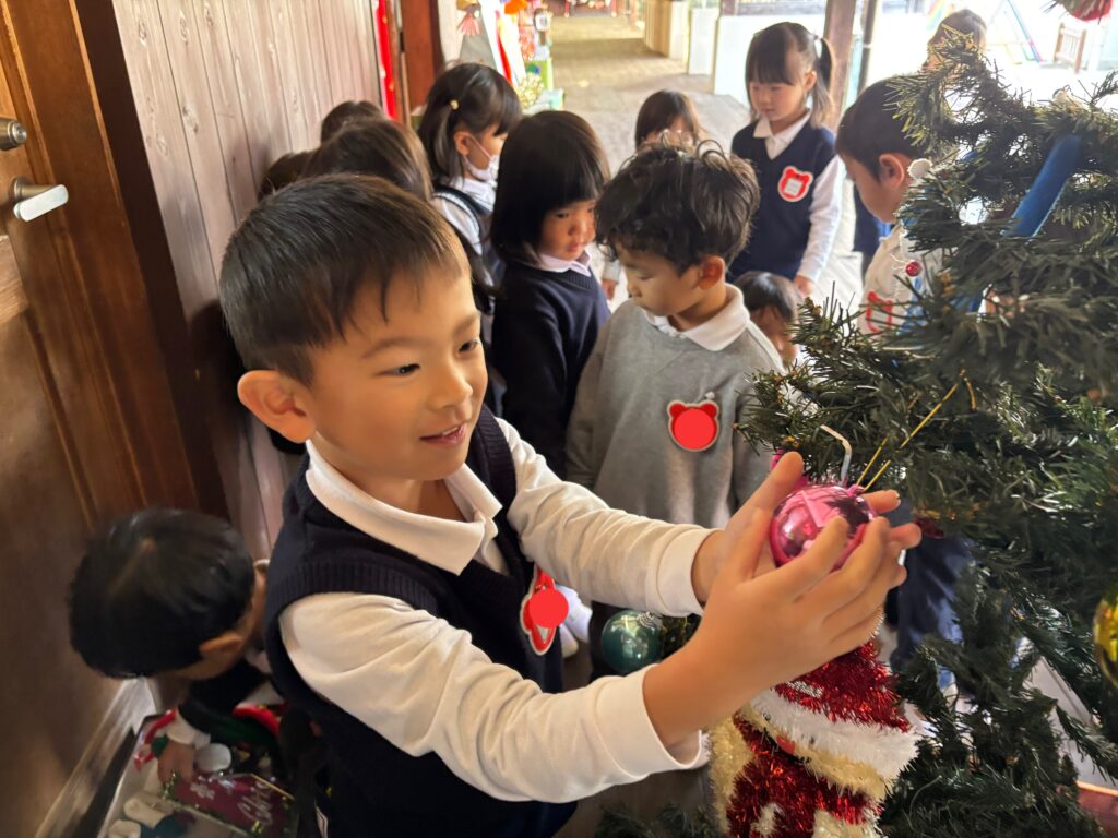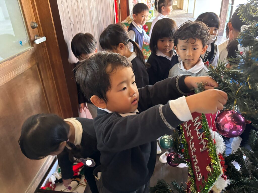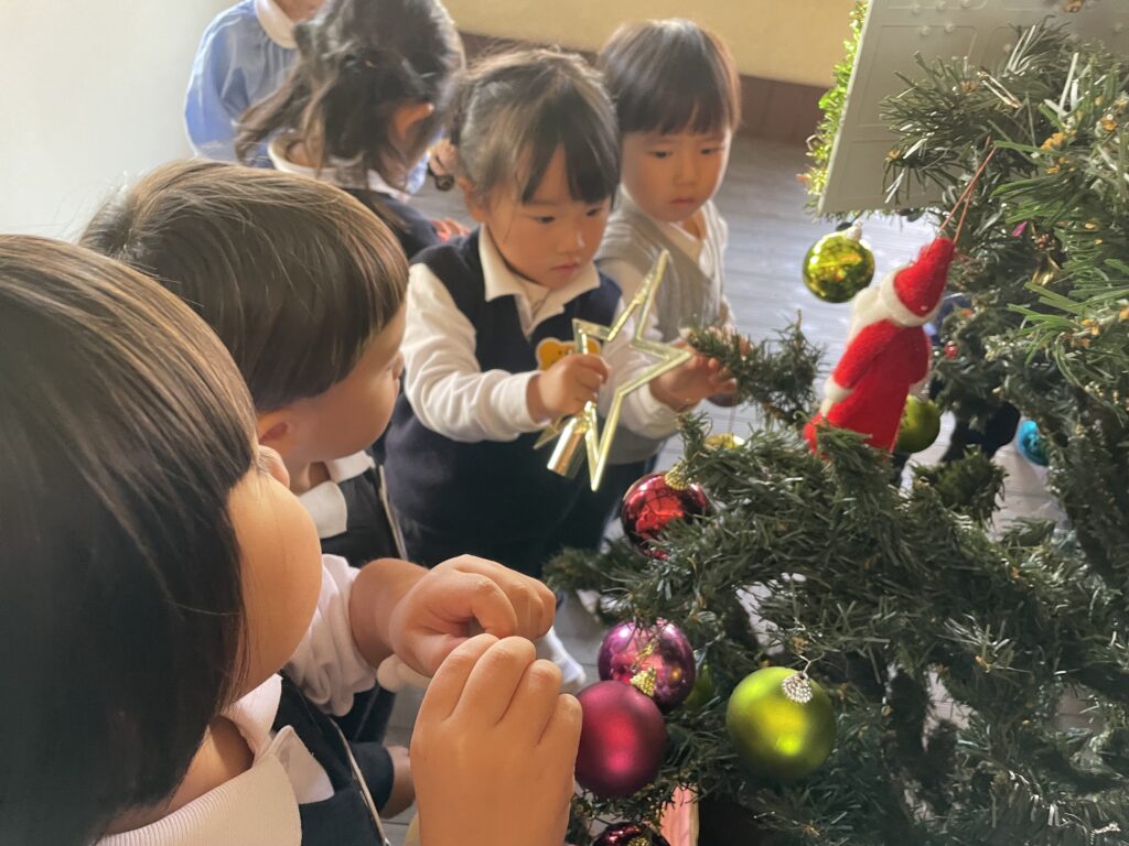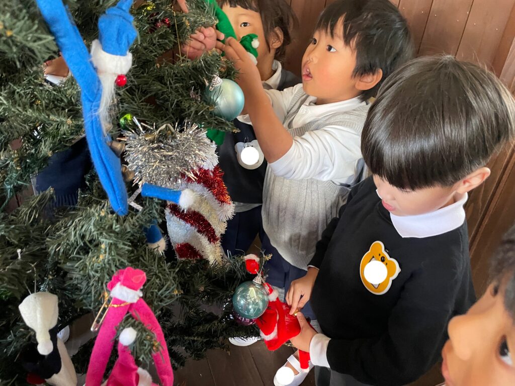子どもたちはサンタクロースがプレゼントを届けてくれることを楽しみにしています。今日は、幼稚園のクリスマスツリーにオーナメントを付けました。自分で飾りたいオーナメントを選びました。完成したクリスマスツリーを見た子どもたちは、「これで、サンタさんが来れるね!」「プレゼント届けてくれるかな?」と、楽しそうに話していました!