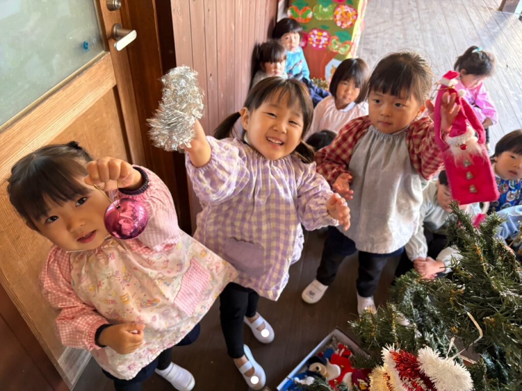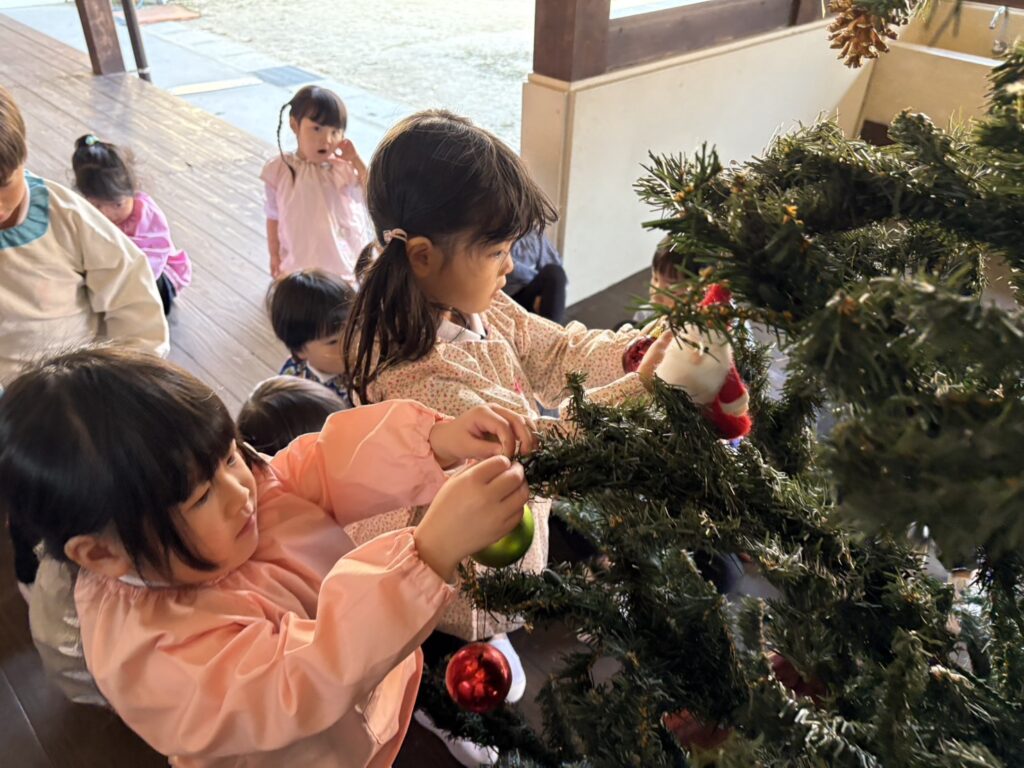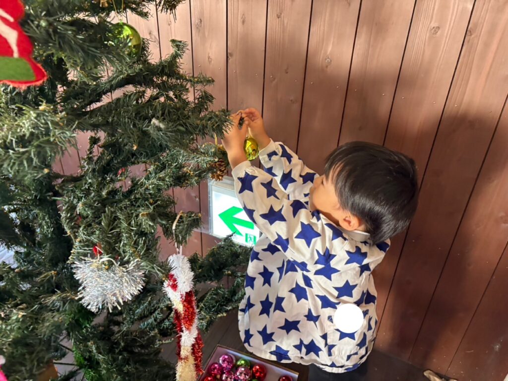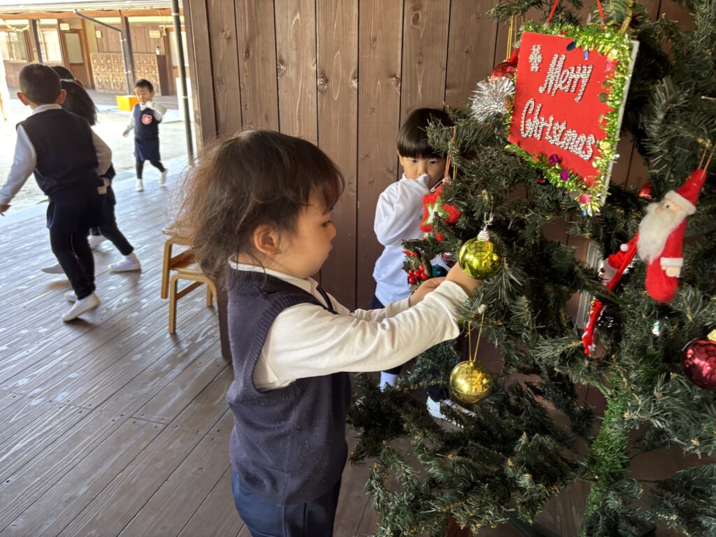 子どもたちはサンタクロースがプレゼントを届けてくれることを楽しみにしています。今日は、幼稚園のクリスマスツリーにオーナメントを付けました。自分で飾りたいオーナメントを選びました。完成したクリスマスツリーを見た子どもたちは、「これで、サンタさんが来れるね!」「プレゼント届けてくれるかな?」と、楽しそうに話していました!