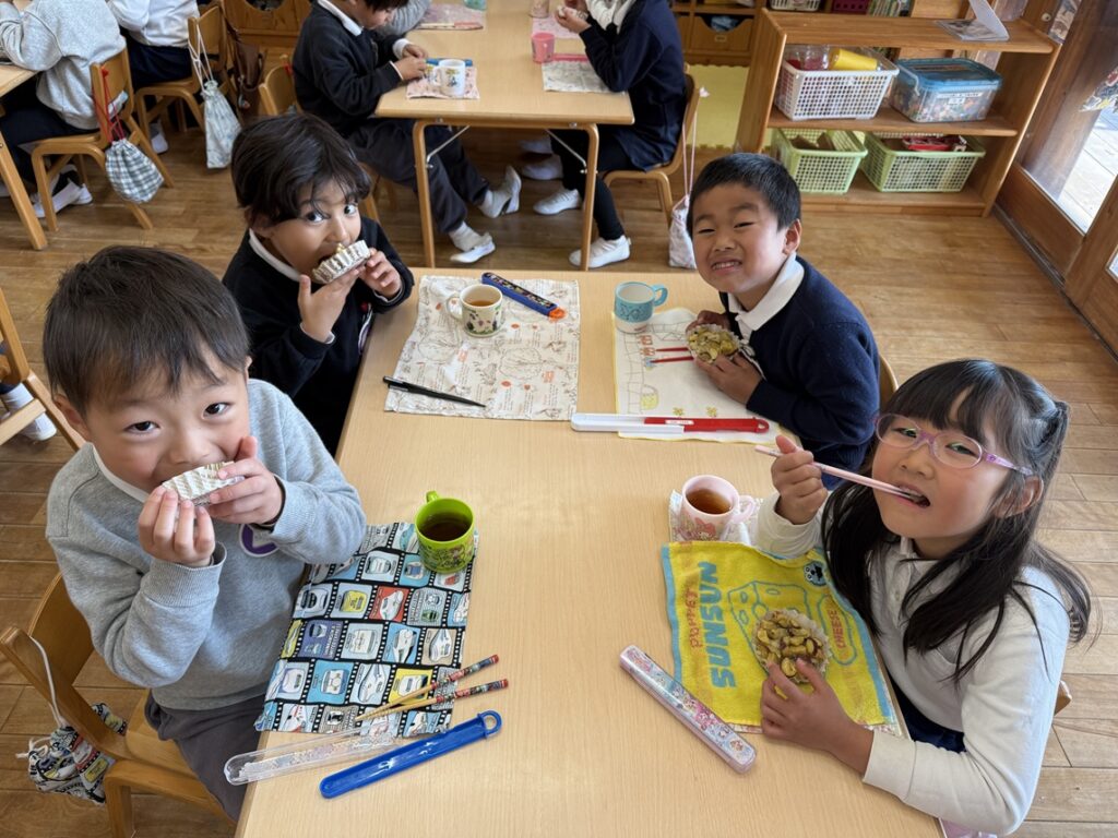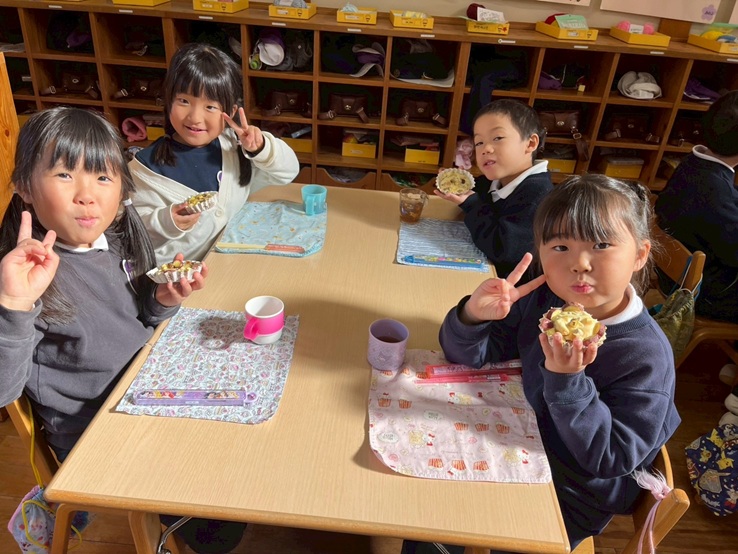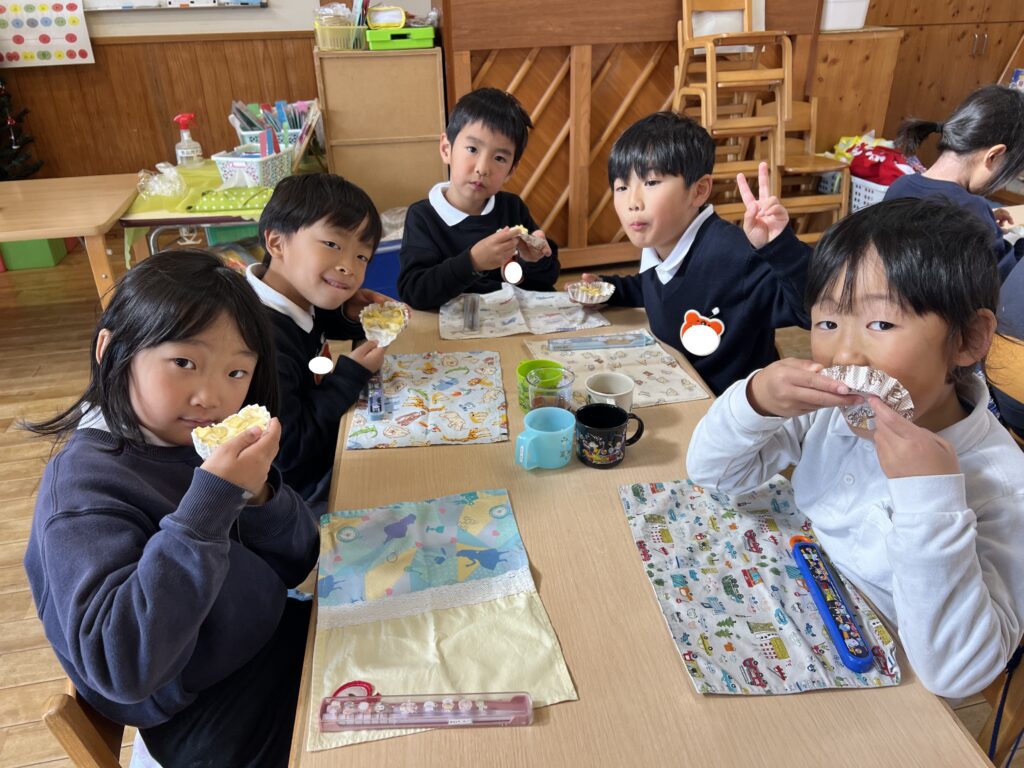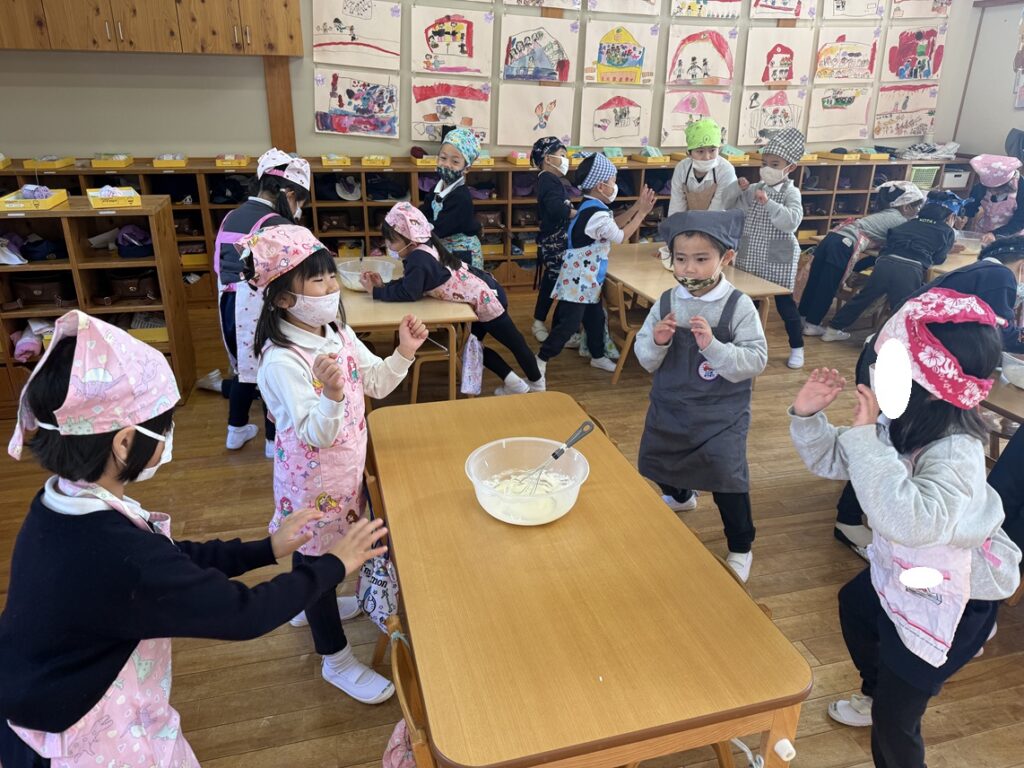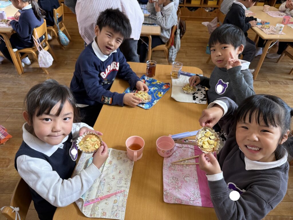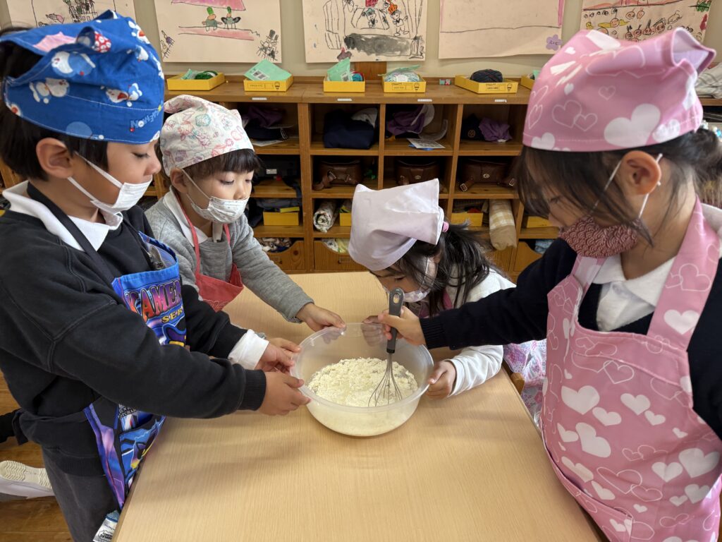 グループの友達と協力しながら生地を混ぜたり、さつまいものトッピングをしてみたりと、楽しく作ることができました!混ぜ終えると、「おいしくなあれ!」のダンスで生地にパワーを送っている子も♥