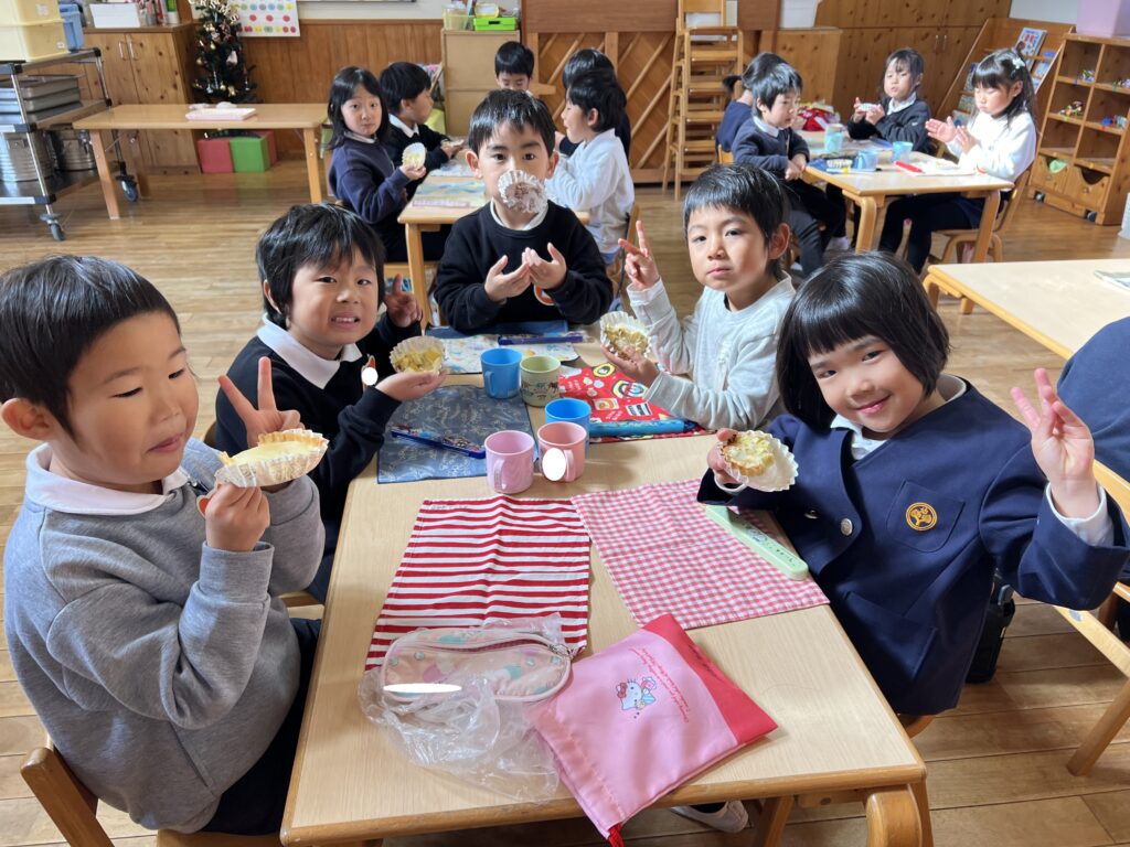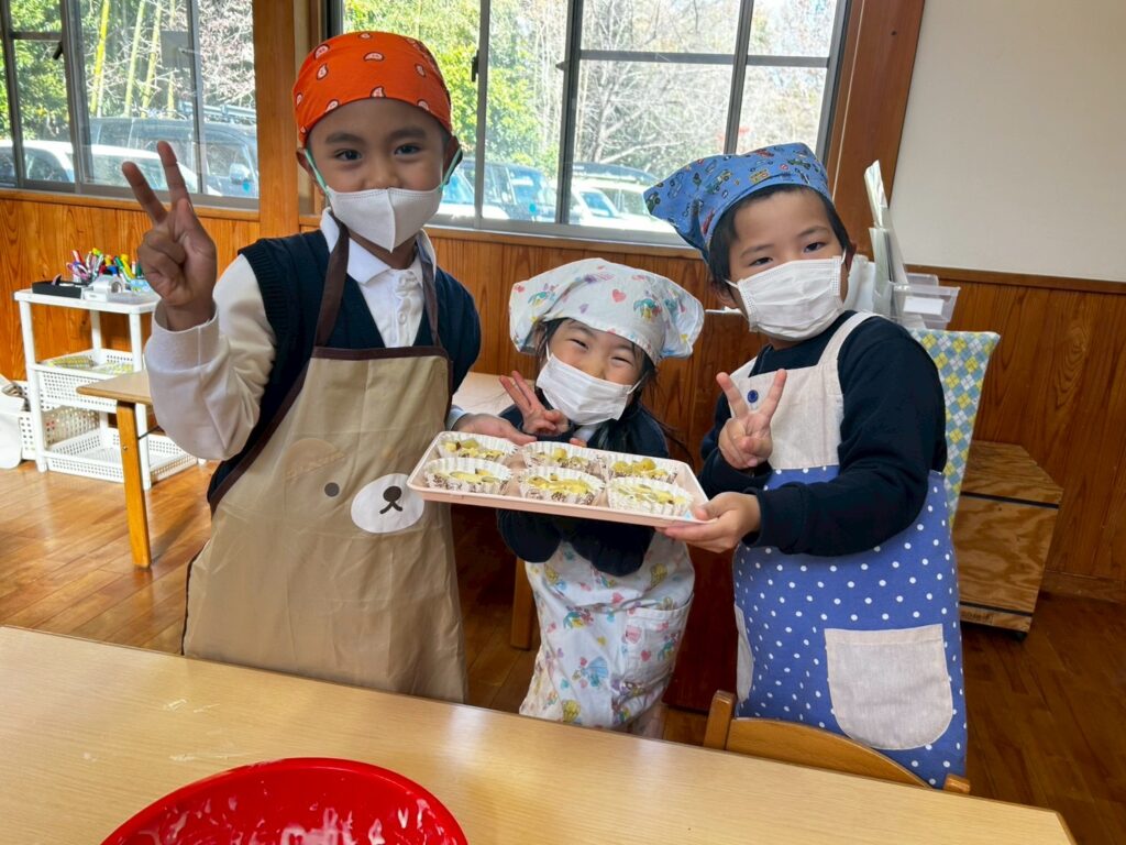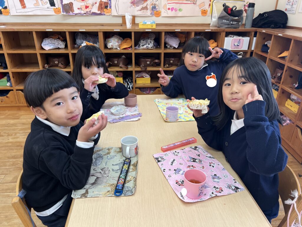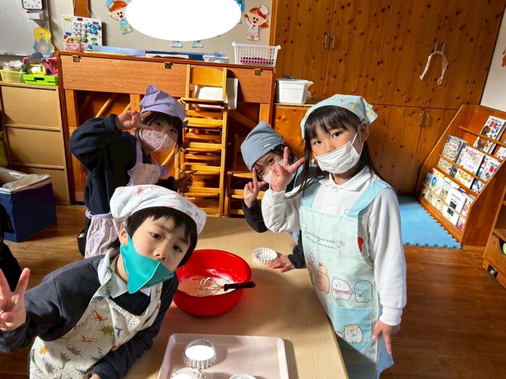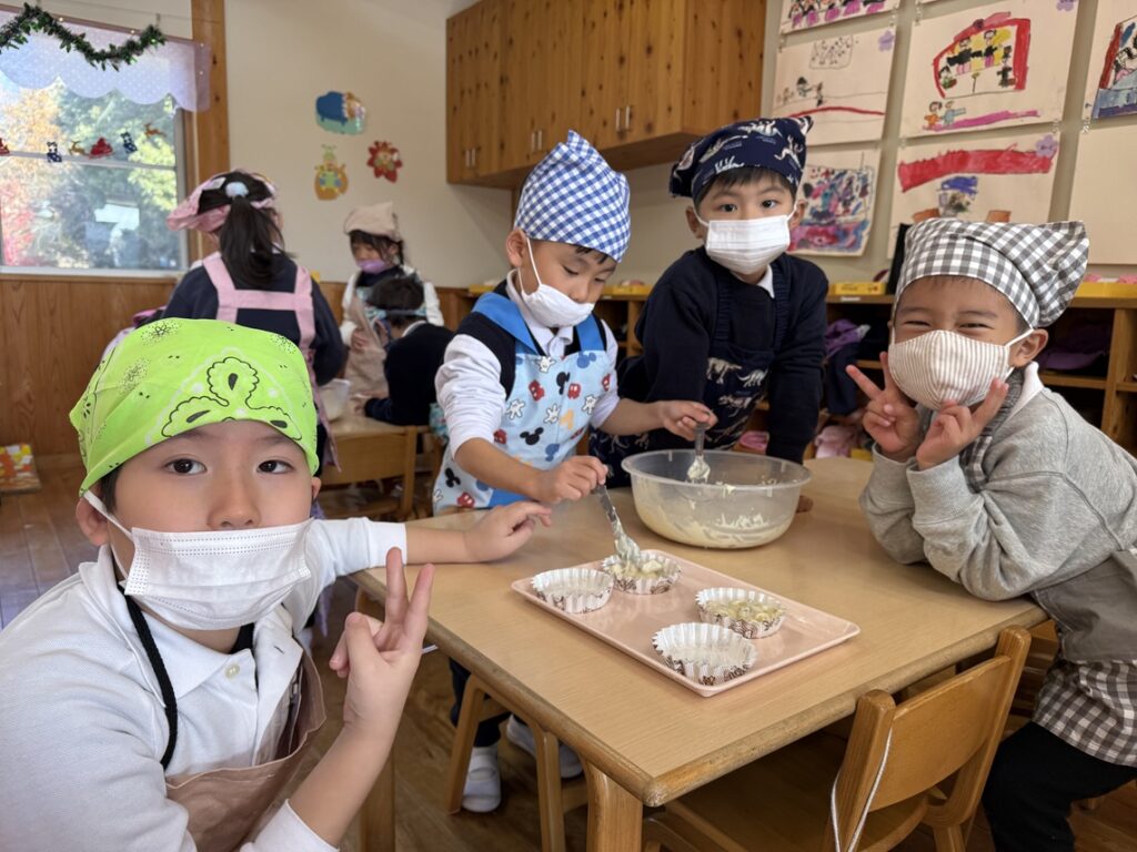 今日は年長組でクッキングをしました!自分たちで育て、収穫したさつまいもを使って、カップケーキを作りました!
