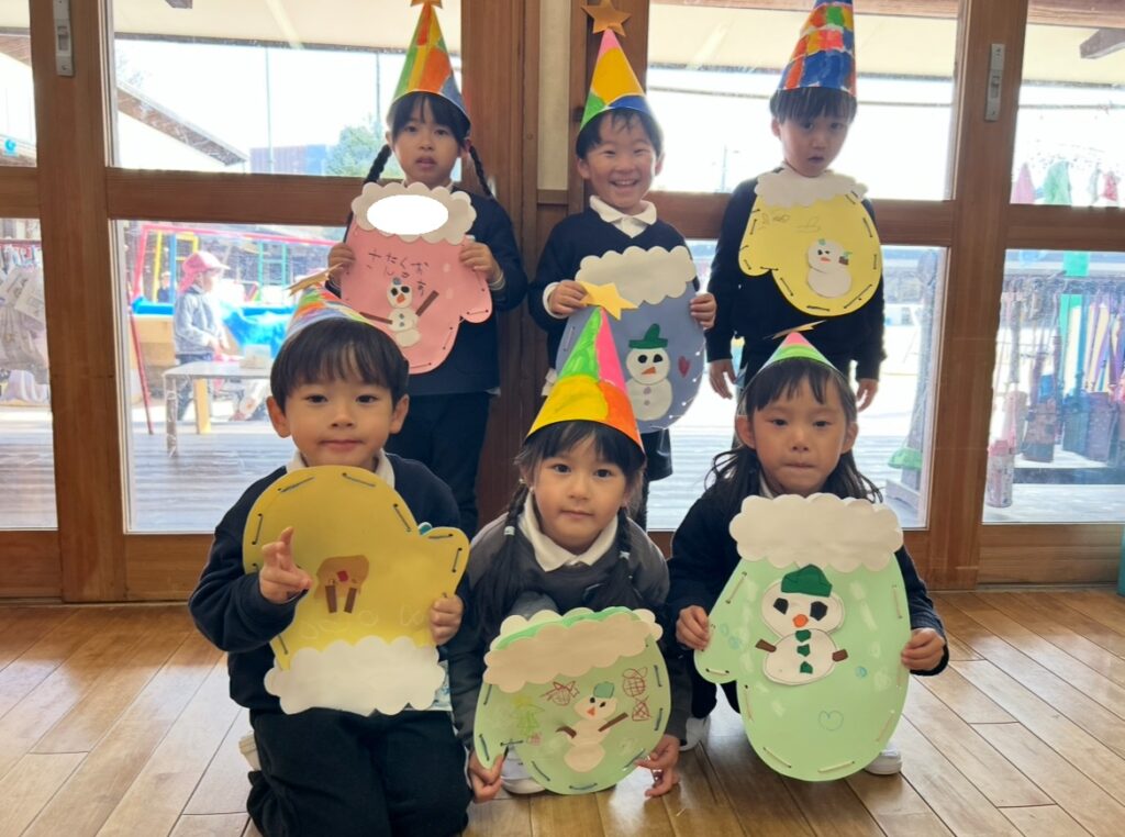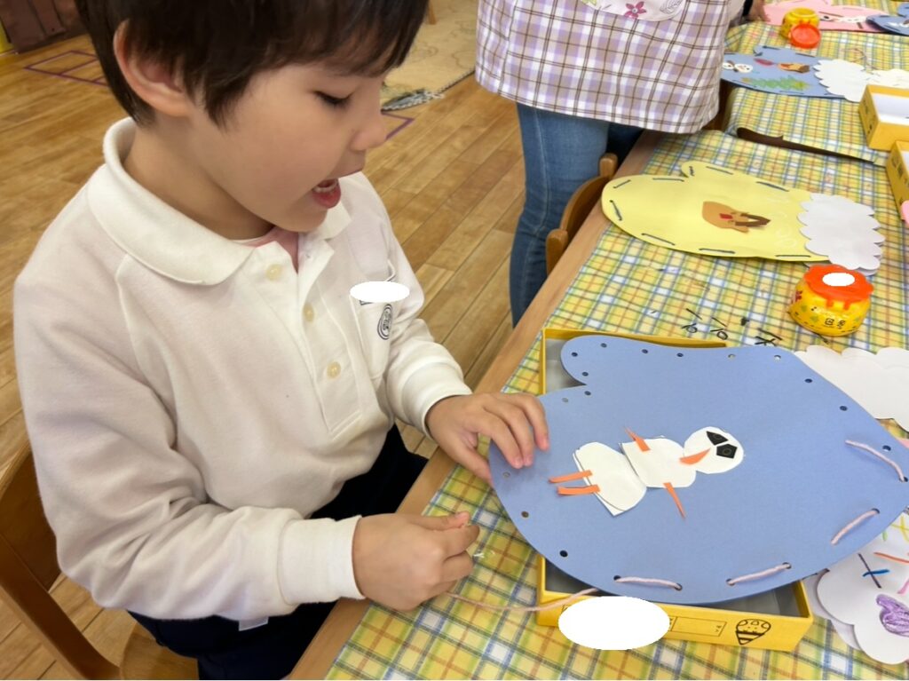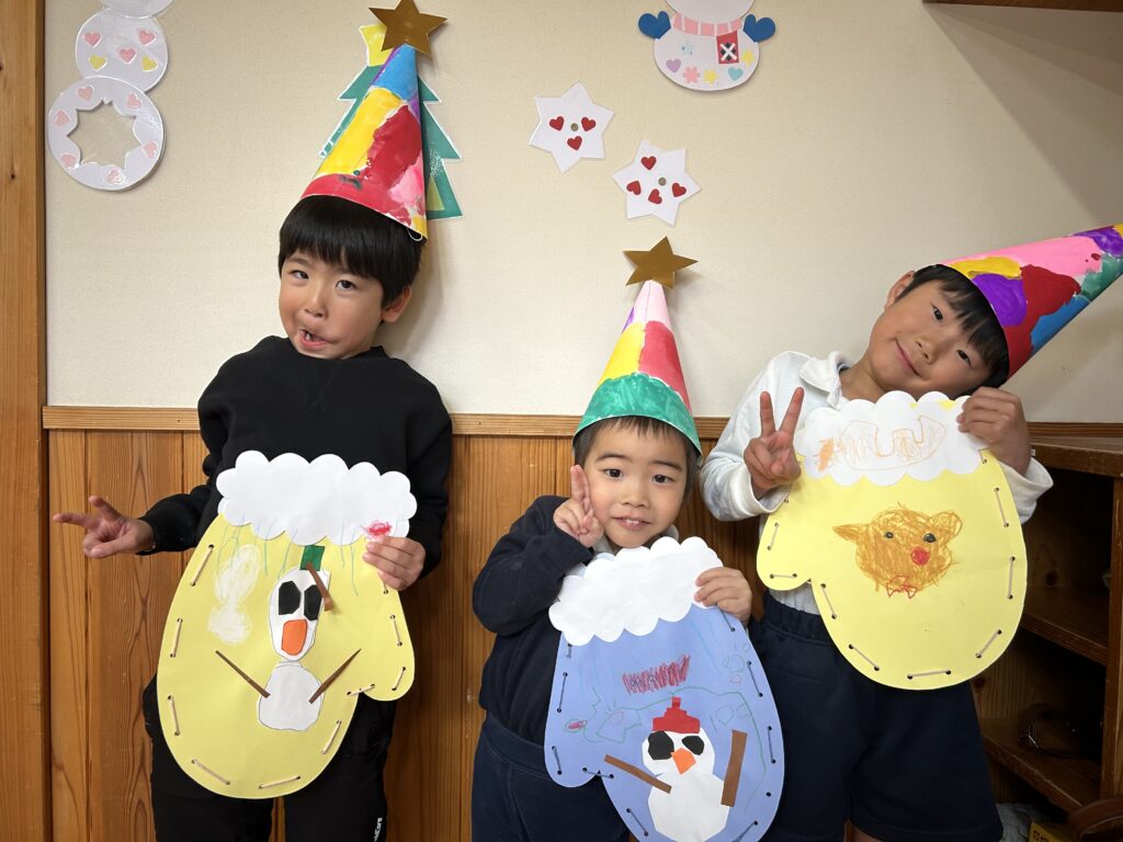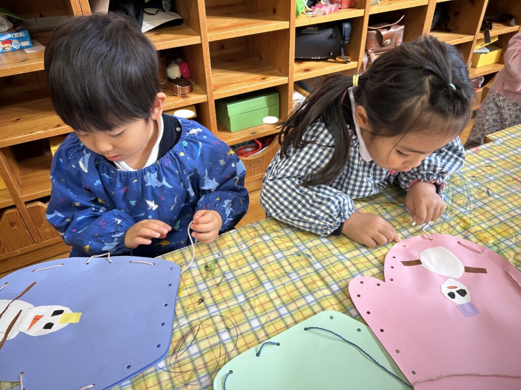 プレゼント入れは、紐通しをして、画用紙を使い、雪だるまやトナカイの飾り付けをしました。パーツを一つずつ書いてはさみで切るのは少し難しかったけれど、組み合わせてみると少し大きいな、小さいなと気がつき「目をもう少し小さくしよう!」と考えて楽しみながら行う姿も見られました。