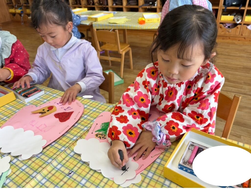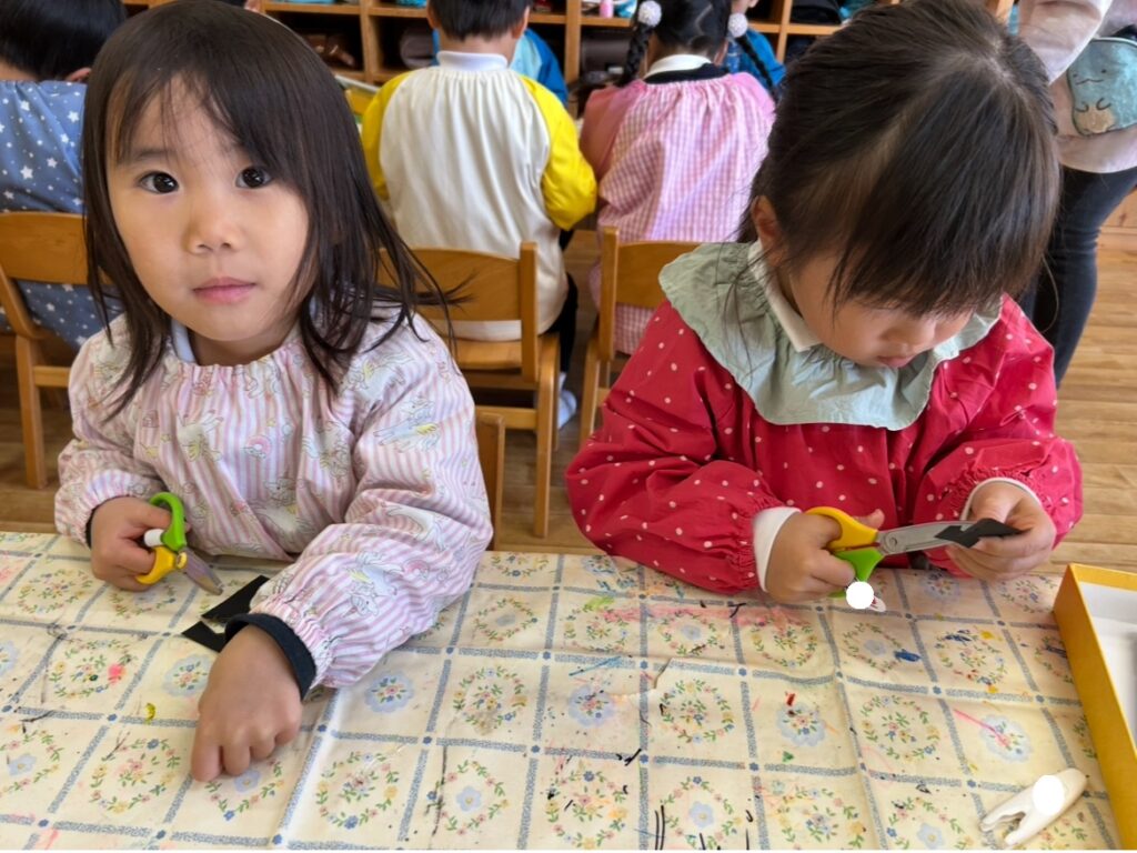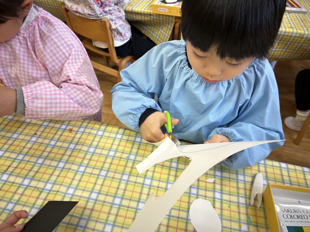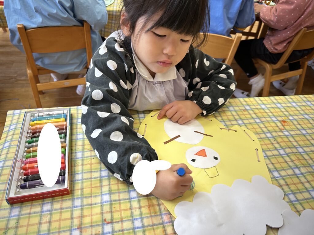 プレゼント入れは、紐通しをして、画用紙を使い、雪だるまやトナカイの飾り付けをしました。パーツを一つずつ書いてはさみで切るのは少し難しかったけれど、組み合わせてみると少し大きいな、小さいなと気がつき「目をもう少し小さくしよう!」と考えて楽しみながら行う姿も見られました。