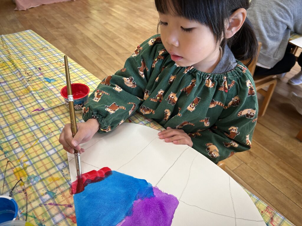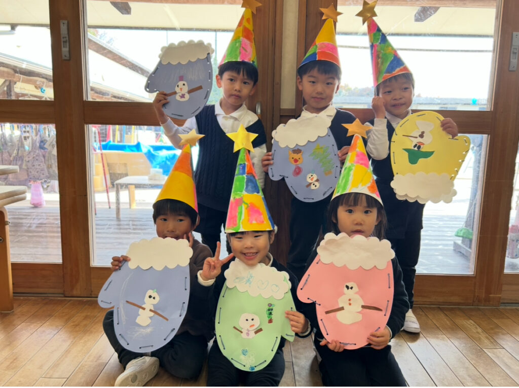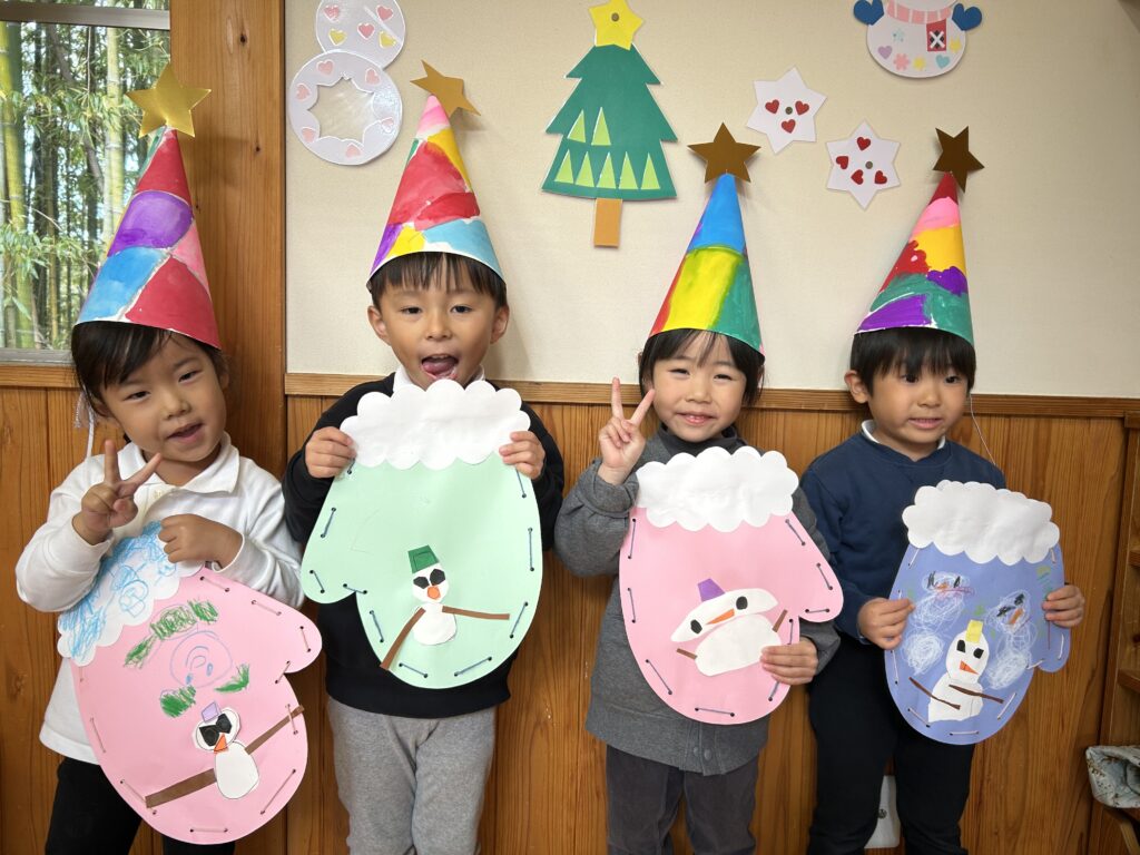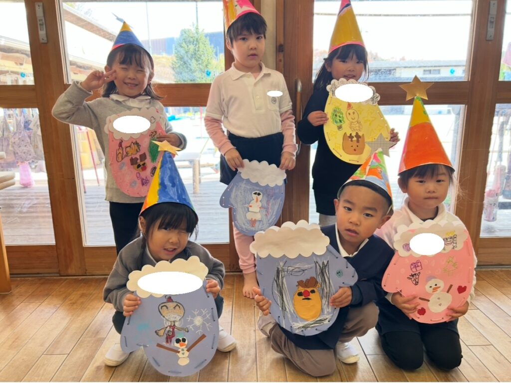 帽子は、クレヨンと絵の具ではじき絵をし、ステンドグラス風にカラフルで華やかな帽子になりました。帽子のてっぺんには星をつけ、クリスマスツリーにも見えます🎄製作した帽子は、クリスマス会に被って参加をします!