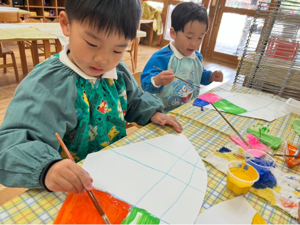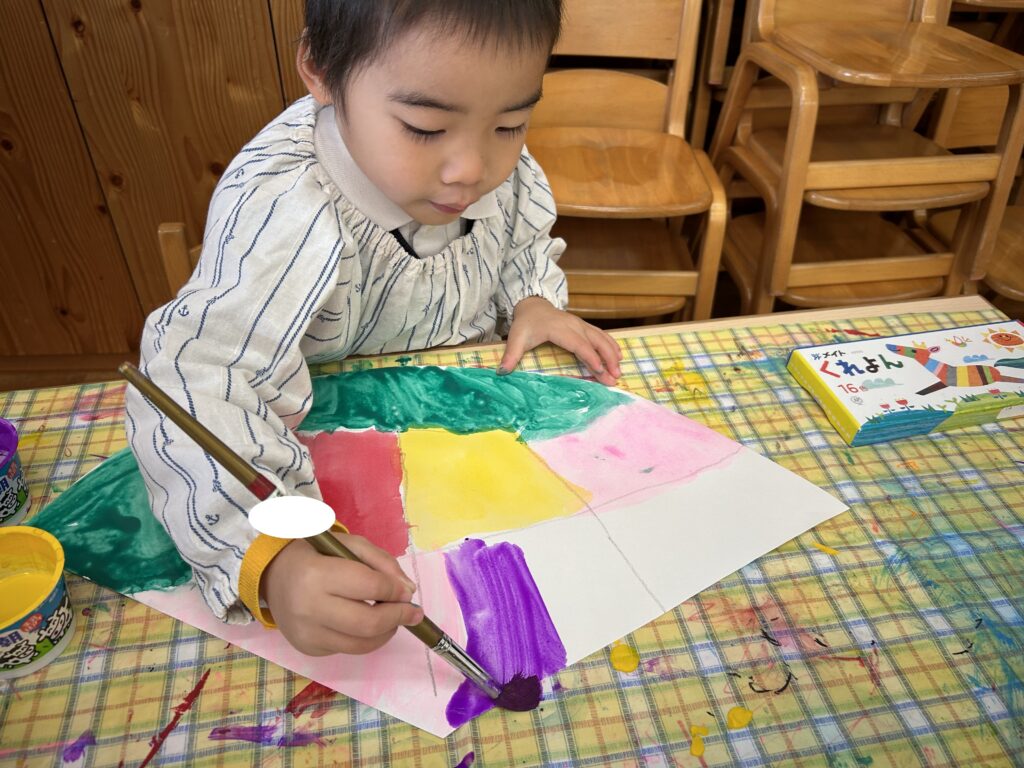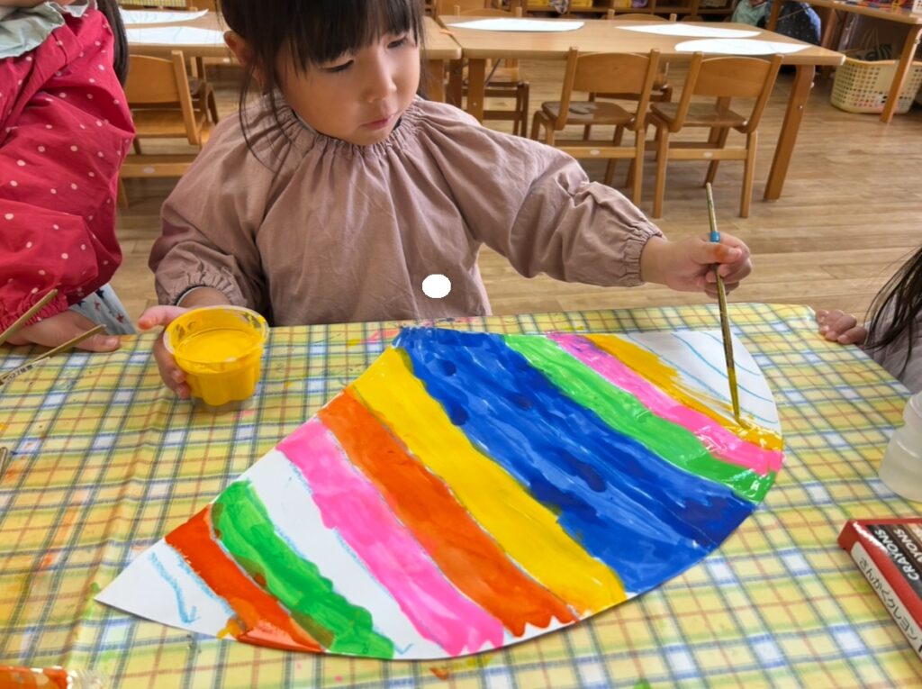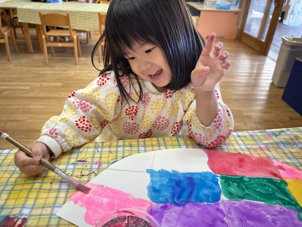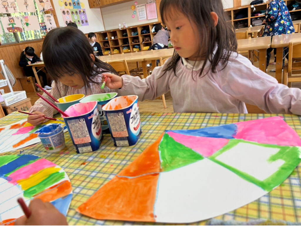 帽子は、クレヨンと絵の具ではじき絵をし、ステンドグラス風にカラフルで華やかな帽子になりました。帽子のてっぺんには星をつけ、クリスマスツリーにも見えます🎄製作した帽子は、クリスマス会に被って参加をします!