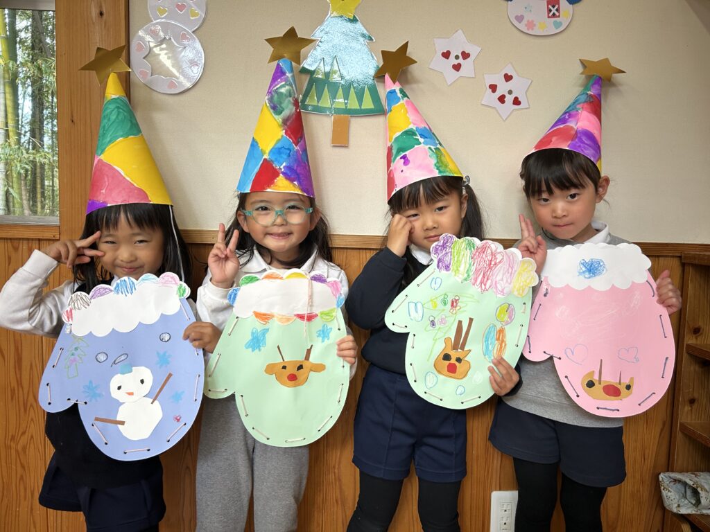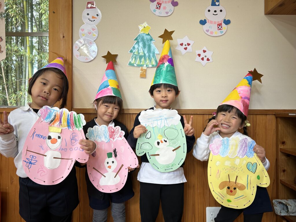 明日はいよいよクリスマス会! 年中組では、帽子と手袋型のプレゼント入れを製作しました。