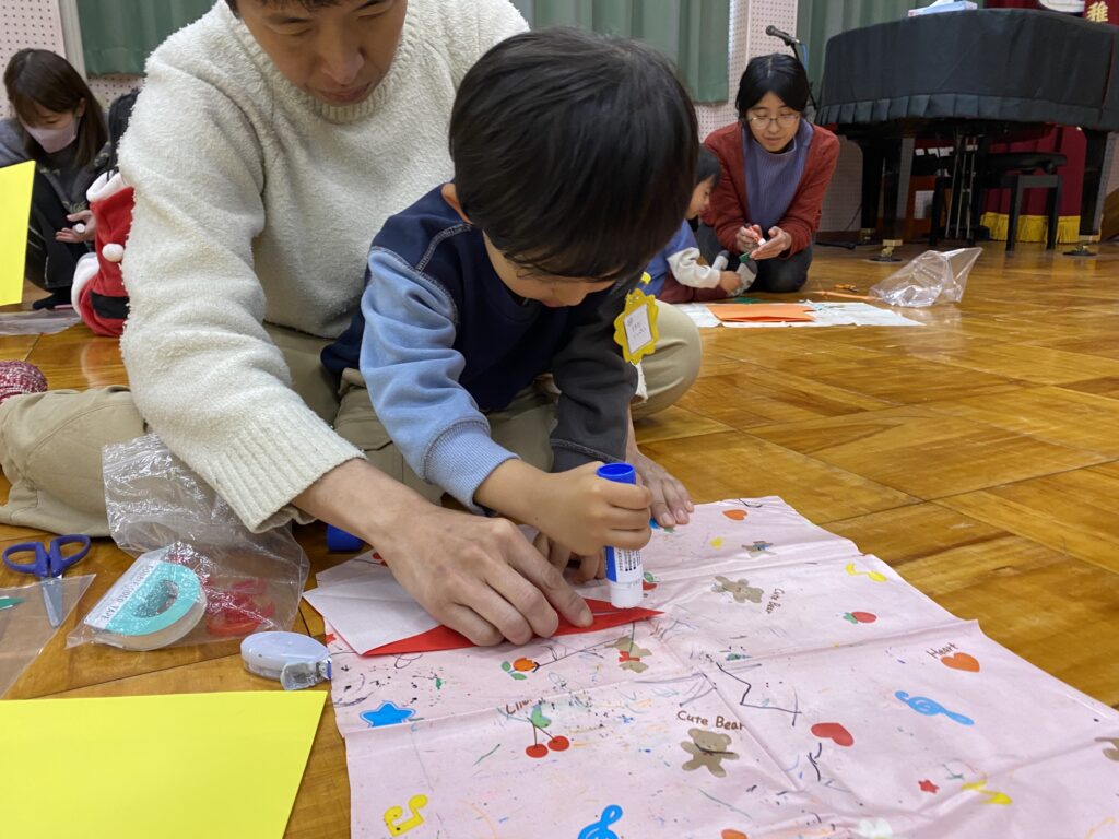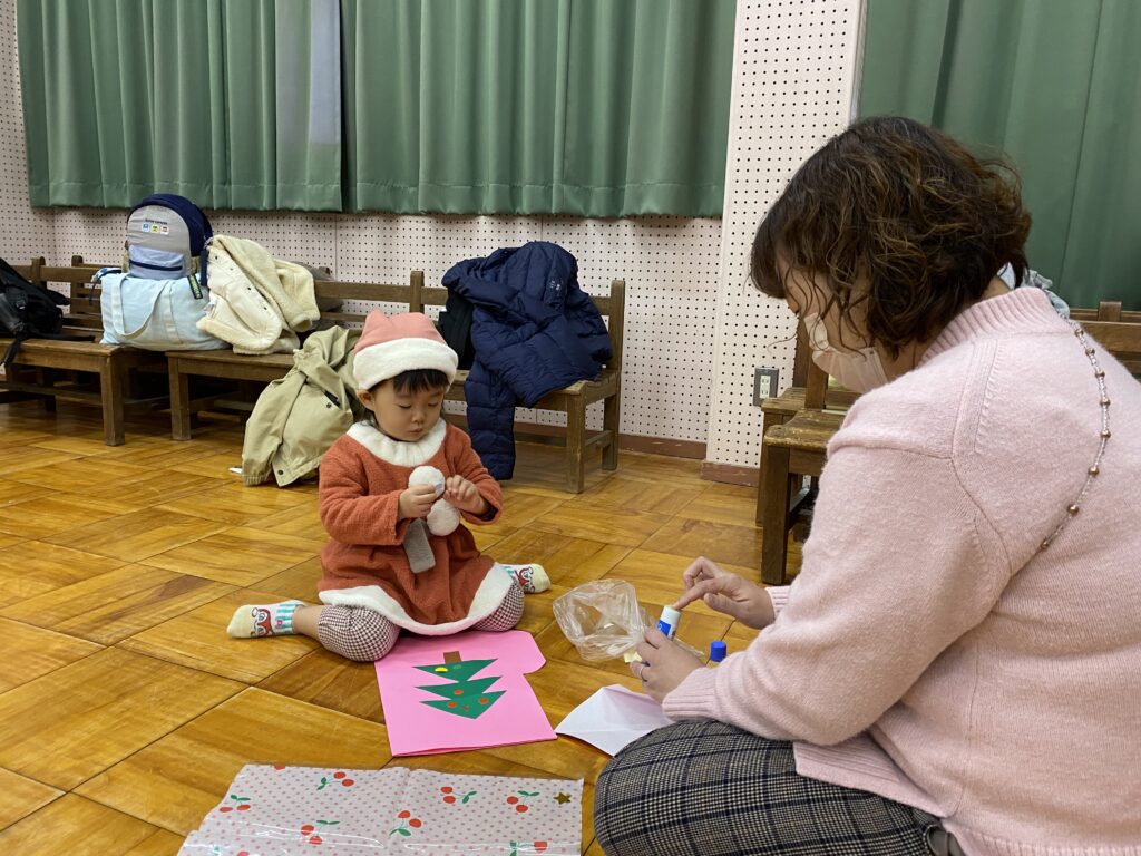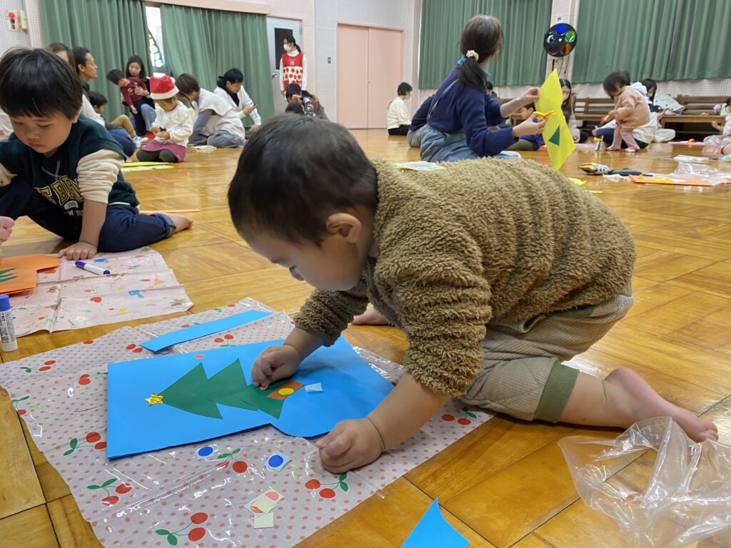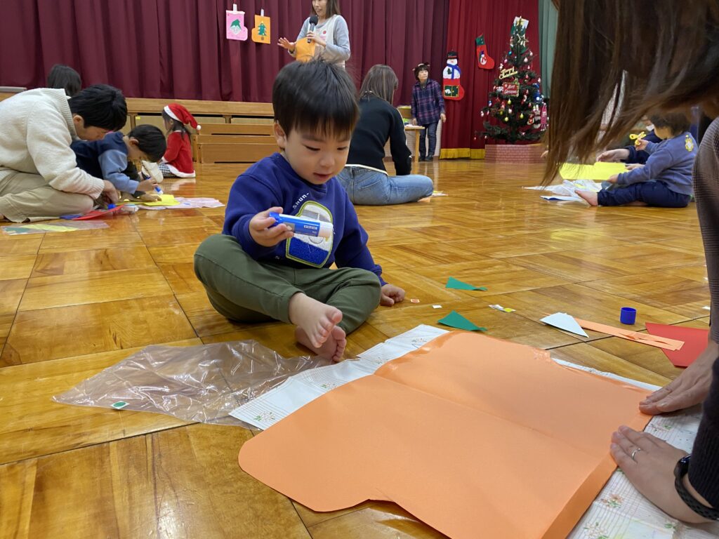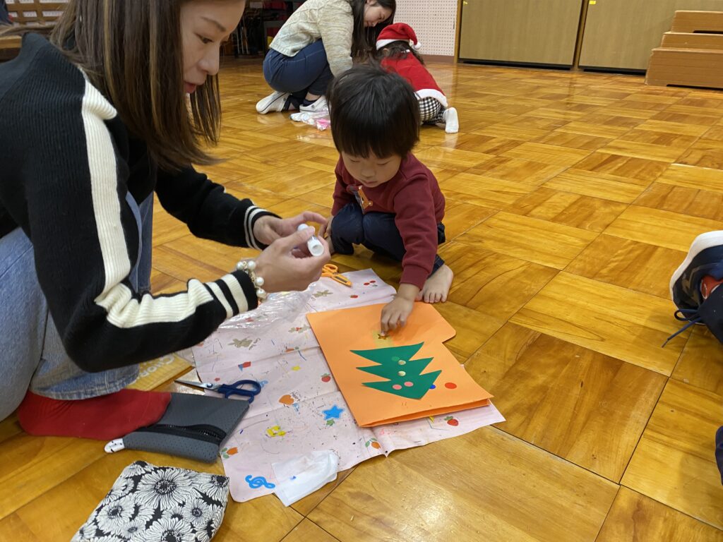プレゼントをもらえるように親子でブーツを作りました♪ブーツやサンタさんの折り紙を好きな色を選んで、お母さんやお父さんと一緒にハサミやのりを使って作ります。ブーツの形になるように線に沿って画用紙を切ったり、サンタさんを折り紙で作ってツリーの葉や飾りのシールを貼ってツリーを飾り付けたりとやることたくさん!だけどプレゼントをもらえるように頑張りました!