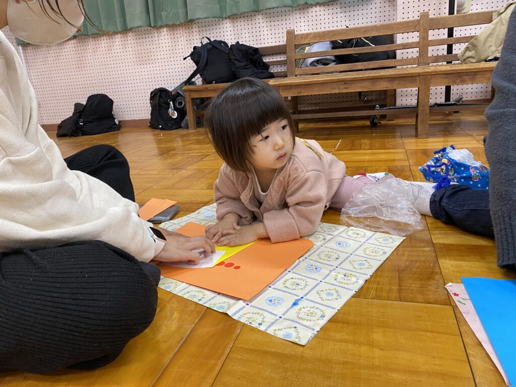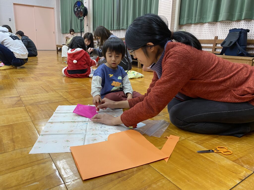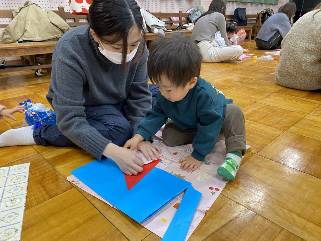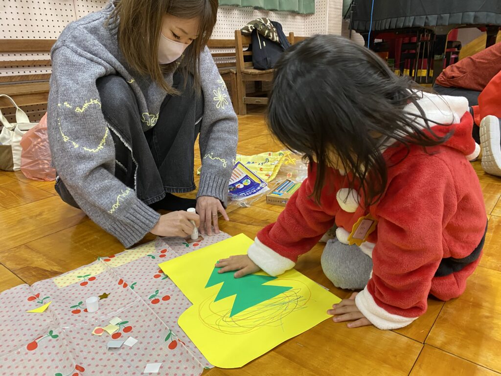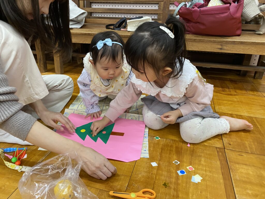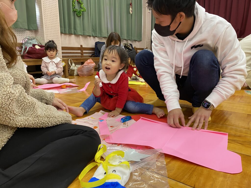 プレゼントをもらえるように親子でブーツを作りました♪ブーツやサンタさんの折り紙を好きな色を選んで、お母さんやお父さんと一緒にハサミやのりを使って作ります。ブーツの形になるように線に沿って画用紙を切ったり、サンタさんを折り紙で作ってツリーの葉や飾りのシールを貼ってツリーを飾り付けたりとやることたくさん!だけどプレゼントをもらえるように頑張りました!