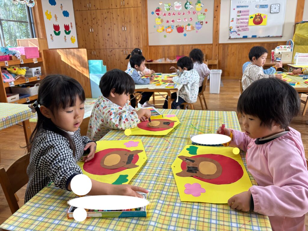 折り紙をちぎり馬の髪の毛にしたり、クレヨンで顔を描いたりしました。いろいろな表情をした馬が完成しました。