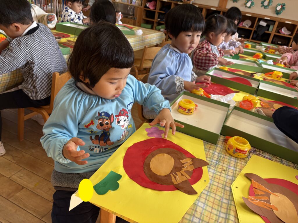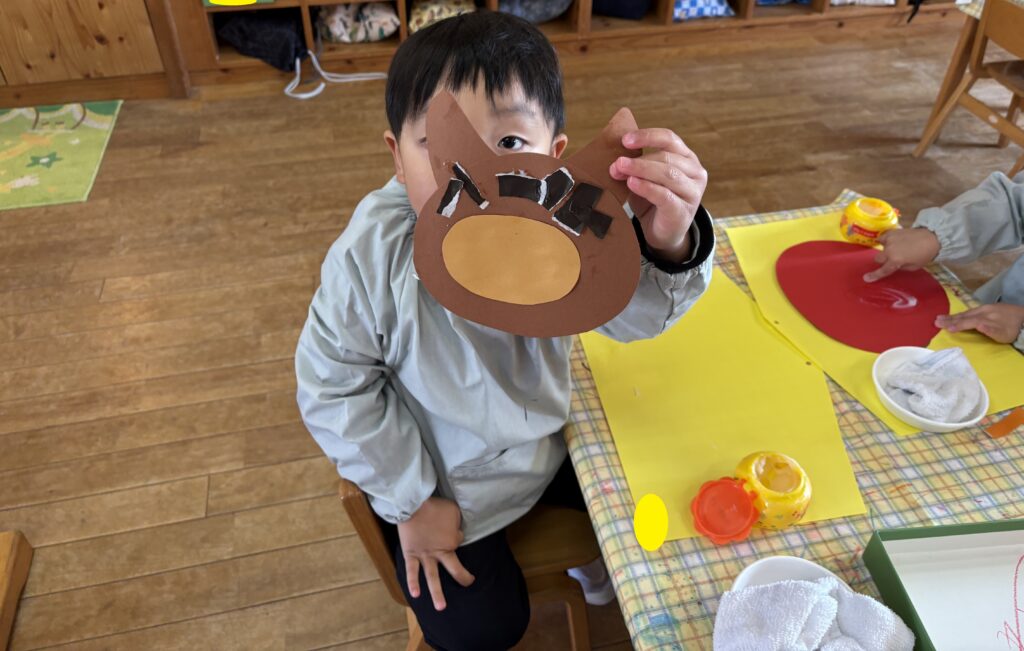 折り紙をちぎり馬の髪の毛にしたり、クレヨンで顔を描いたりしました。いろいろな表情をした馬が完成しました。