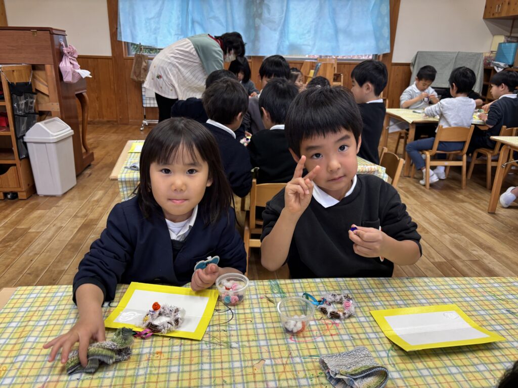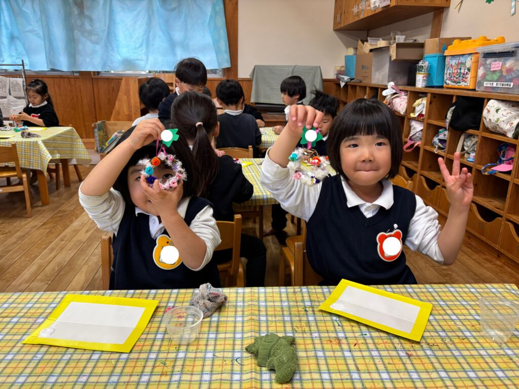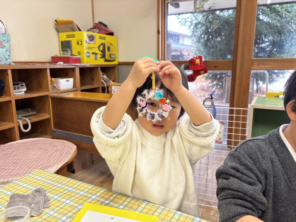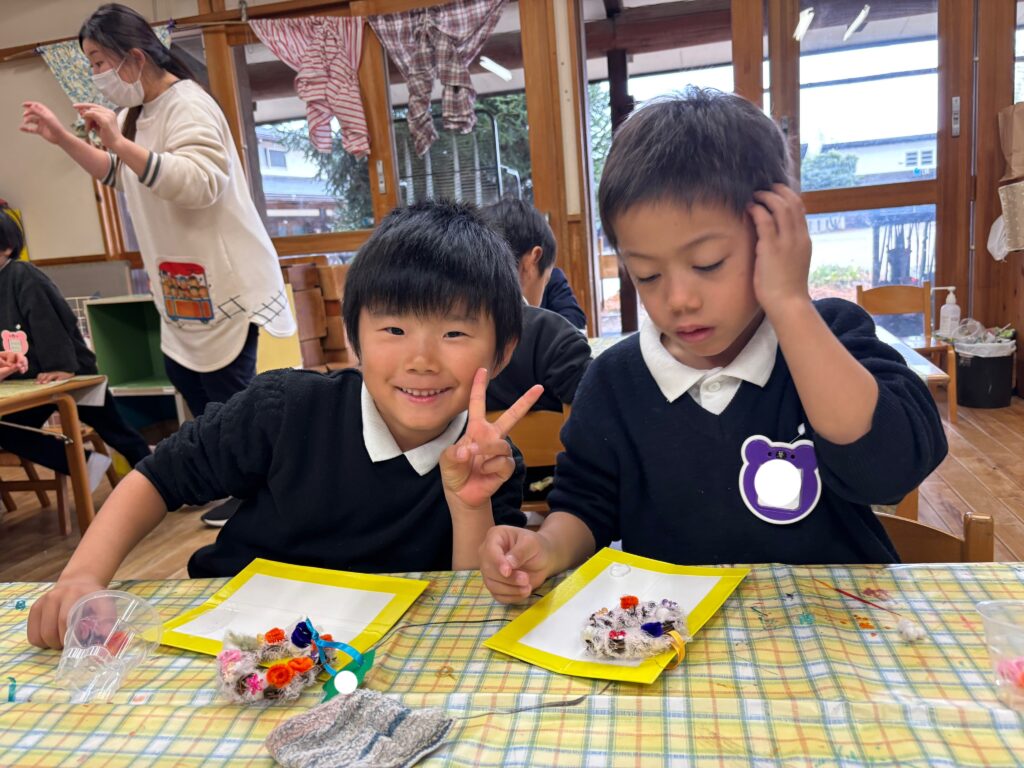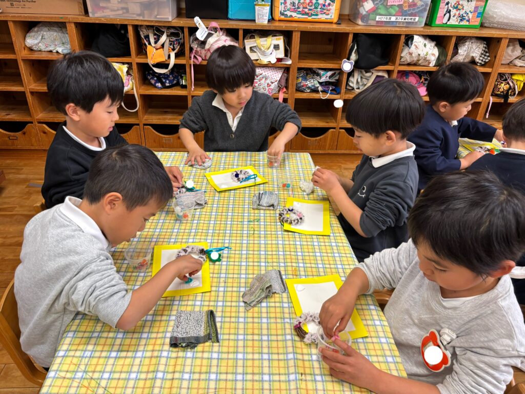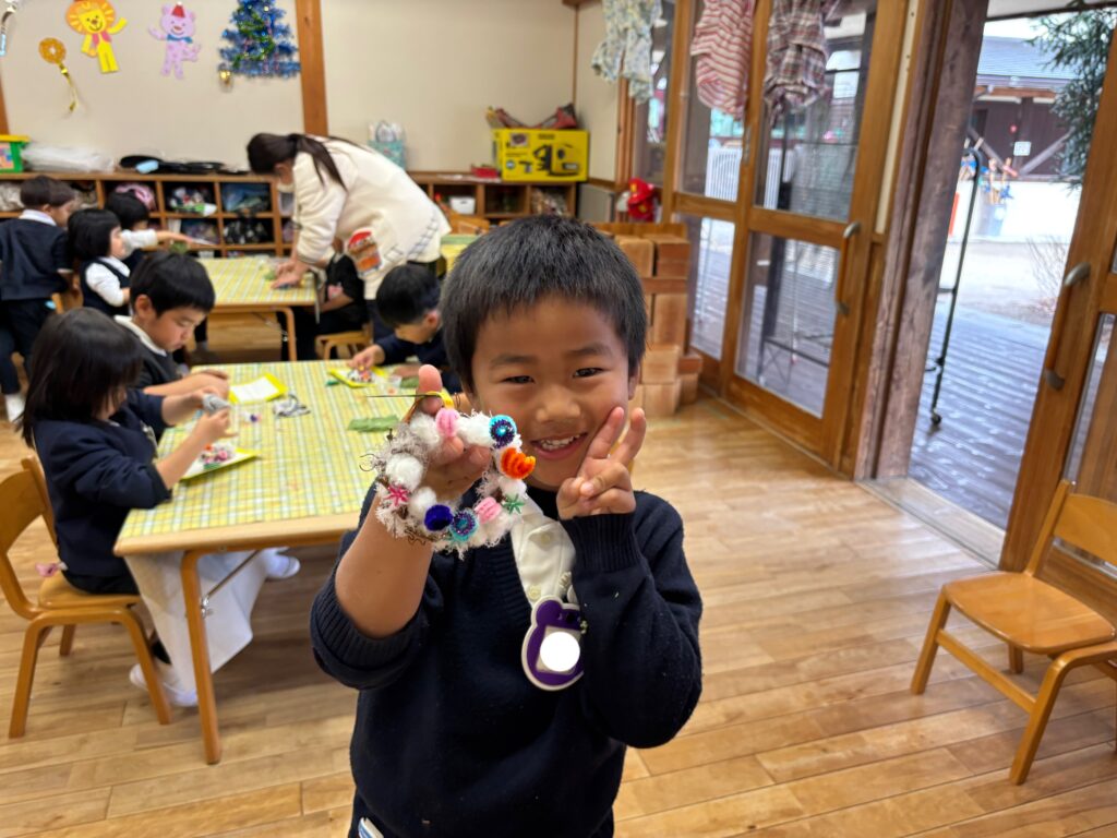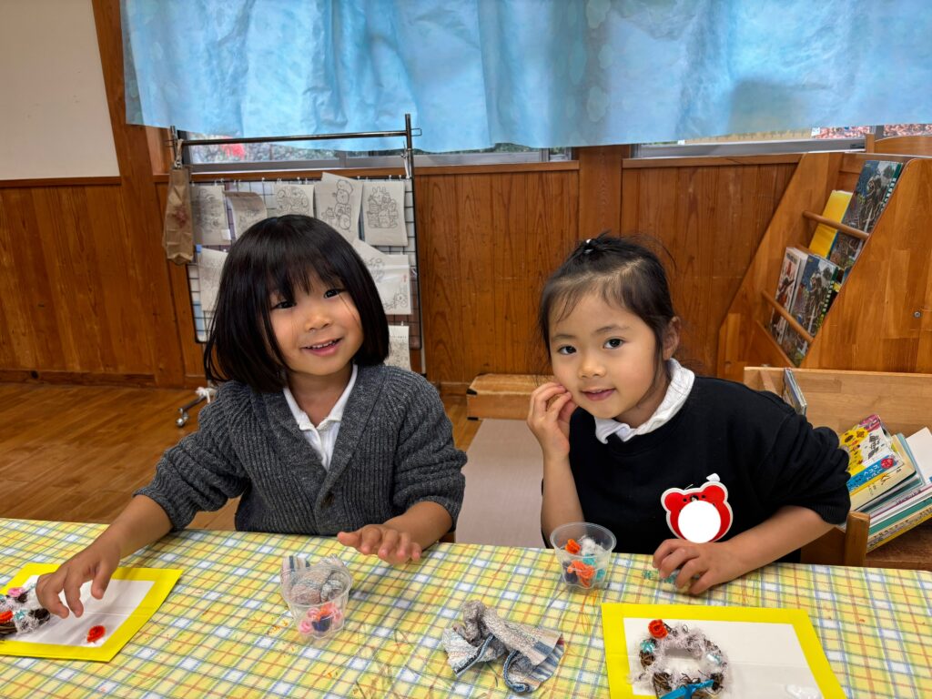 今日は、クリスマス・イブなのでクリスマスのリースを作りました。ボンドを使って、リースにモールやビーズをつけました。「先生見て!これはね、かき氷クリスマスなんだよ!」「もっとたくさん作りたい!」と、楽しみながら友達と一緒に作ることを楽しんでいました。