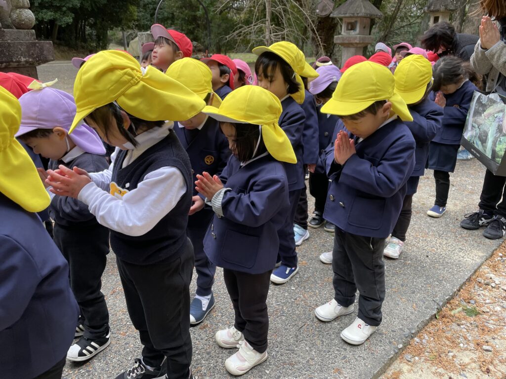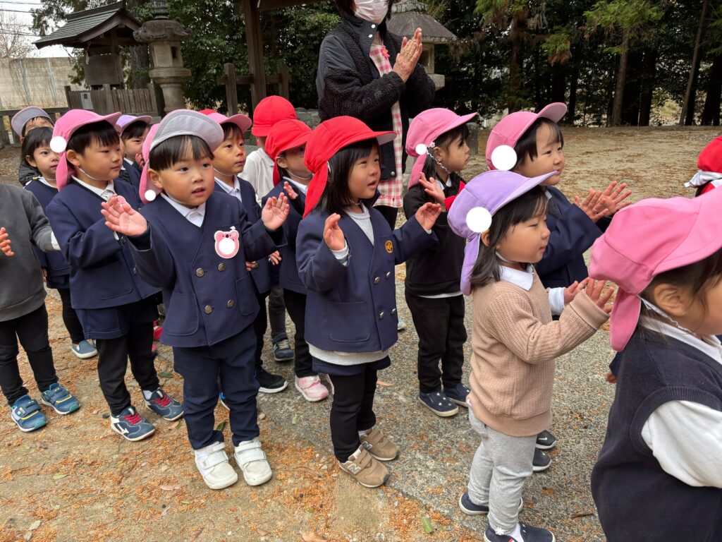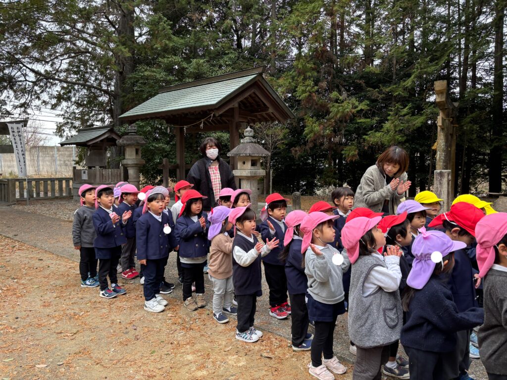 今日は、幼稚園の近くにある八柱神社へ初詣に出かけました。手を合わせて目を閉じながら、「みんなが元気に過ごせますように!」と、神様に向かってお祈りをしました。