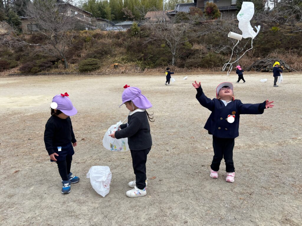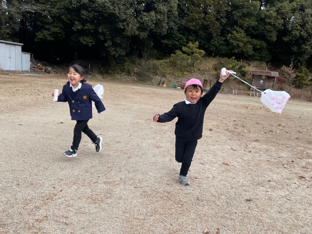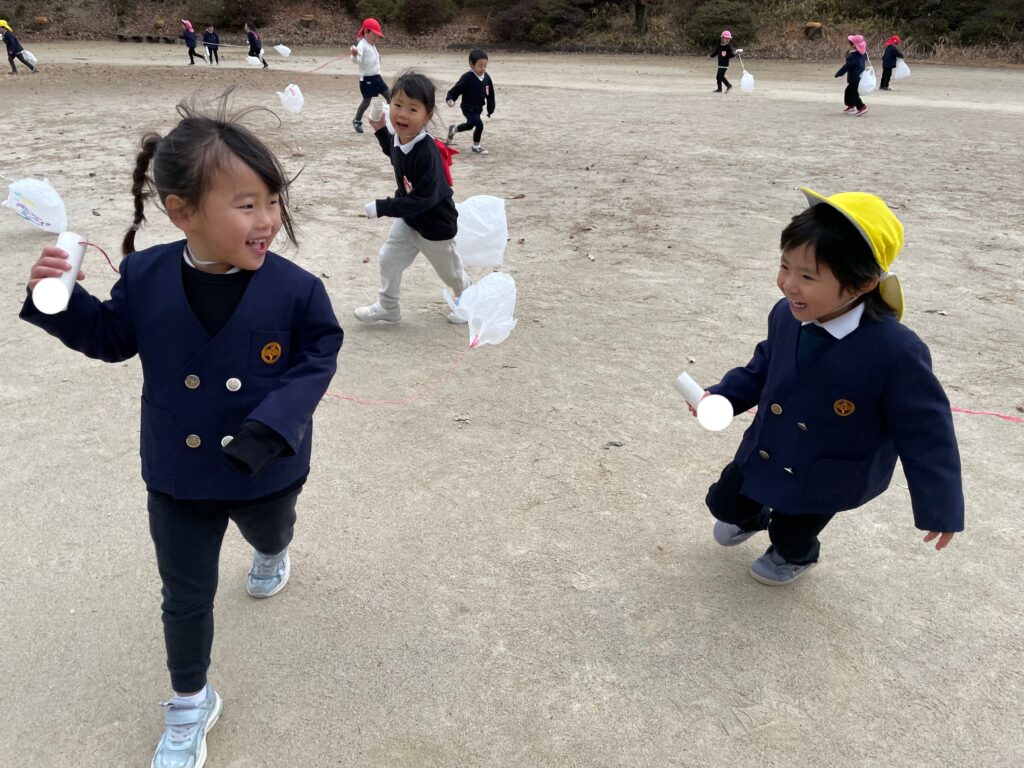 初詣の後は、近くにある公園に移動しました。自分で作った凧をもって、広い公園で思いっきり体を動かして遊びました。たくさん遊んで疲れたら、凧を投げてキャッチするという”キャッチゲーム”を行いました。なかなかキャッチすることが難しく、苦戦していました。できたときには、「先生!できたー!」と、嬉しそうにしていました。