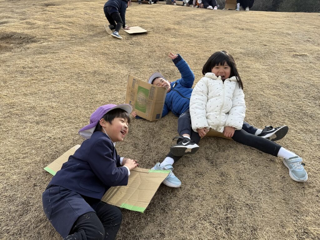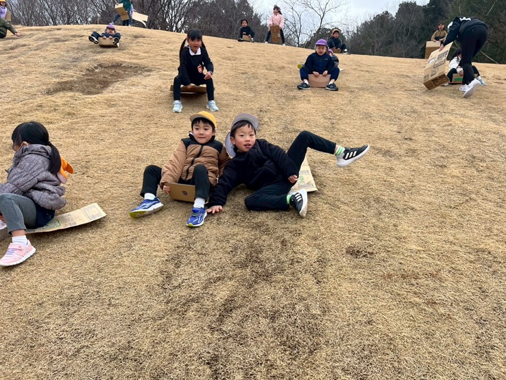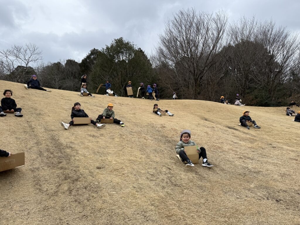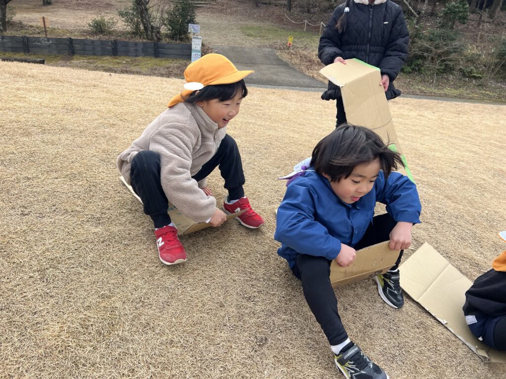 「ここはよく滑りそうだ!」「こうするとスピードが出るよ!」など、考えながら楽しく滑りました!!なかなか最初はうまくバランスが取れず、芝の上を転がる子もいましたが、段々とコツを掴んでいるようで、かっこよく滑れる子もいました☆彡