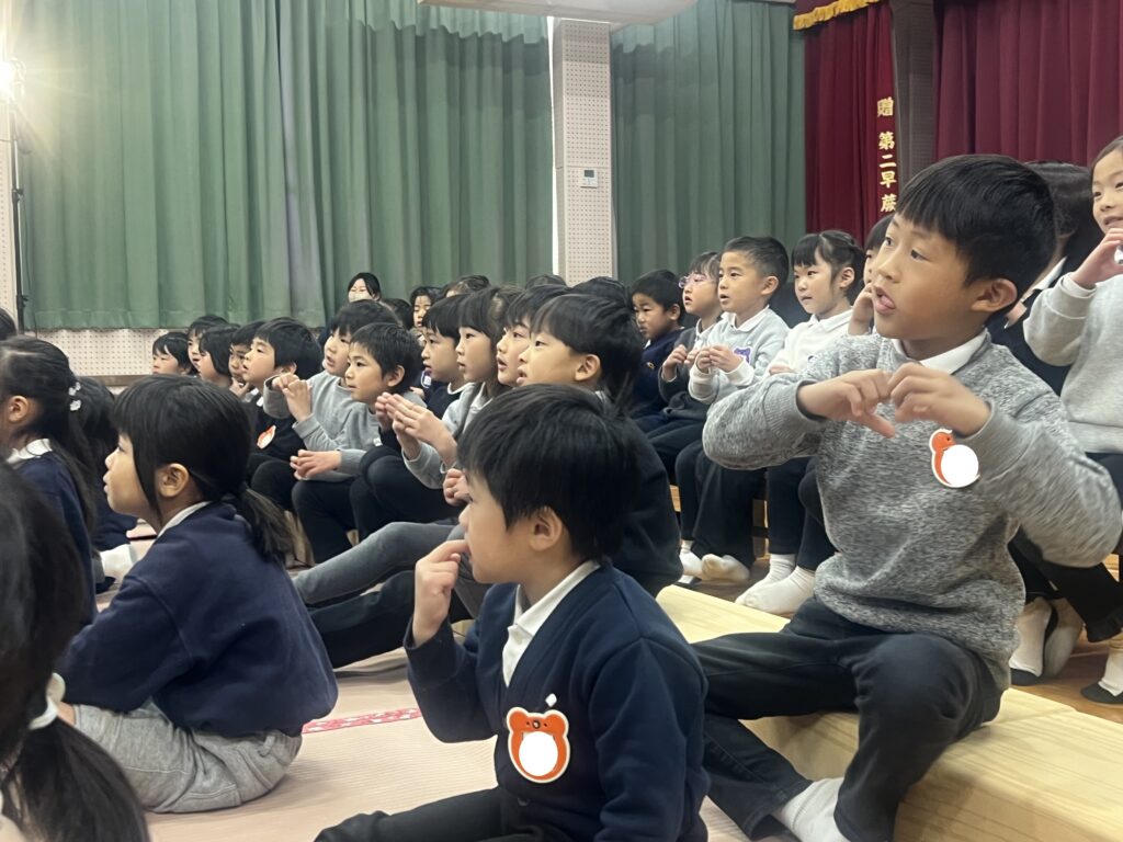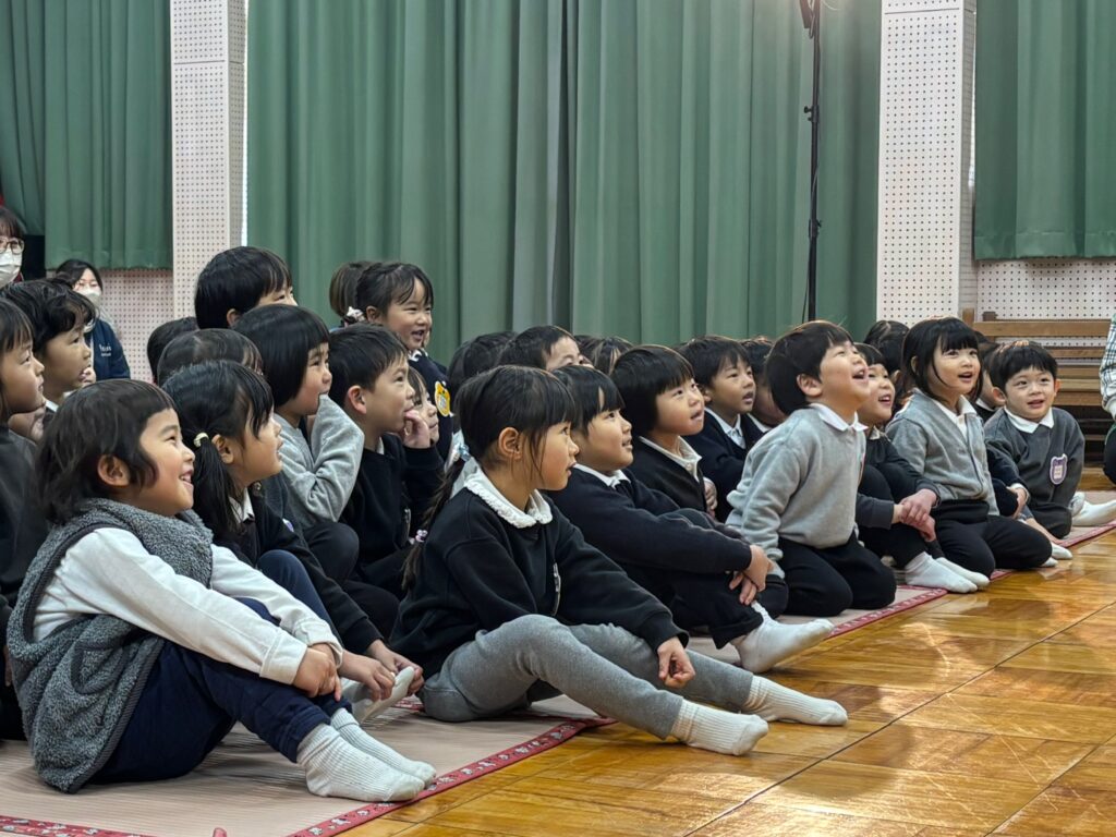「空とぶふわふわパン」では、森の中にすんでいるあずきちゃんがおつかいに行く途中で、おなかをすかせたおおかみさんが、郵便屋さんや占い師に変装して… とってもリズミカルで、子どもたちは大笑い!!最後には大きなふわふわパンも!とっても面白かったね!