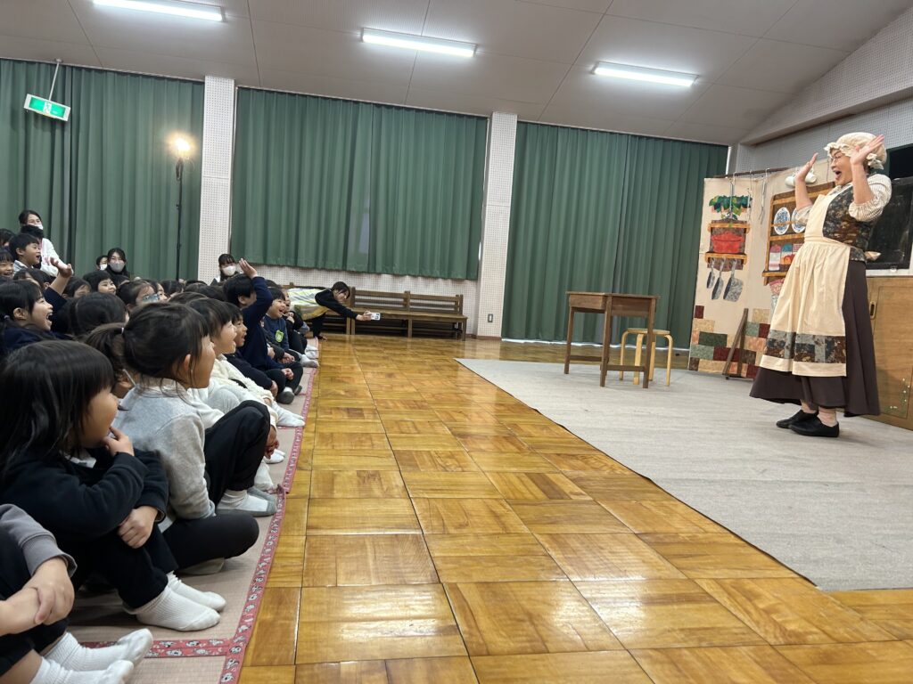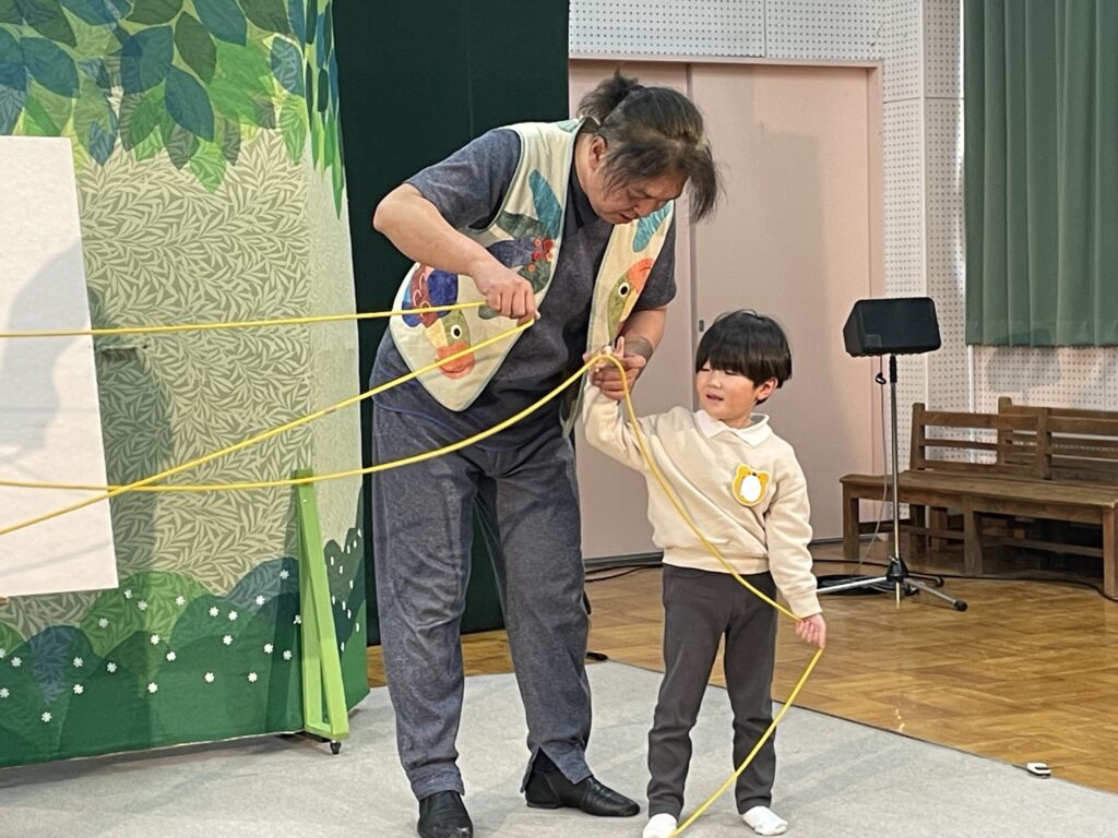 「空とぶふわふわパン」では、森の中にすんでいるあずきちゃんがおつかいに行く途中で、おなかをすかせたおおかみさんが、郵便屋さんや占い師に変装して… とってもリズミカルで、子どもたちは大笑い!!最後には大きなふわふわパンも!とっても面白かったね!