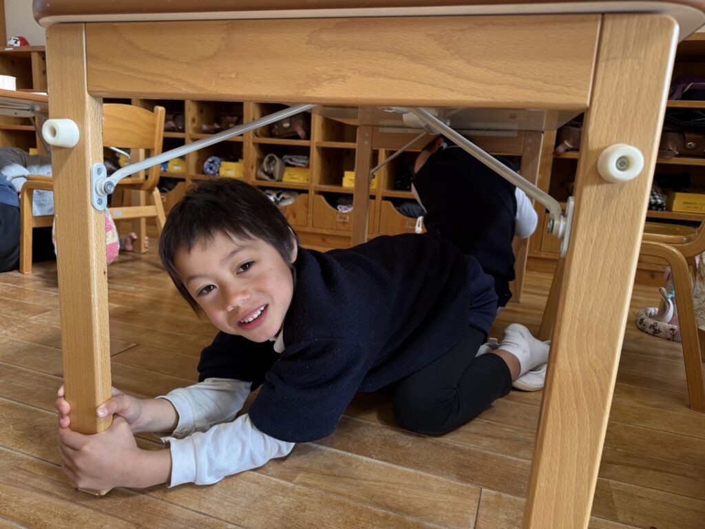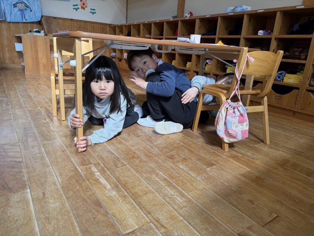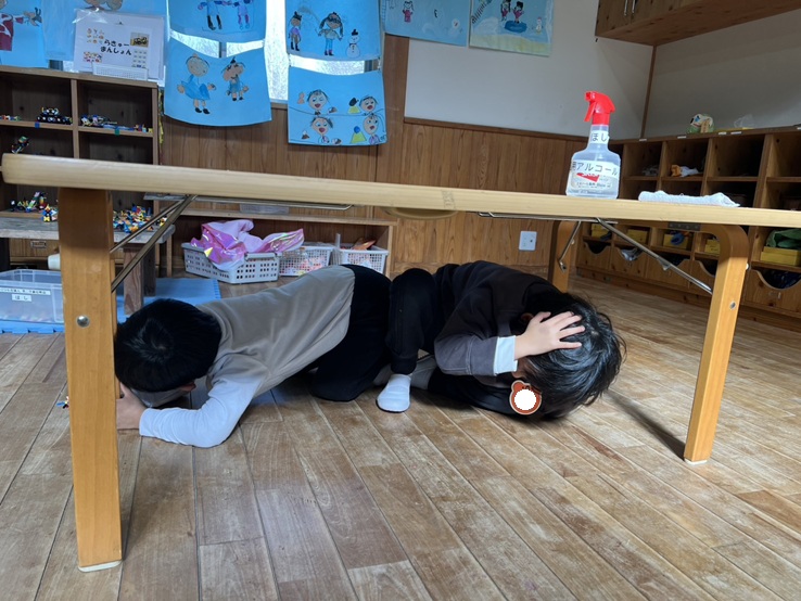 外で遊んでいた子、室内で製作をしていた子、トイレにいた子など様々でしたが、近くの先生の話を聞いて落ち着いて避難することができました!