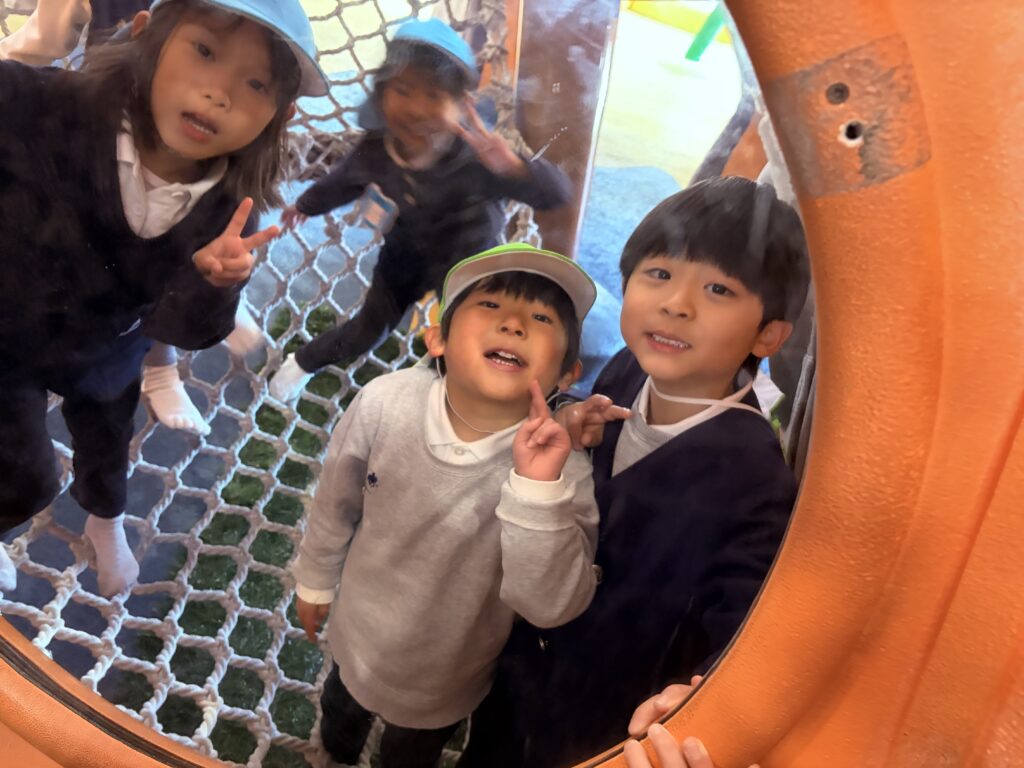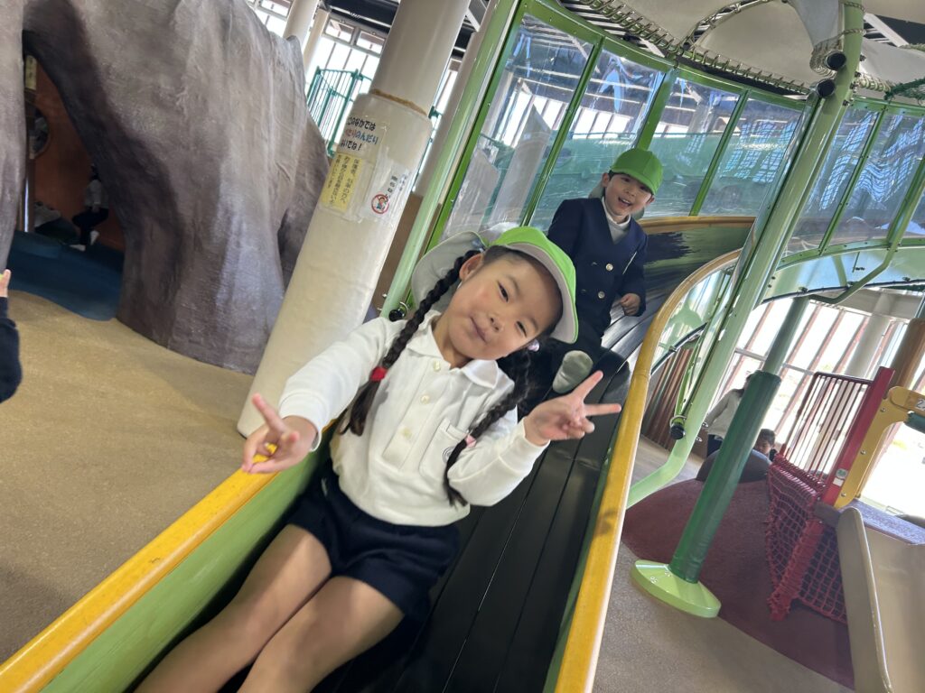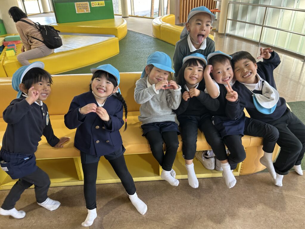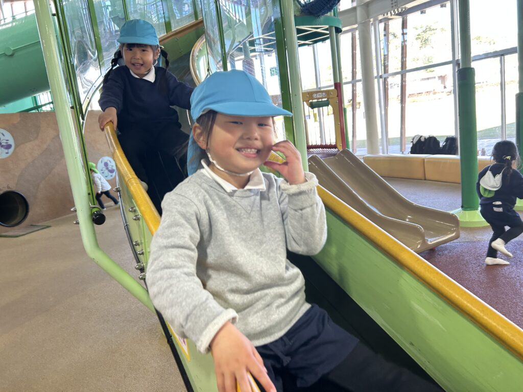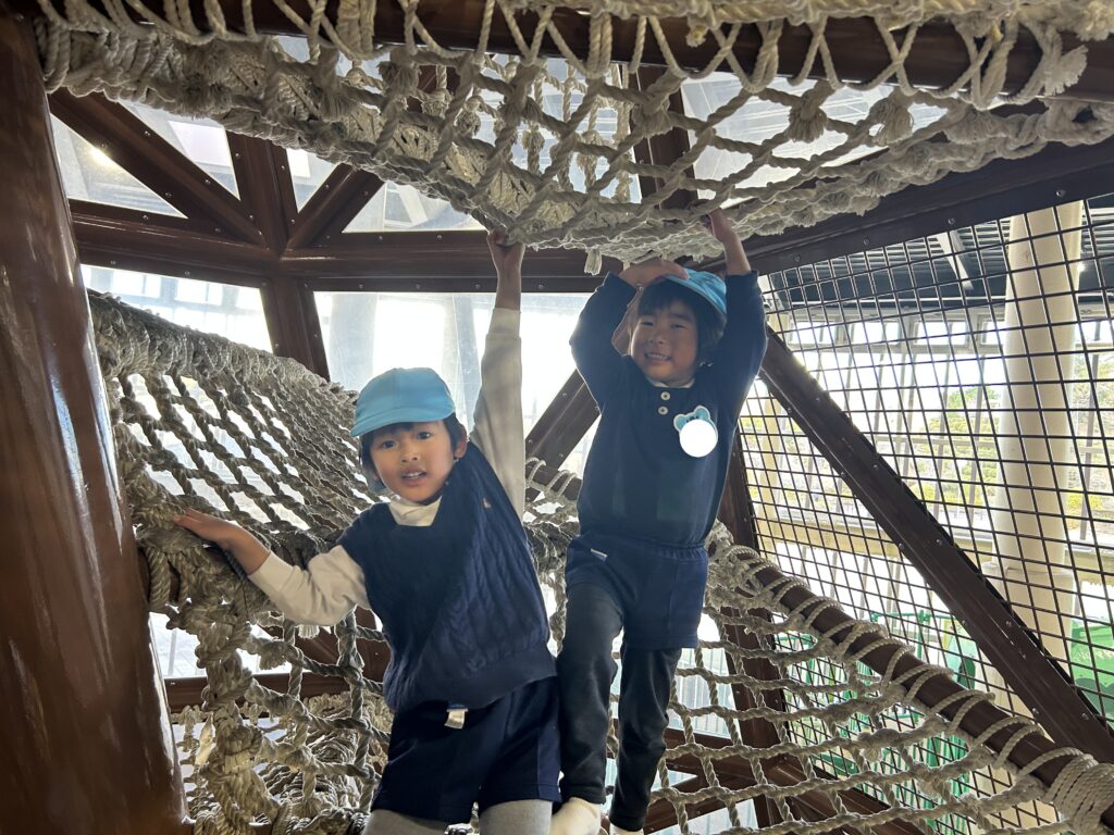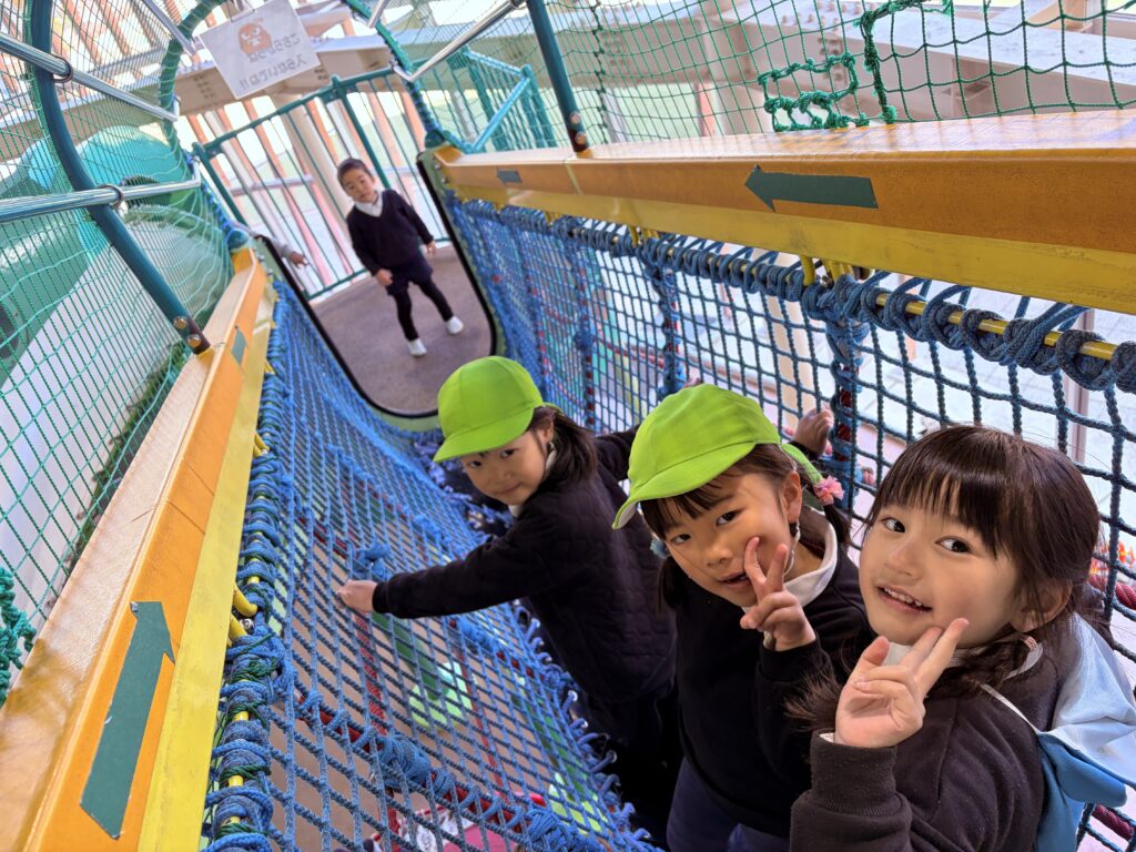 今日は風が強い日でしたが、鞍ヶ池公園の外の広場で、みんなで一緒に弁当を食べてから、室内遊具でたくさん遊びました。友達と一緒に笑い合いながら遊ぶ姿から、年中組で過ごした一年の成長も感じることができました。