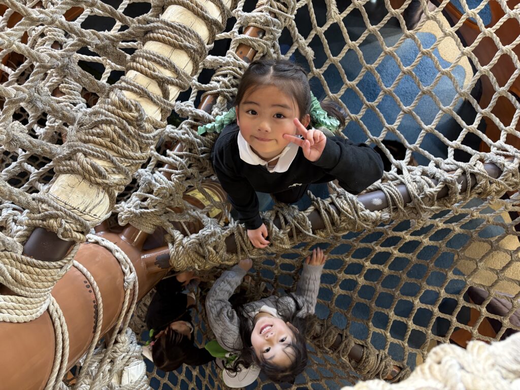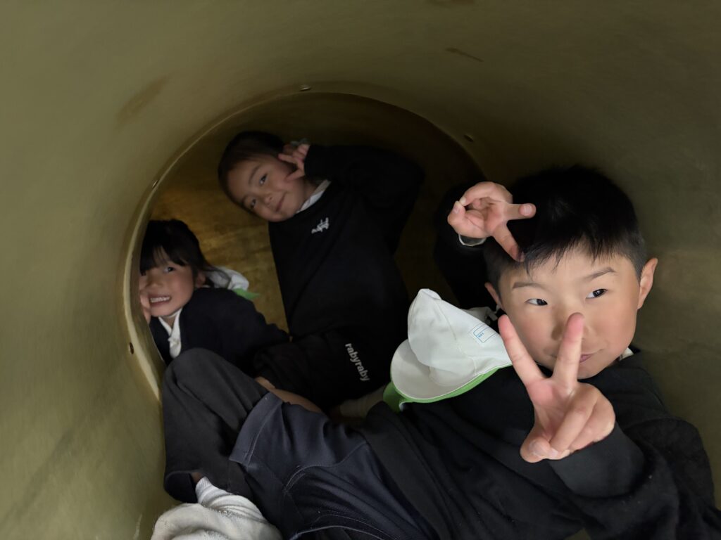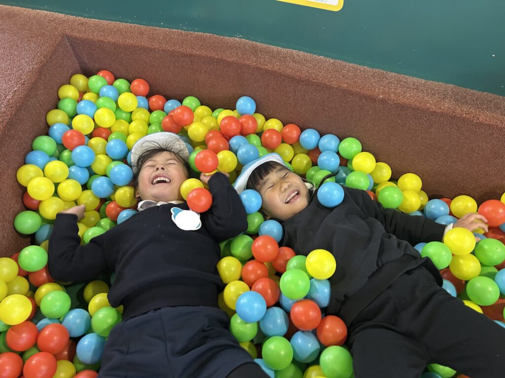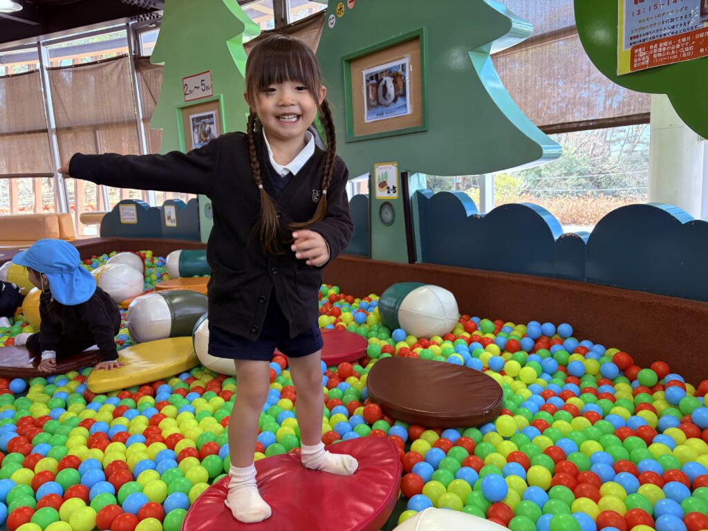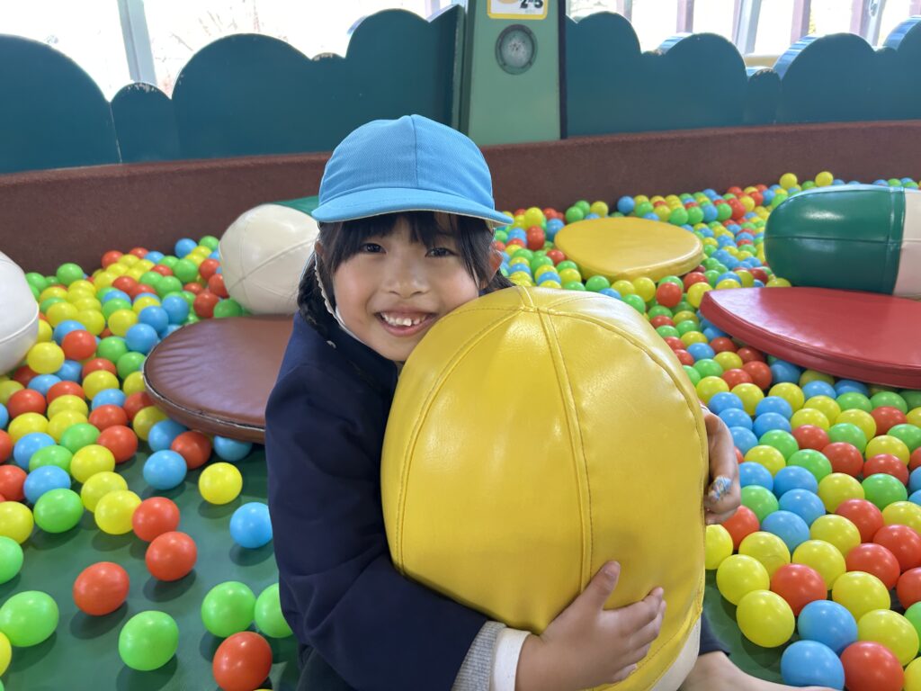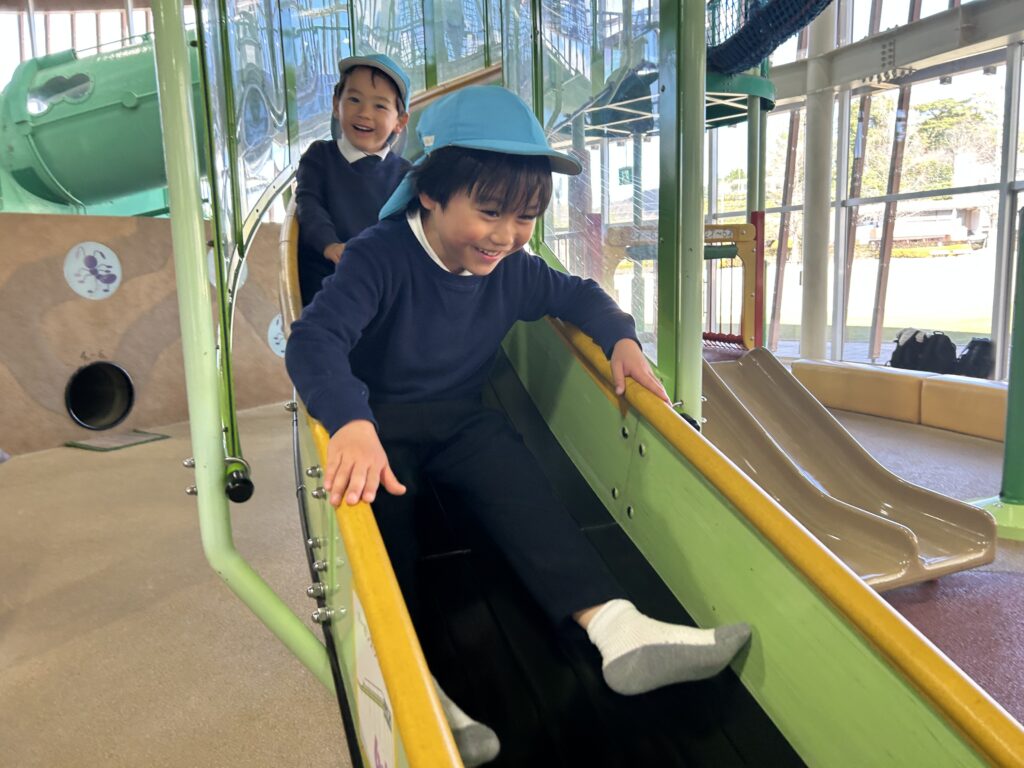 今日は風が強い日でしたが、鞍ヶ池公園の外の広場で、みんなで一緒に弁当を食べてから、室内遊具でたくさん遊びました。友達と一緒に笑い合いながら遊ぶ姿から、年中組で過ごした一年の成長も感じることができました。