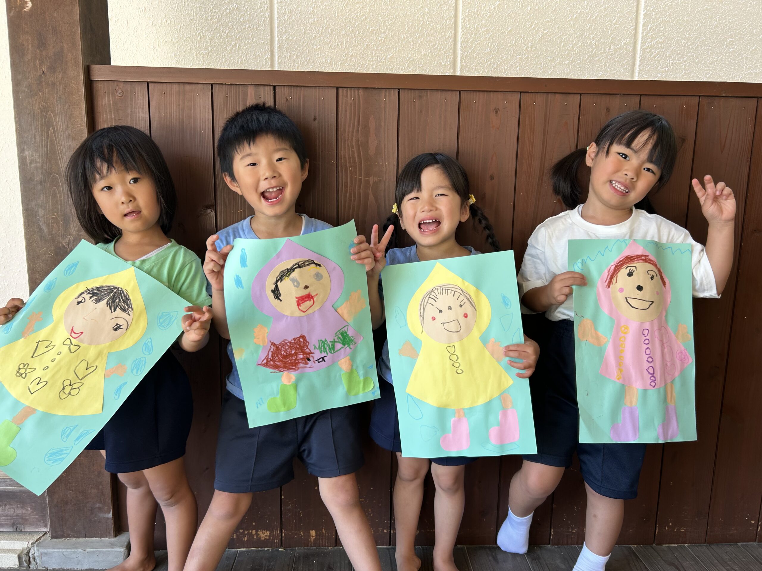梅雨の時期ということで、レインコートの制作をしました! 自分の顔や手、足を描いたり、レインコートに自分の好きな模様や絵を描いたりして、梅雨の時期が楽しくなるような素敵な作品ができあがりました!