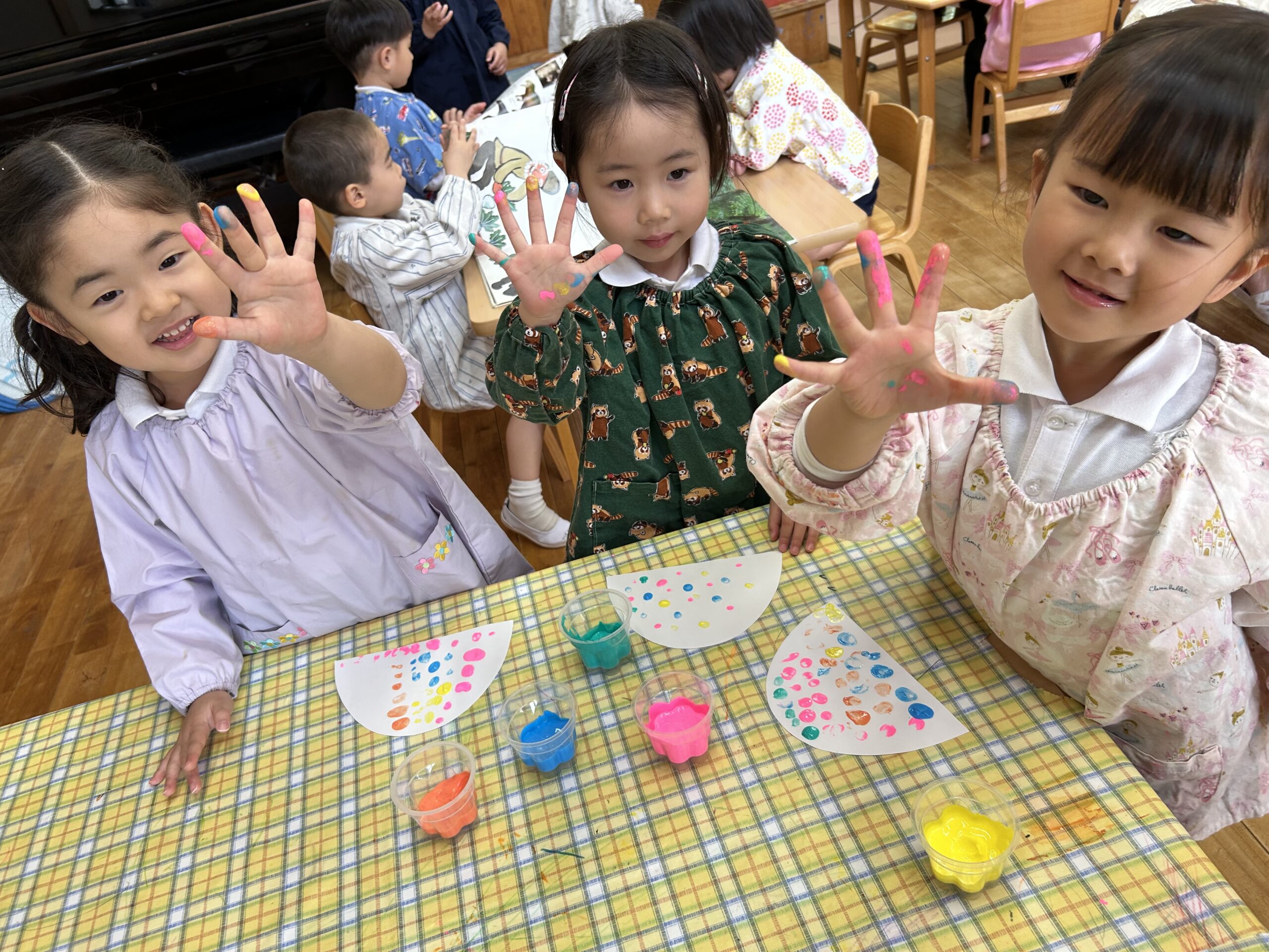 5月5日(月)は子どもの日です。 年中組では、こいのぼりの制作として、指スタンプで絵具遊びをしながら、こいのぼりのうろこを表現して制作を楽しみました(^^♪ 一人ひとりが制作したうろこを大きなこいのぼりに貼り付けて、そ […]
